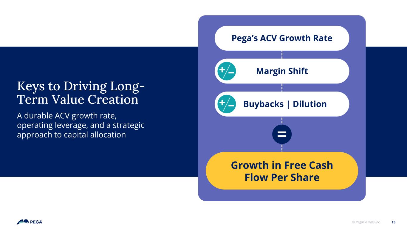 © Pegasystems Inc 14 An Opportunity: Offset Dilution & Reduce Share Count Stock-Based Compensation Free Cash Flow 2022 2023 2024 $0M $50M $100M $150M $200M $250M $300M $350M -$50M $122M $143M $201M $143M $338M ($13M) 2022 2023 2024