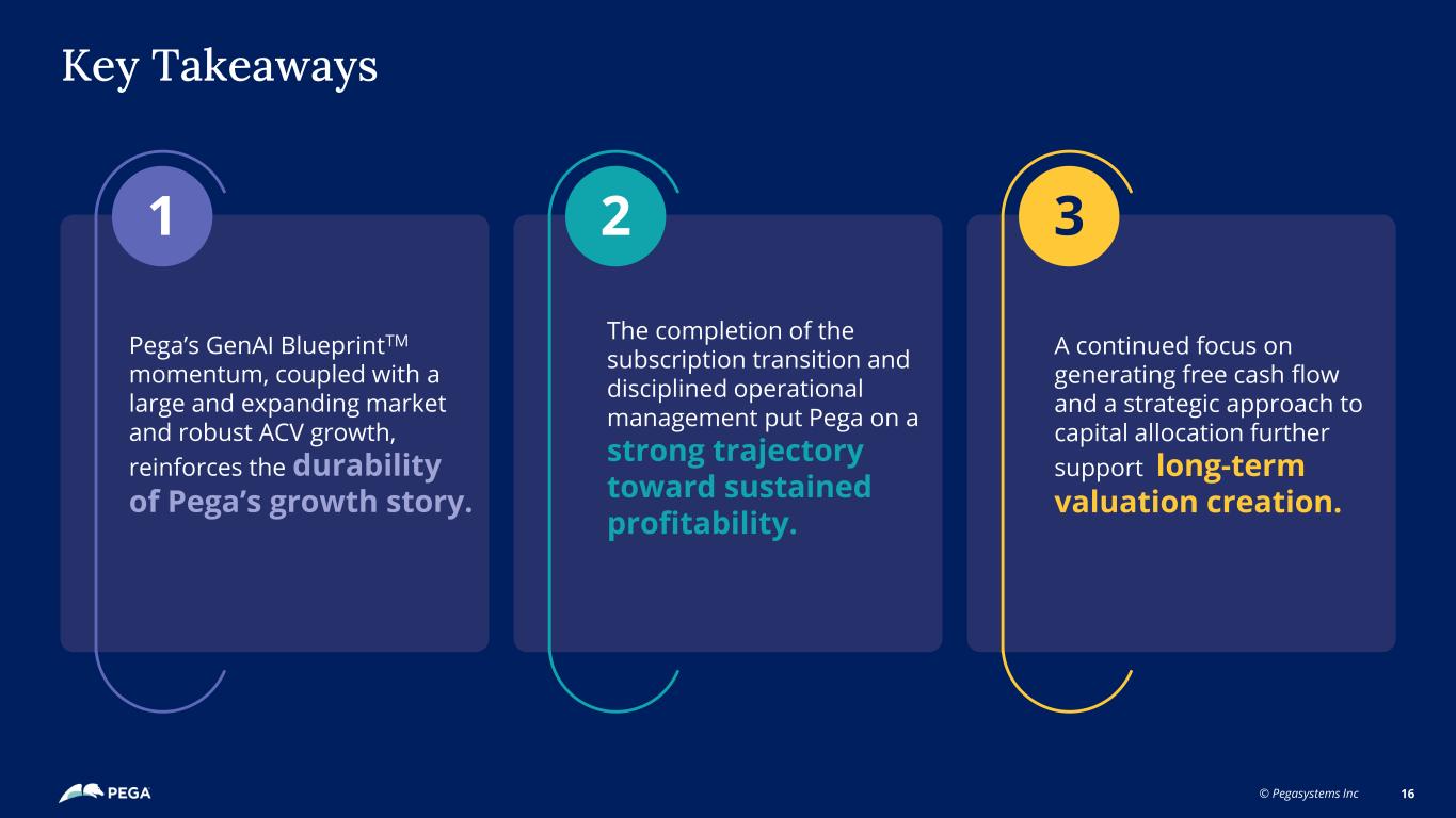© Pegasystems Inc 15 Keys to Driving Long- Term Value Creation A durable ACV growth rate, operating leverage, and a strategic approach to capital allocation Buybacks | Dilution Margin Shift Pega’s ACV Growth Rate Growth in Free Cash Flow Per Share
