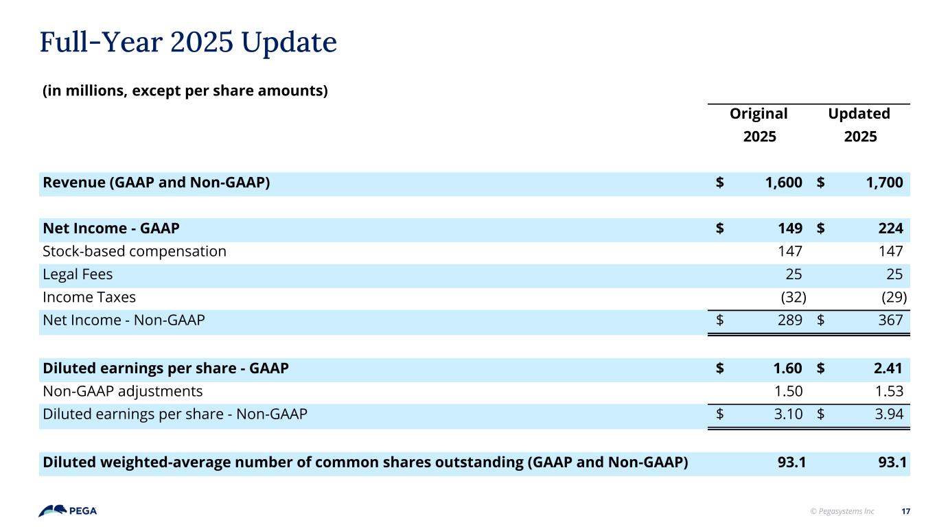 © Pegasystems Inc 16 Key Takeaways Pega’s GenAI BlueprintTM momentum, coupled with a large and expanding market and robust ACV growth, reinforces the durability of Pega’s growth story. The completion of the subscription transition and disciplined operational management put Pega on a strong trajectory toward sustained profitability. A continued focus on generating free cash flow and a strategic approach to capital allocation further support long-term valuation creation. 1 2 3
