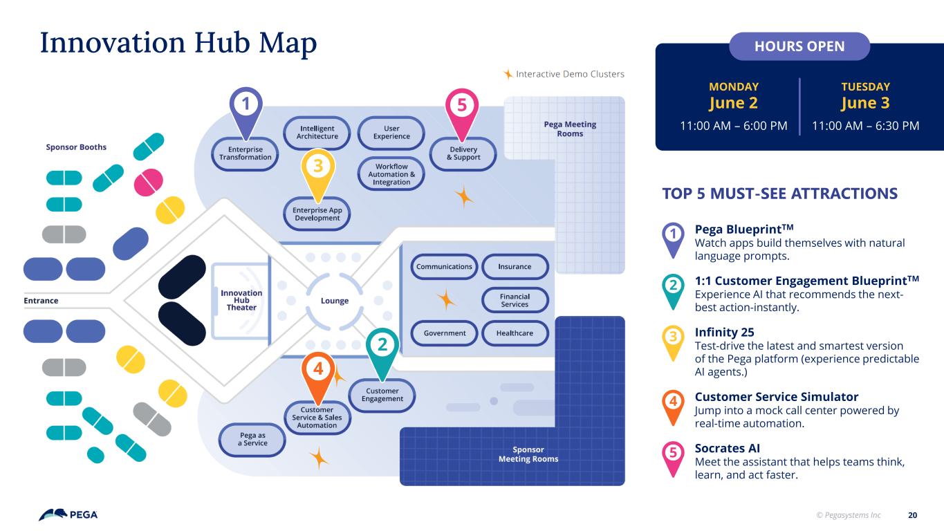© Pegasystems Inc HOURS OPEN 20 Innovation Hub Map MONDAY June 2 11:00 AM – 6:00 PM TUESDAY June 3 11:00 AM – 6:30 PM Pega BlueprintTM Watch apps build themselves with natural language prompts. Customer Service Simulator Jump into a mock call center powered by real-time automation. 1:1 Customer Engagement BlueprintTM Experience AI that recommends the next- best action-instantly. Infinity 25 Test-drive the latest and smartest version of the Pega platform (experience predictable AI agents.) Socrates AI Meet the assistant that helps teams think, learn, and act faster. 1 2 3 4 5 1 2 3 4 5 TOP 5 MUST-SEE ATTRACTIONS