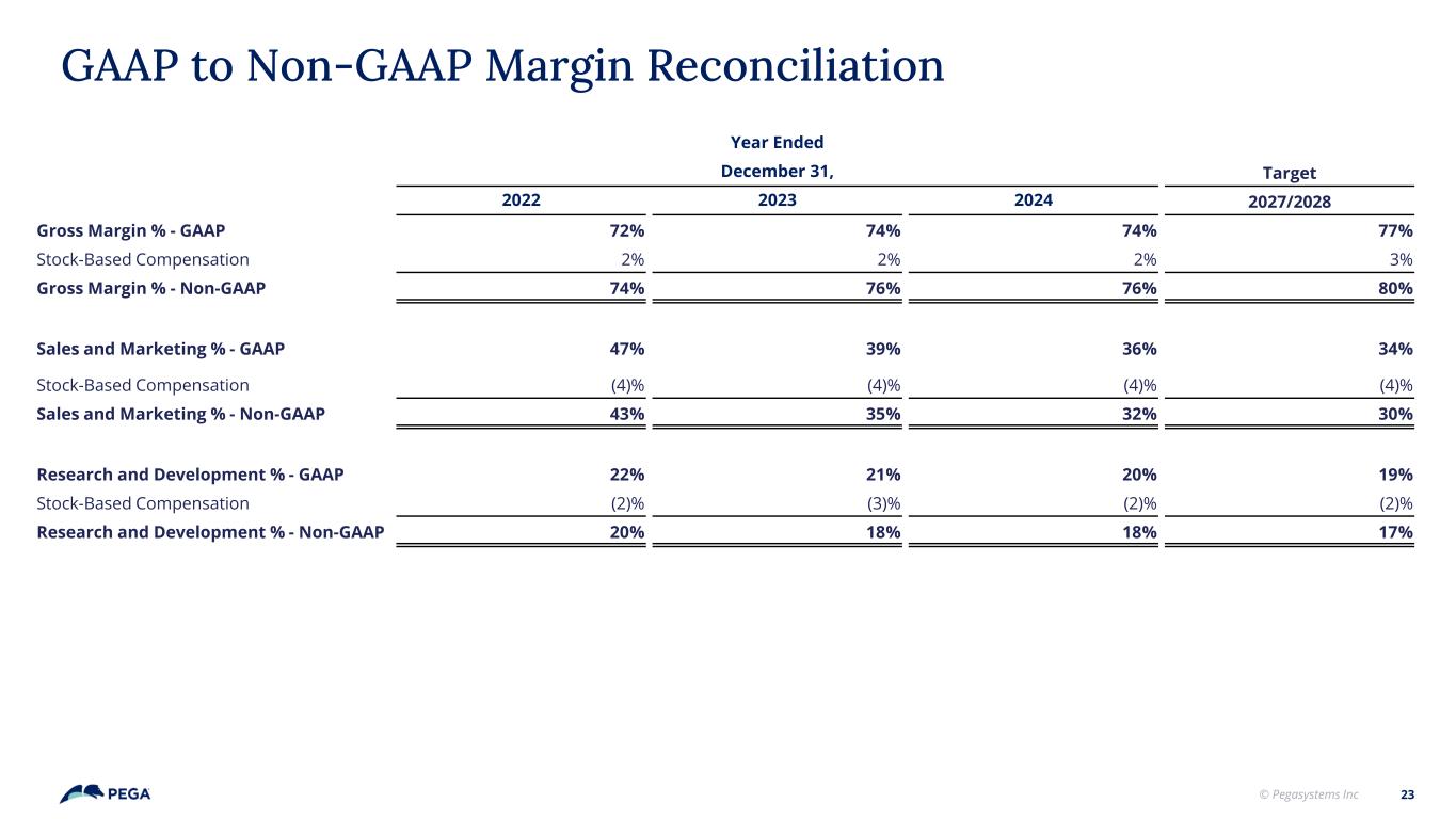 © Pegasystems Inc 1. Rule of 40: A performance metric calculated by adding the annual contract value (“ACV”) growth rate and the free cash flow margin. We also provide a table of supplemental information of other items that affected our cash flows and Rule of 40 achievement within the appendix of this presentation. 2. Supplemental Information: a. Litigation settlement, net of recoveries: Cost to settle litigation, net of insurance recoveries, arising from proceedings outside the ordinary course of business. See "Note 20. Commitments And Contingencies" in Item 8 of our Annual Report filed on Form 10-K for the year ended December 31, 2024 and our other SEC filings for further information; b. Restructuring: Restructuring fluctuates in amount and frequency and is significantly affected by the timing and size of our restructuring activities; c. Legal fees: Legal and related fees arising from proceedings outside the ordinary course of business; d. Interest on convertible senior notes: In February 2020, we issued convertible senior notes (the “Notes”), due March 1, 2025, in a private placement. The Notes accrued interest at an annual rate of 0.75%, paid semi-annually in arrears on March 1 and September 1. The outstanding Notes were repaid in their entirety at maturity; e. Other: Fees related to capital advisory services, canceled in-person sales and marketing events, and incremental costs incurred integrating acquisitions; f. Income taxes: Direct income taxes paid net of refunds received. 3. Annual Contract Value (“ACV”): represents the annualized value of our active contracts as of the measurement date. The contract's total value is divided by its duration in years to calculate ACV. ACV is a performance measure that we believe provides useful information to our management and investors. 4. Free Cash Flow: is defined as cash provided by operating activities less investment in property and equipment. Investment in property and commitment fluctuates in amount and frequency and is significantly affected by the timing and size of investments in our facilities. We provide information on free cash flow to enable investors to assess our ability to generate cash without incurring additional external financings. This information is not a substitute for financial measures prepared under U.S. GAAP. A reconciliation of cash provided by operating activities to free cash flow is within the appendix of this presentation. 5. Free Cash Flow Margin: is calculated by comparing the respective free cash flow to total revenue. 6. Non-GAAP Gross Margin: is defined as GAAP gross margin less the impacts of stock-based compensation. Although stock-based compensation is a key incentive offered to our employees, and we believe such compensation contributed to our revenues recognized during the periods presented and is expected to contribute to our future revenues, we continue to evaluate our business performance, excluding stock-based compensation. 7. Non-GAAP Sales and Marketing Expense: is defined as GAAP sales and marketing expense less the impact of stock-based compensation. Although stock-based compensation is a key incentive offered to our employees, and we believe such compensation contributed to our revenues recognized during the periods presented and is expected to contribute to our future revenues, we continue to evaluate our business performance, excluding stock-based compensation. The related margin is expressed as a percentage of total revenue for the respective periods. 8. Non-GAAP Research and Development Expense: is defined as GAAP research and development expense less the impact of stock-based compensation. Although stock- based compensation is a key incentive offered to our employees, and we believe such compensation contributed to our revenues recognized during the periods presented and is expected to contribute to our future revenues, we continue to evaluate our business performance, excluding stock-based compensation. The related margin is expressed as a percentage of total revenue for the respective periods. Appendix - Definitions 22