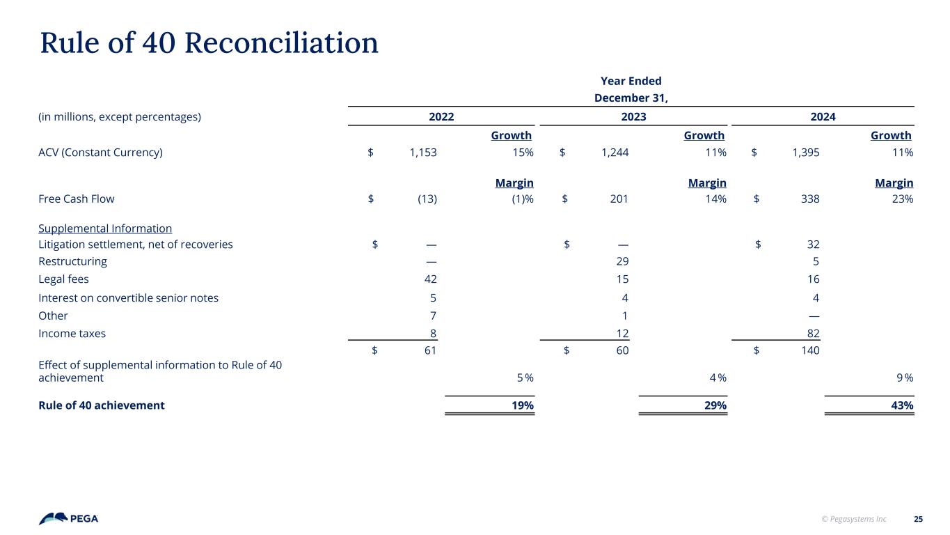 © Pegasystems Inc Year Ended December 31, (in millions, except percentages) 2022 2023 2024 Growth Growth Growth ACV (Constant Currency) $ 1,153 15% $ 1,244 11% $ 1,395 11% Margin Margin Margin Free Cash Flow $ (13) (1)% $ 201 14% $ 338 23% Supplemental Information Litigation settlement, net of recoveries $ — $ — $ 32 Restructuring — 29 5 Legal fees 42 15 16 Interest on convertible senior notes 5 4 4 Other 7 1 — Income taxes 8 12 82 $ 61 $ 60 $ 140 Effect of supplemental information to Rule of 40 achievement 5 % 4 % 9 % Rule of 40 achievement 19% 29% 43% Rule of 40 Reconciliation 25 Year Ended December 31, 2022 2023 2024 growth growth growth ACV (Constant Currency) 1153 0.15 1244 0.11 1395 0.11 margin margin margin Free Cash Flow -13 -0.01 201 0.14 338 0.23 Supplemental information Litigation settlement, net of recoveries $— $— $32,403 Restructuring $— $29,401 $5,252 Legal fees 41,789 14,645 16,197 Interest on convertible senior notes 4,500 4,134 3,810 Other 6,805 601 — Facilities — — — Income taxes 7,645 11,664 82,317 $60,739 $60,445 $139,979 Effect of supplemental information to Rule of 40 achievement 0.05 0.04 0.09 Rule of 40 achievement 0.19 0.29 0.43