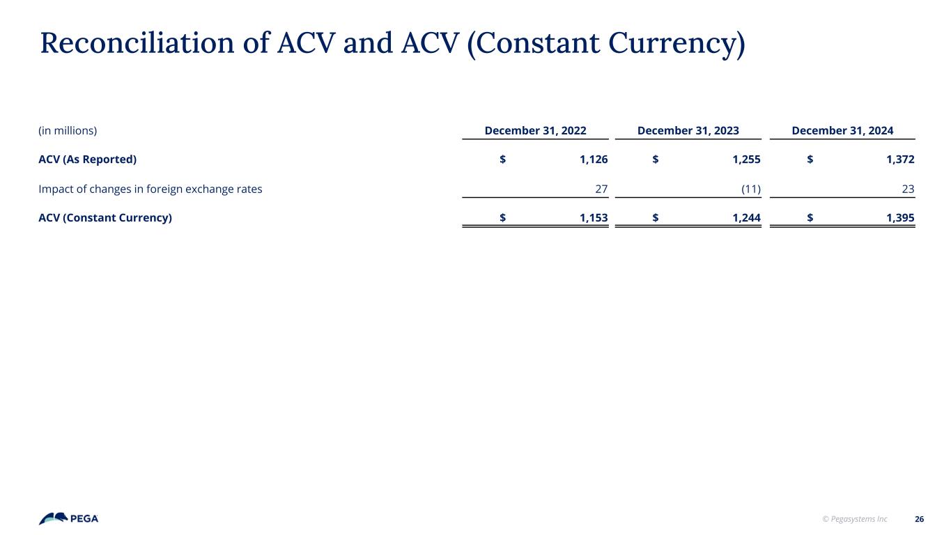 © Pegasystems Inc (in millions) December 31, 2022 December 31, 2023 December 31, 2024 ACV (As Reported) $ 1,126 $ 1,255 $ 1,372 Impact of changes in foreign exchange rates 27 (11) 23 ACV (Constant Currency) $ 1,153 $ 1,244 $ 1,395 Reconciliation of ACV and ACV (Constant Currency) 26 31-Dec-22 31-Dec-23 31-Dec-24 ACV (As Reported) 1126 1255 1372 impact of changes in foreign exchange rates 27 -11 23 ACV (Constant Currency) 1153 1244 1395