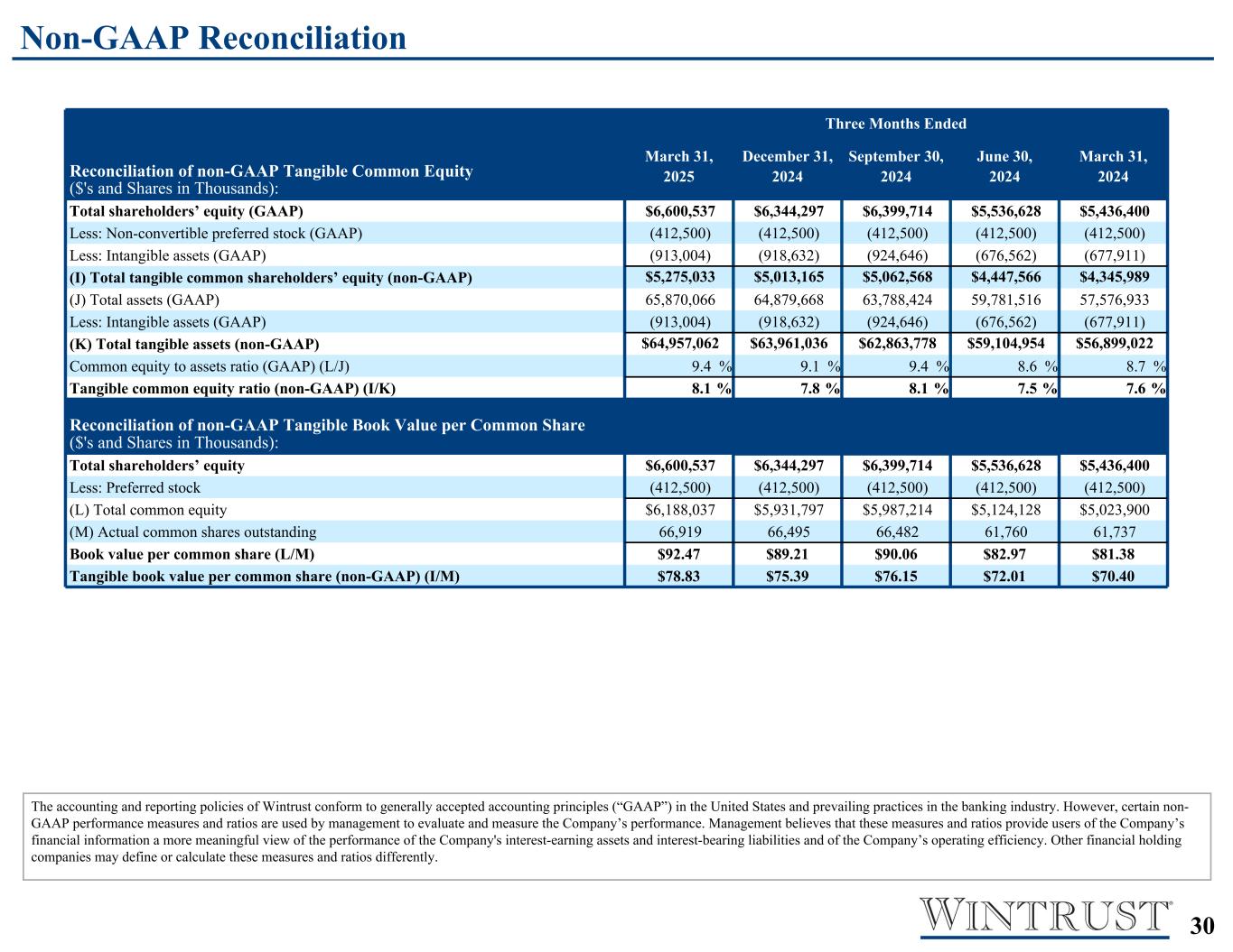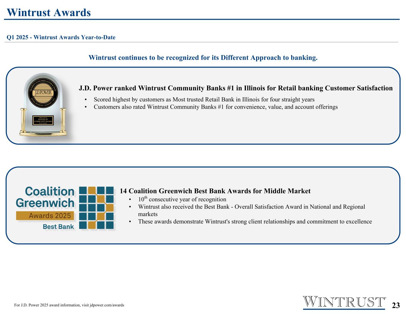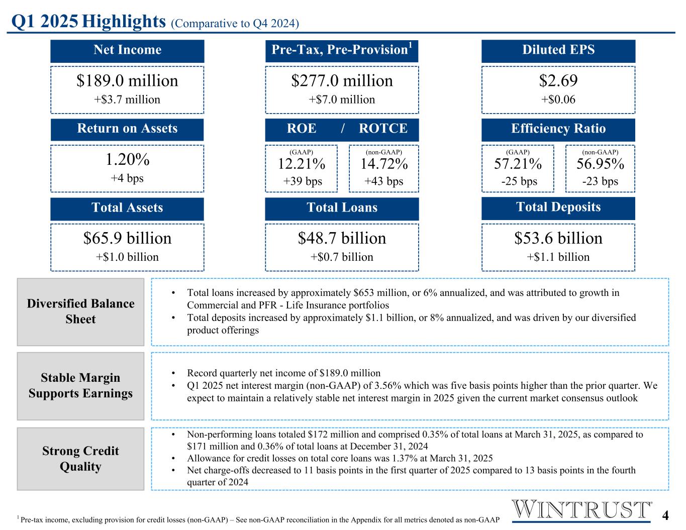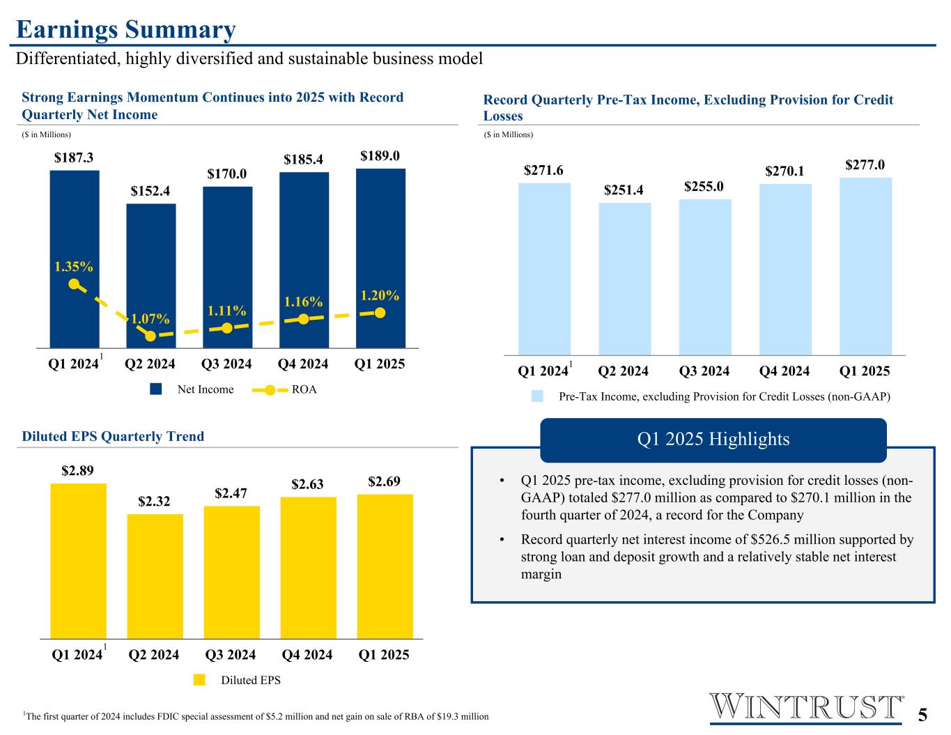 イリノイ州ローズモント発-ウィントラスト・ファイナンシャル・コーポレーション(以下「ウィントラ スト」、「当社」、「当社」)は、2025 年第 1 四半期の四半期純利益が、2024 年第 4 四半期の 1 億 8,540 万ドル(希薄化後普通株式 1 株当たり 2.63 ドル)に対し、過去最高の 1 億 8,900 万ドル(希薄化後普通株式 1 株当たり 2.69 ドル)となったことを発表した。税引前利益(非GAAP基準)は、2024年第4四半期の2億7,010万ドルに対し、過去最高の2億7,700万ドルとなった。
