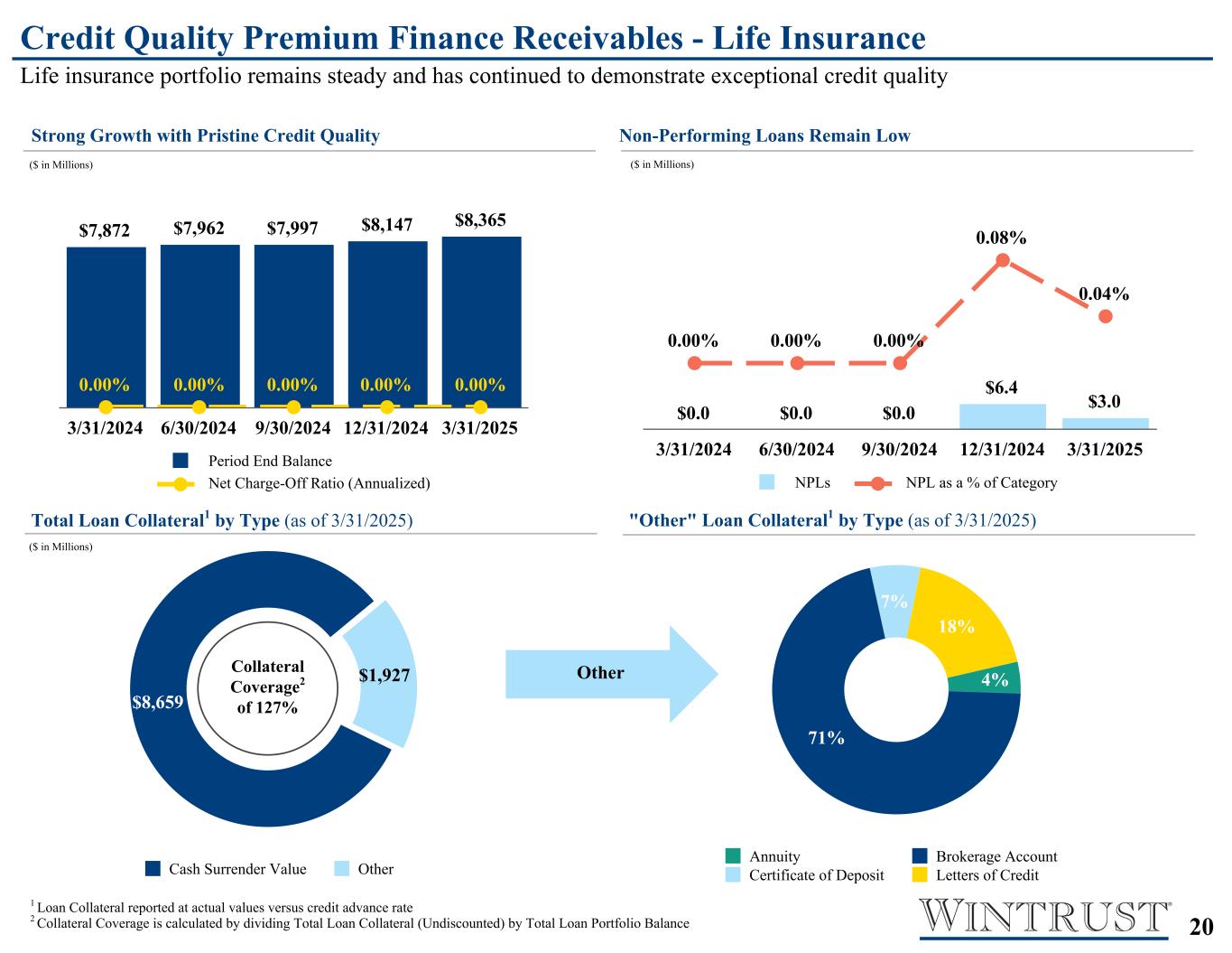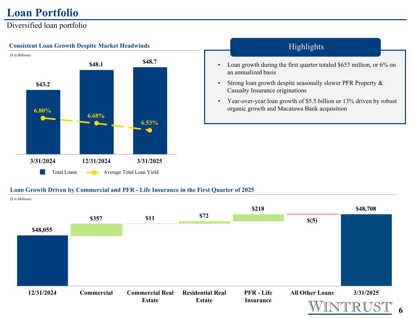 2025 年第 1 四半期の総資産は、2024 年第 4 四半期から 10 億ドル増加した。貸出金合計は、2024 年第 4 四半期から 6.534 億ドル増加しました。貸出金の増加は、主に商業貸付ポートフォリオおよびプレミアム・ファイナンス生命保険 貸付ポートフォリオの増加によるものです。