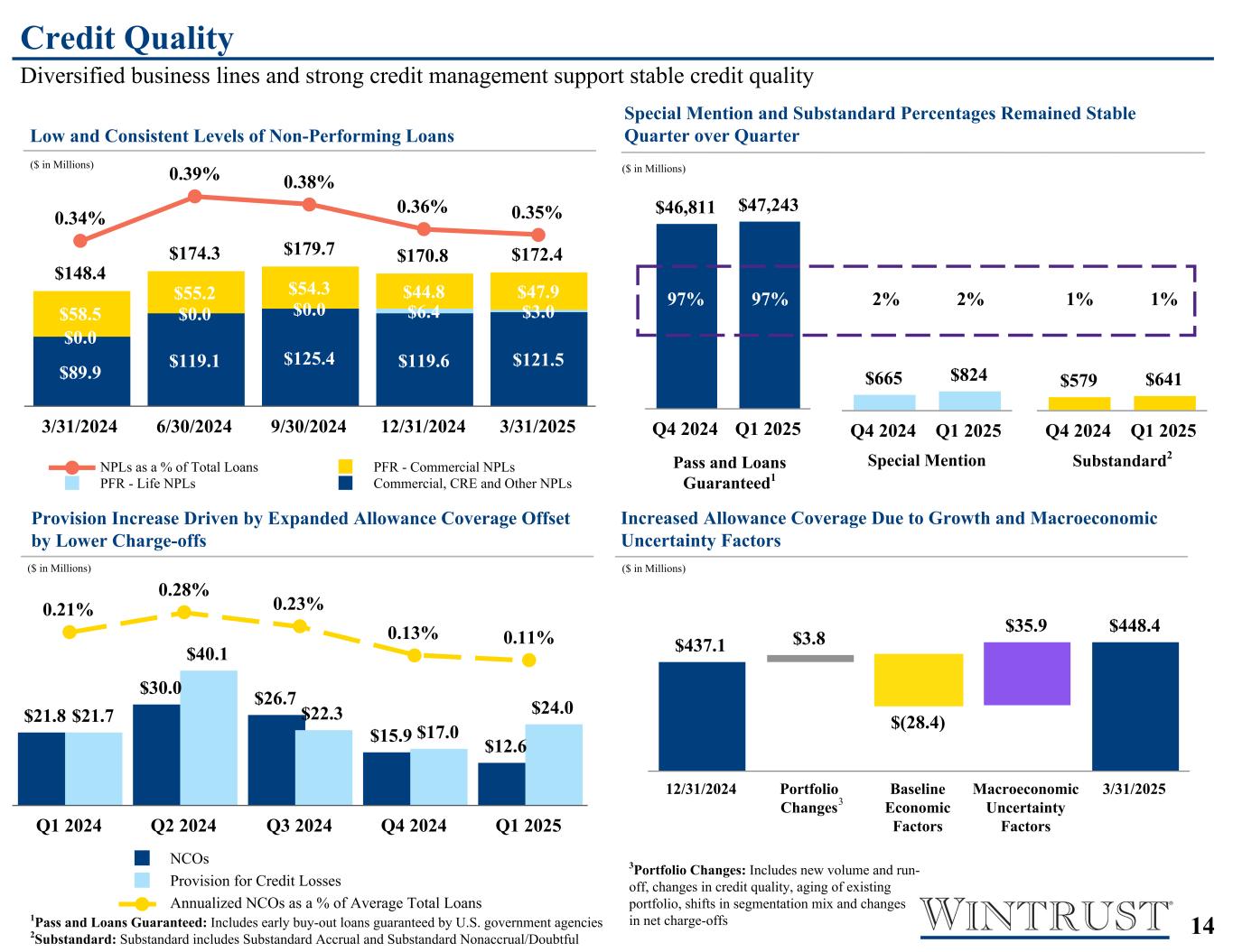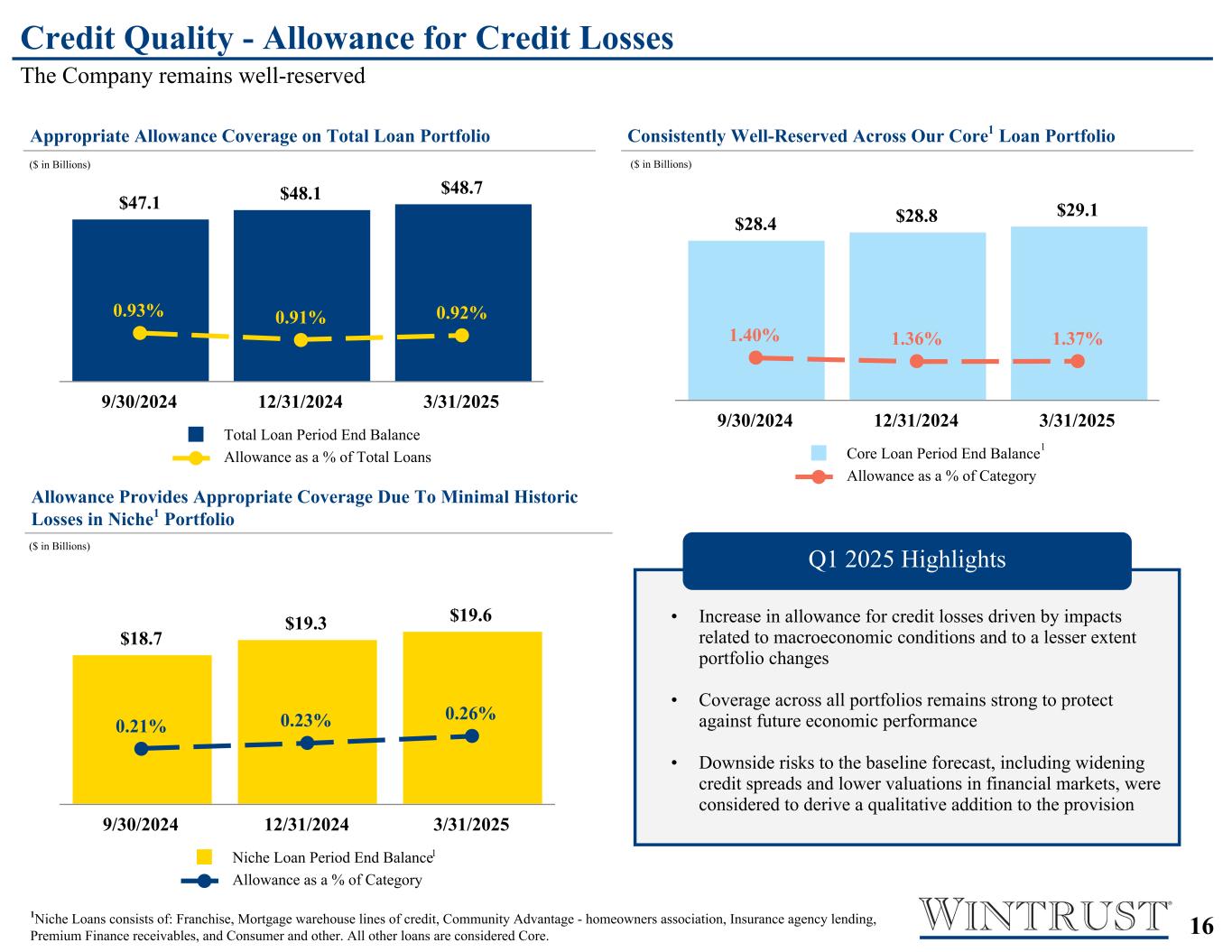-正味貸倒引当金は、2024 年第 4 四半期の 1,590 万ドル(年率換算で貸出金総額の 13 ベーシス・ポイント)に対し、2025 年第 1 四半期は 1,260 万ドル(年率換算で貸出金総額の 11 ベーシス・ポイント)となりました。