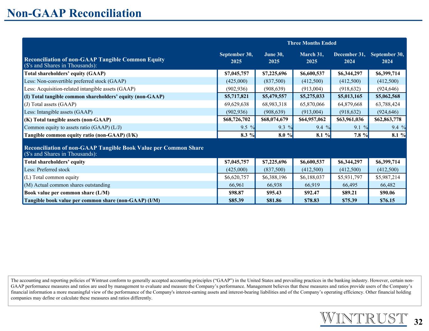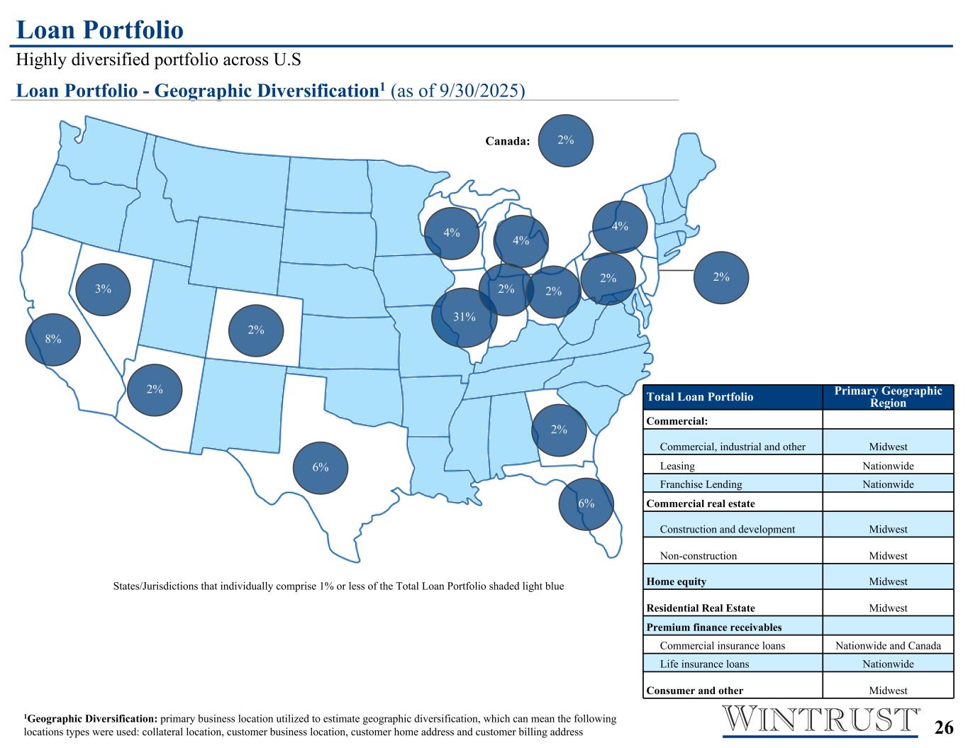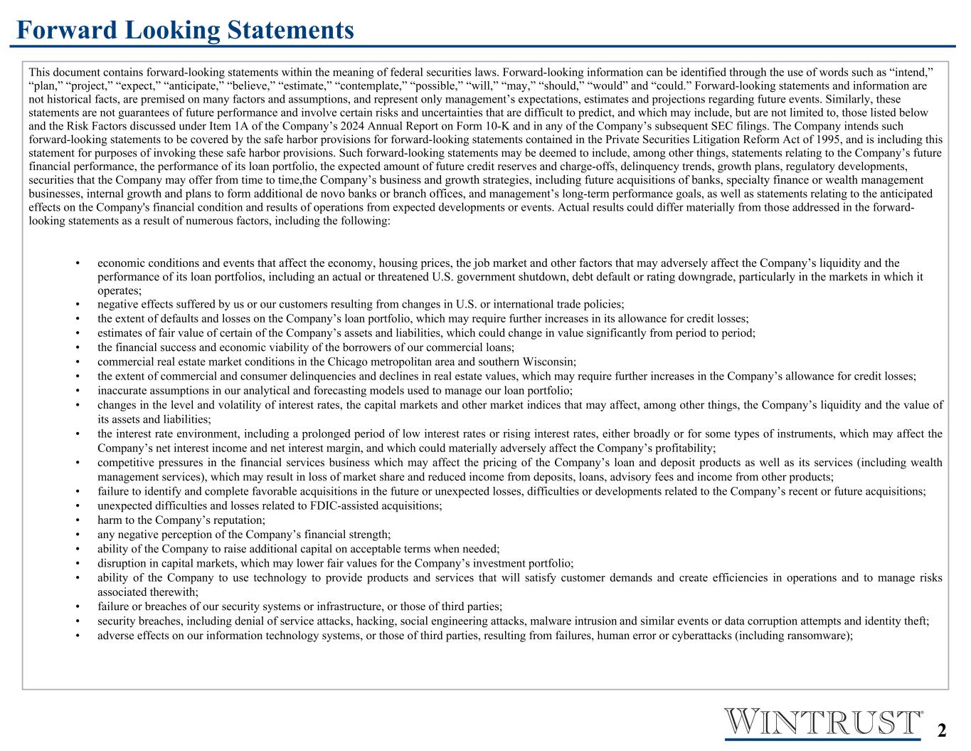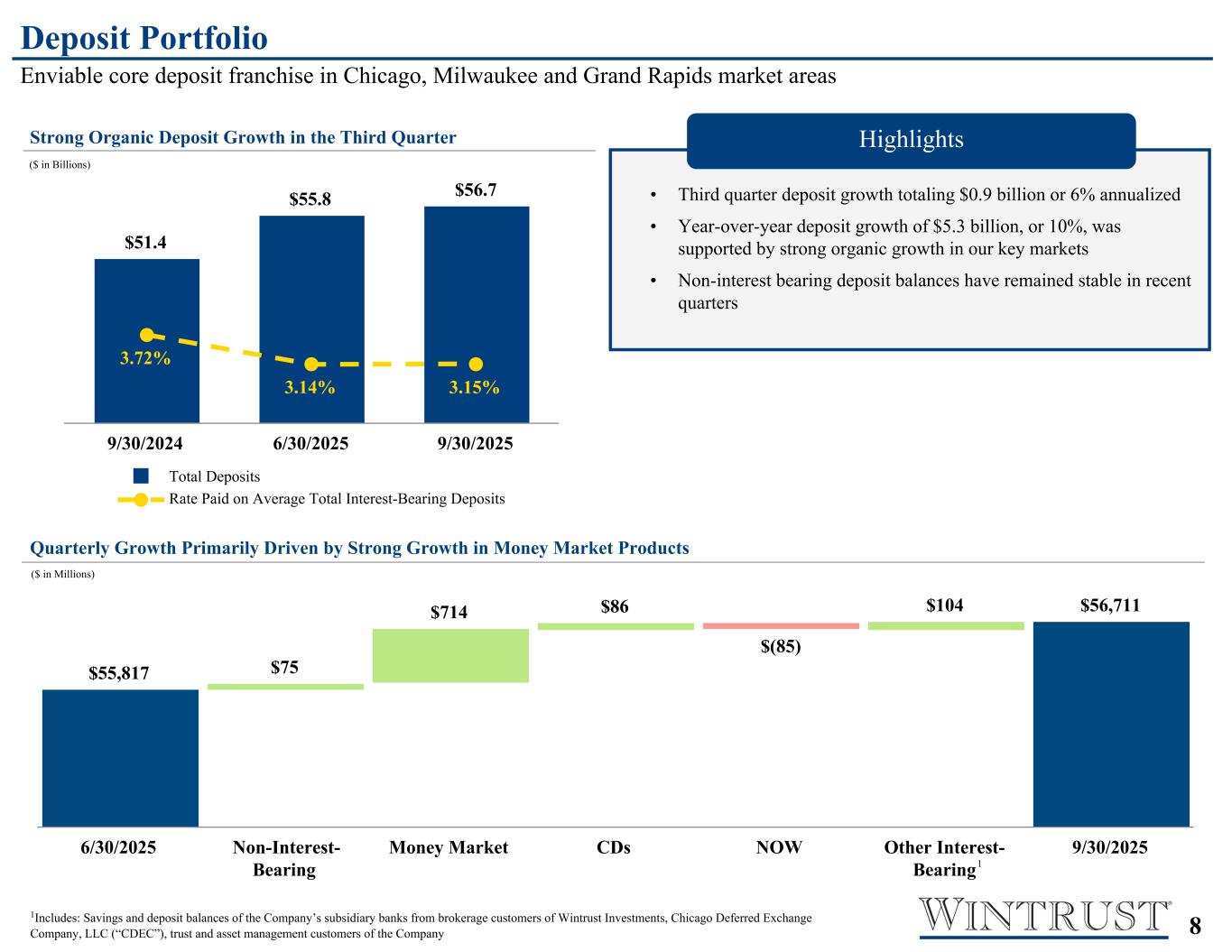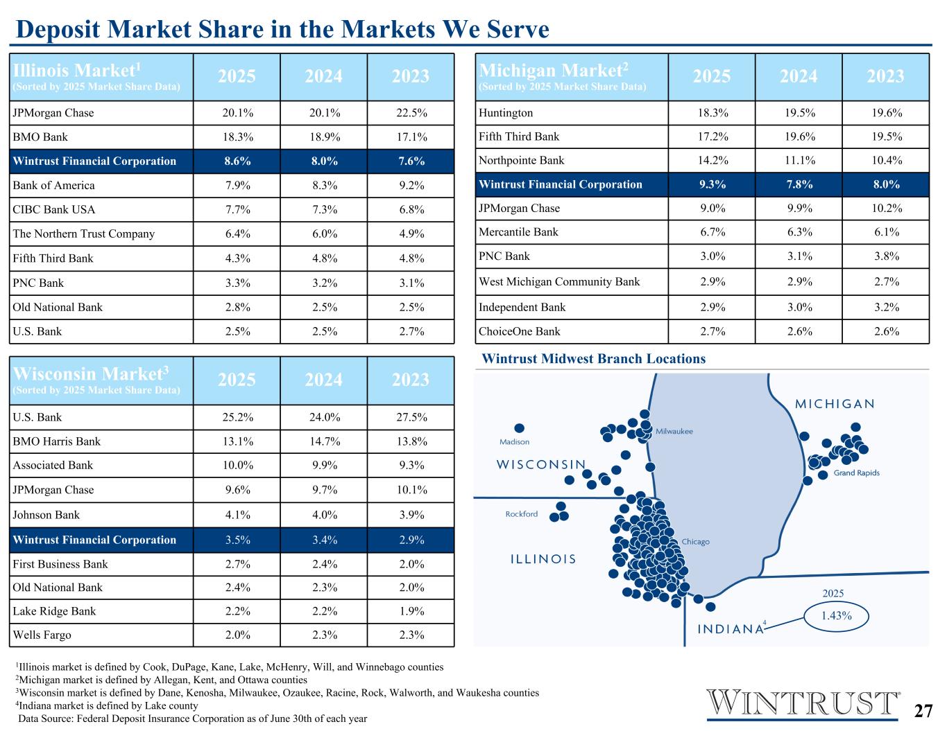 最後に、クレーン氏は次のように締めくくった。「当行は、第3四半期の業績と、今年度までの記録的な業績を誇りに思います。第 3 四半期に達成した力強い融資の伸びを土台に、2025 年を締めくくるにあたり、当行は勢いを維持し、継続的な収益の拡大を実現できる態勢を整えています。イリノイ州での預金市場シェア第3位への躍進や、ウィスコンシン州およびミシガン州西部での堅調な預金市場シェア拡大など、当行の主要市場における預金市場シェアの拡大が証明しているように、当行は引き続き、強固な顧客関係および差別化された市場ポジショニングを活用し、長期的なフランチャイズ価値を高めていきます。当行は引き続き、差別化されたカスタマー・エクスペリエンスを提供することに注力し、お客さまの業績向上と株主価値の向上に努めてまいります。