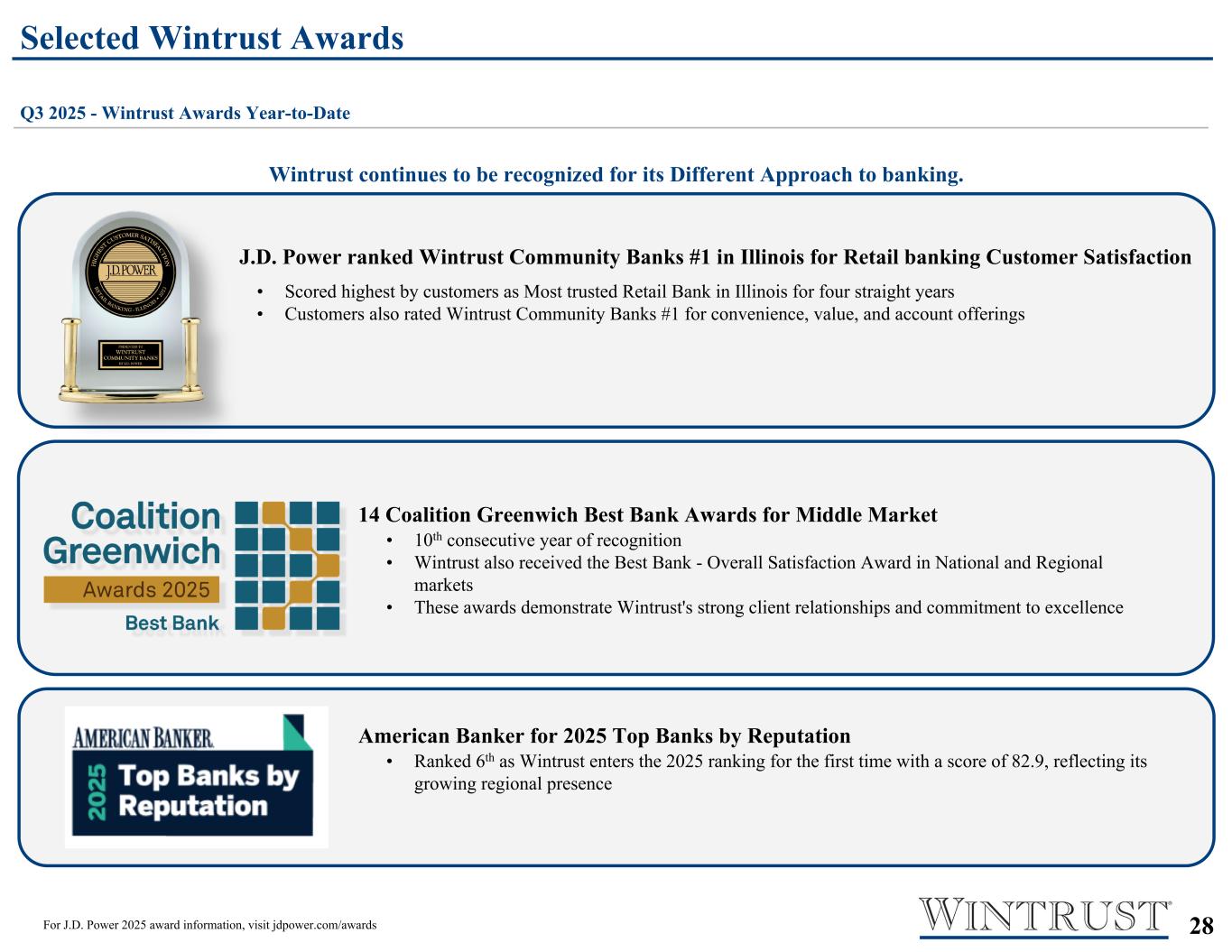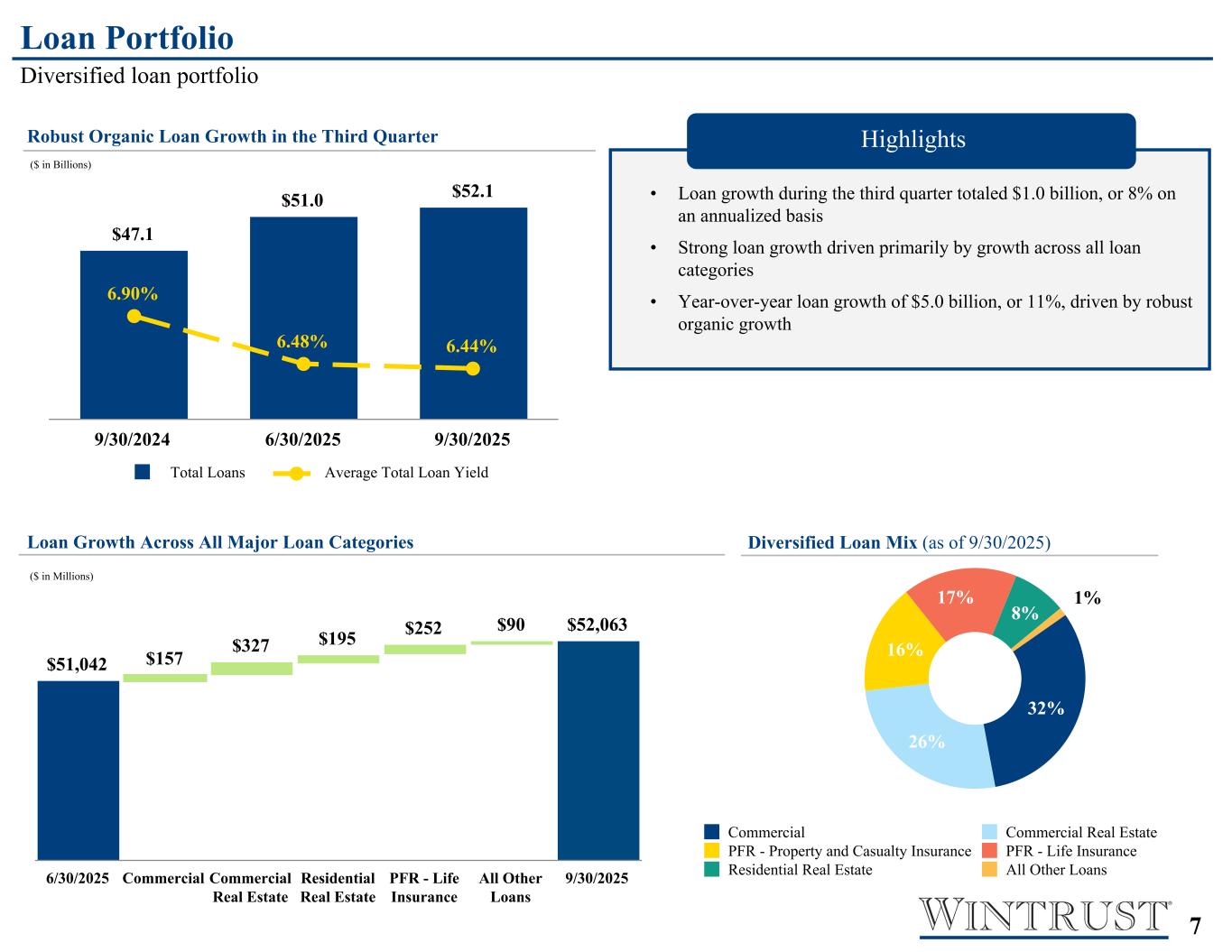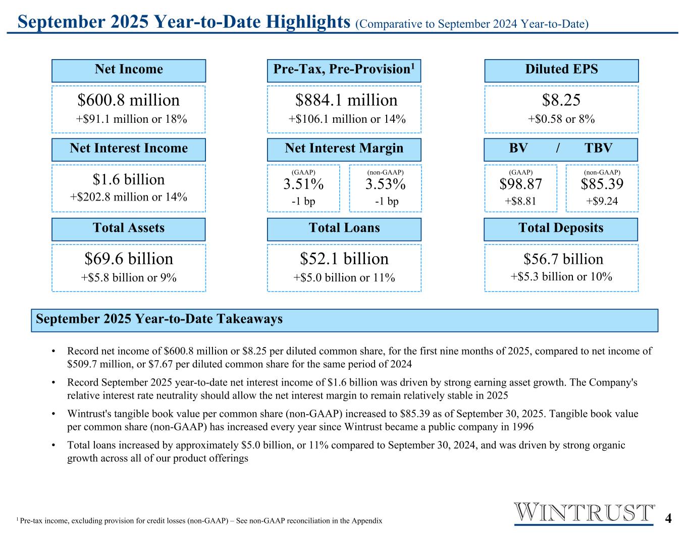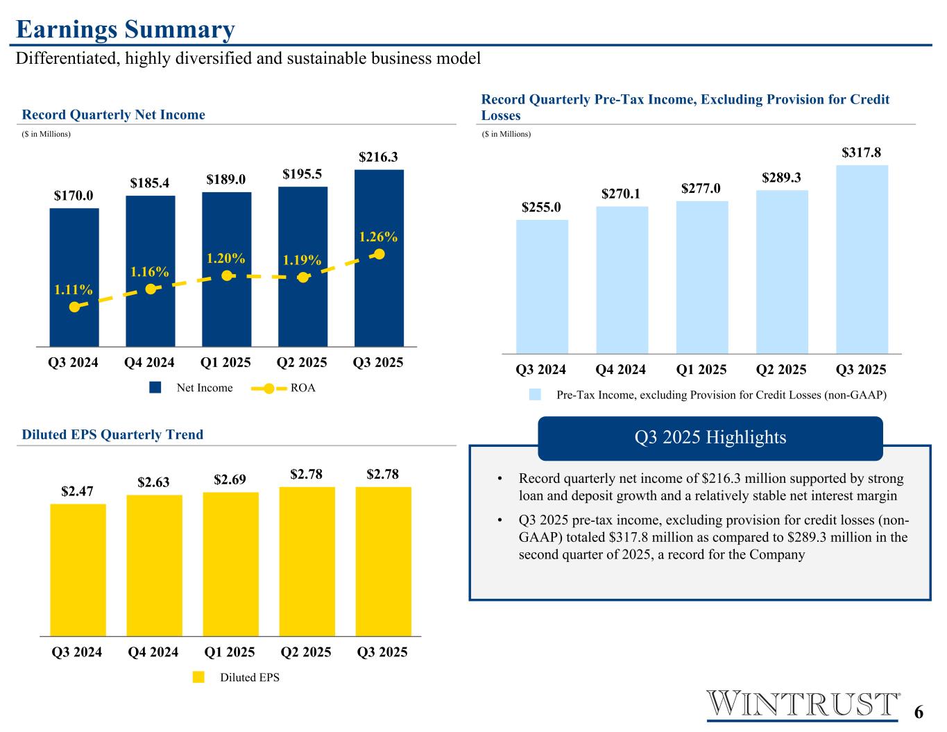 イリノイ州ローズモント発-ウィントラスト・ファイナンシャル・コーポレーション(以下「ウィント ラスト」、「当社」、「当社」または「当社」)(Nasdaq: WTFC)は、2025 年 1~9 月期の純利益が、前年同期の 5 億 970 万ドル(希薄化後普通株式 1 株当たり 7.67 ドル)に対し、過去最高の 6 億 80 万ドル(希薄化後普通株式 1 株当たり 8.25 ドル)となったことを発表した。税引前・引当金前利益(非GAAP基準)は、2024年1~9月期が7億7,810万ドルであったのに対し、2025年1~9月期は8億8,410万ドルと過去最高となった。