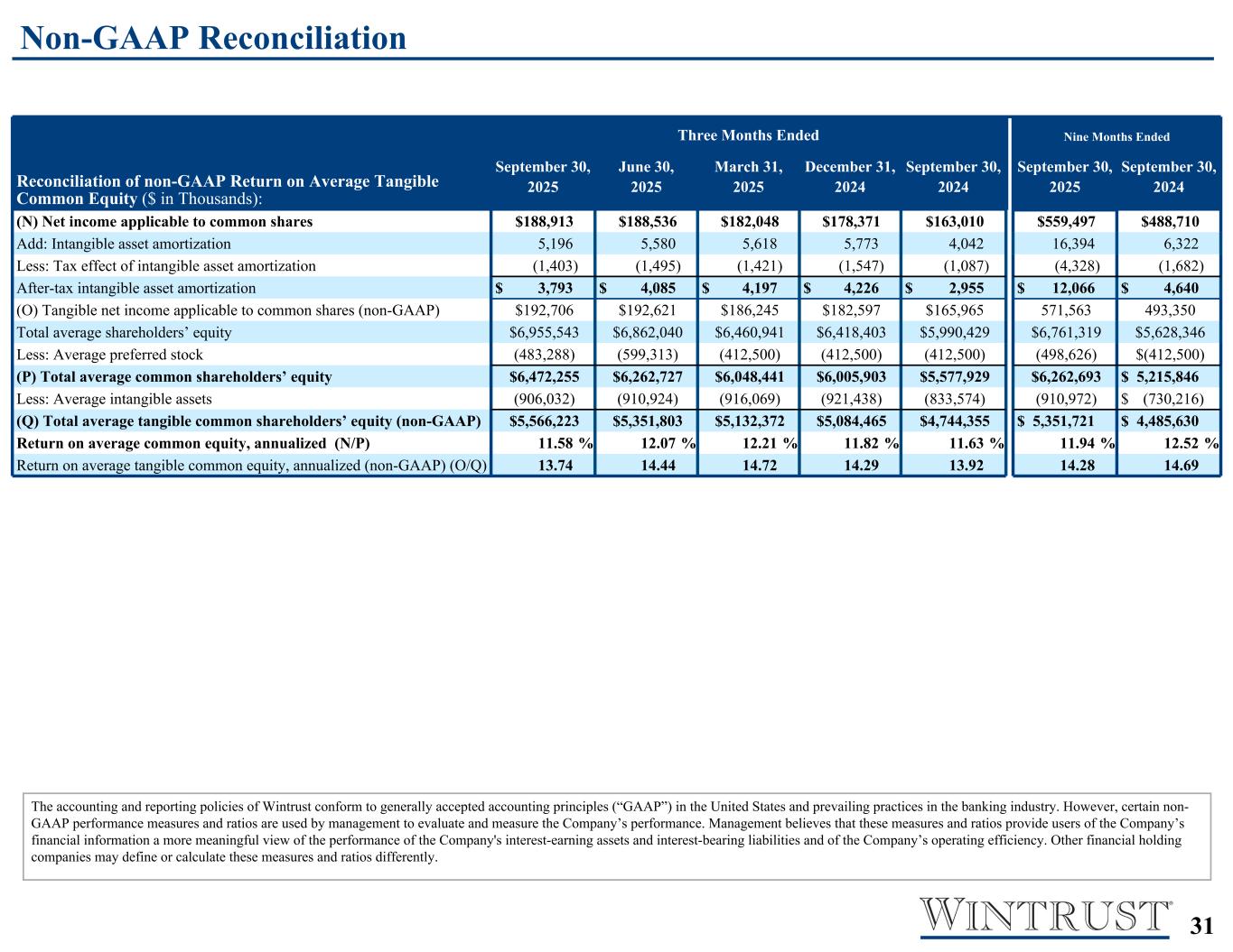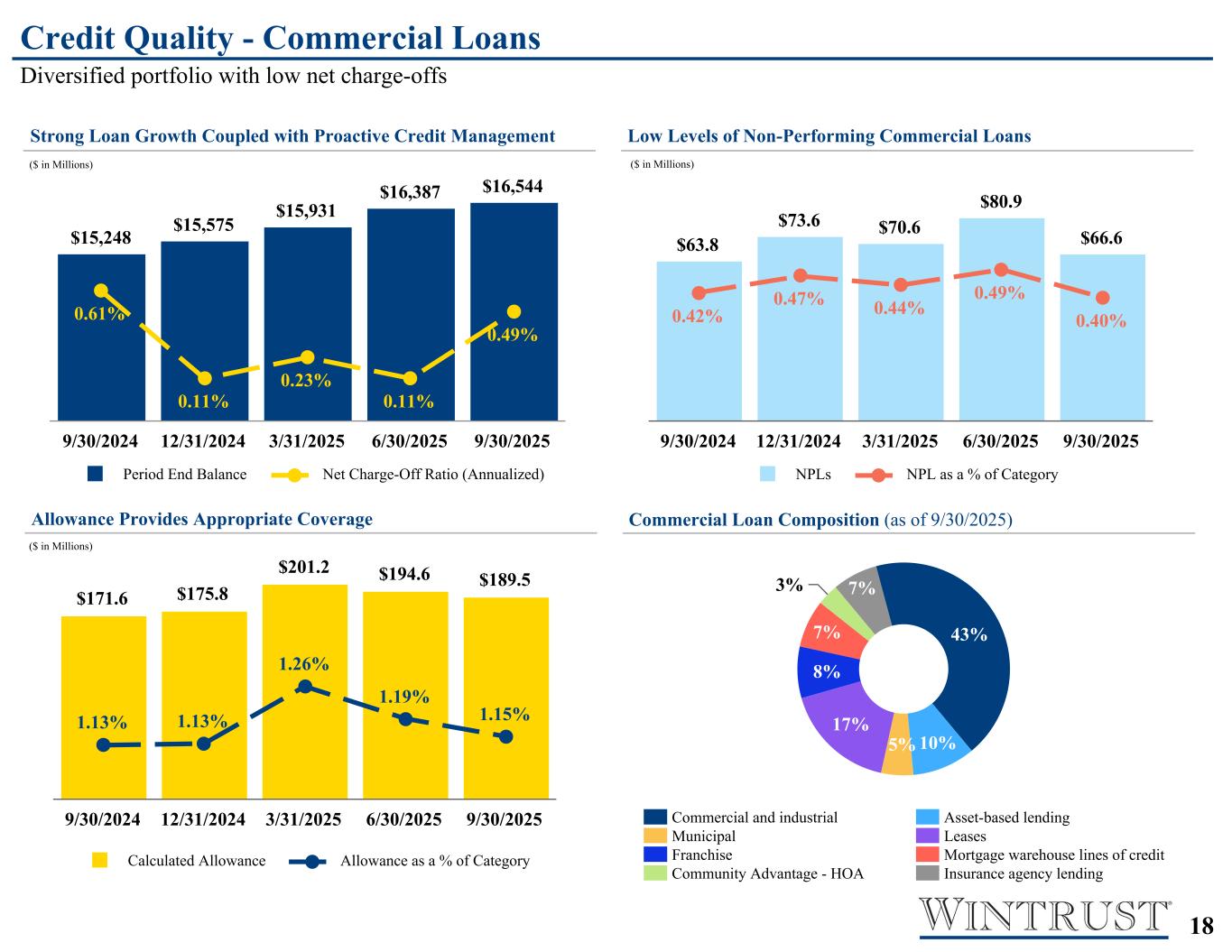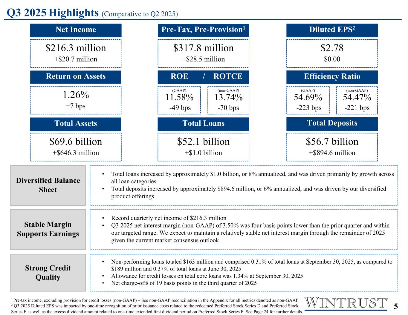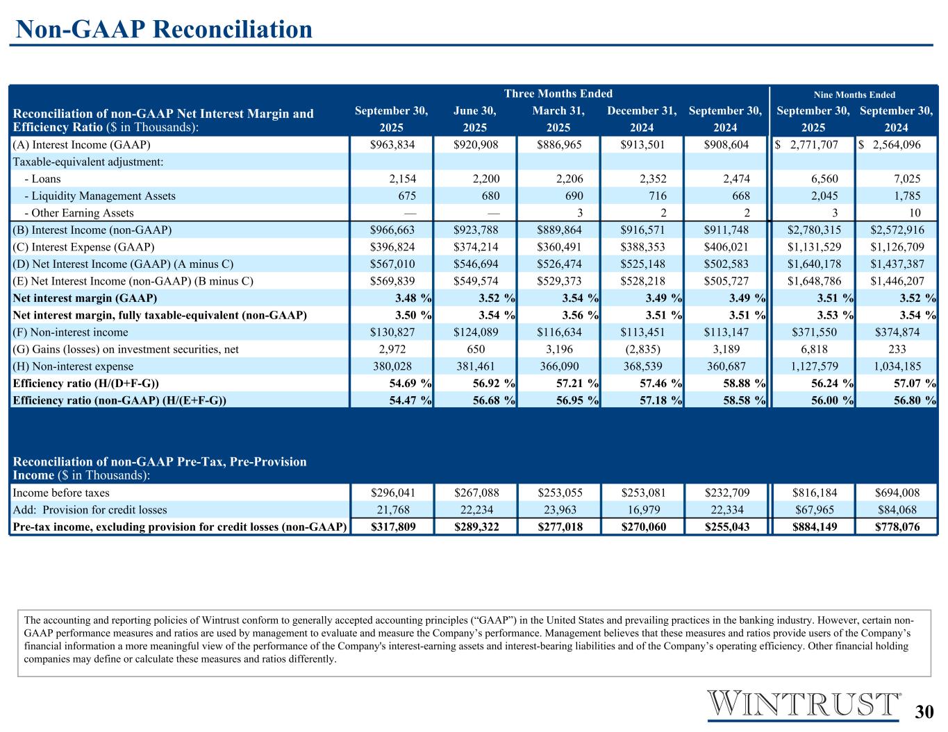 イリノイ州ローズモント発-ウィントラスト・ファイナンシャル・コーポレーション(以下「ウィント ラスト」、「当社」、「当社」または「当社」)(Nasdaq: WTFC)は、2025 年 1~9 月期の純利益が、前年同期の 5 億 970 万ドル(希薄化後普通株式 1 株当たり 7.67 ドル)に対し、過去最高の 6 億 80 万ドル(希薄化後普通株式 1 株当たり 8.25 ドル)となったことを発表した。税引前・引当金前利益(非GAAP基準)は、2024年1~9月期が7億7,810万ドルであったのに対し、2025年1~9月期は8億8,410万ドルと過去最高となった。