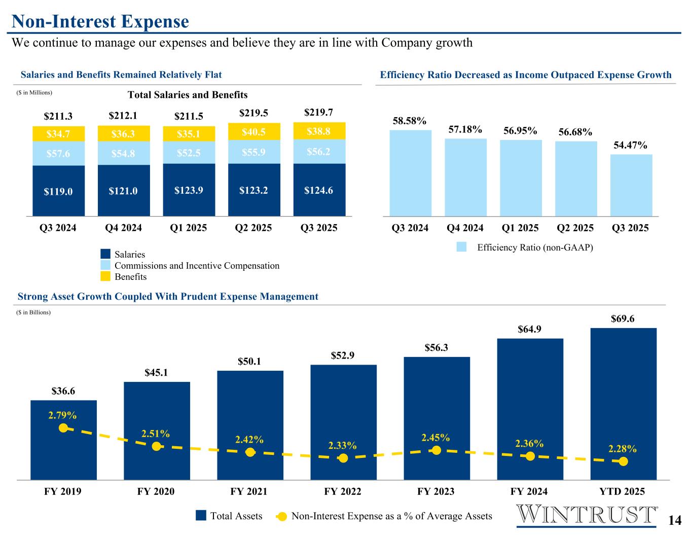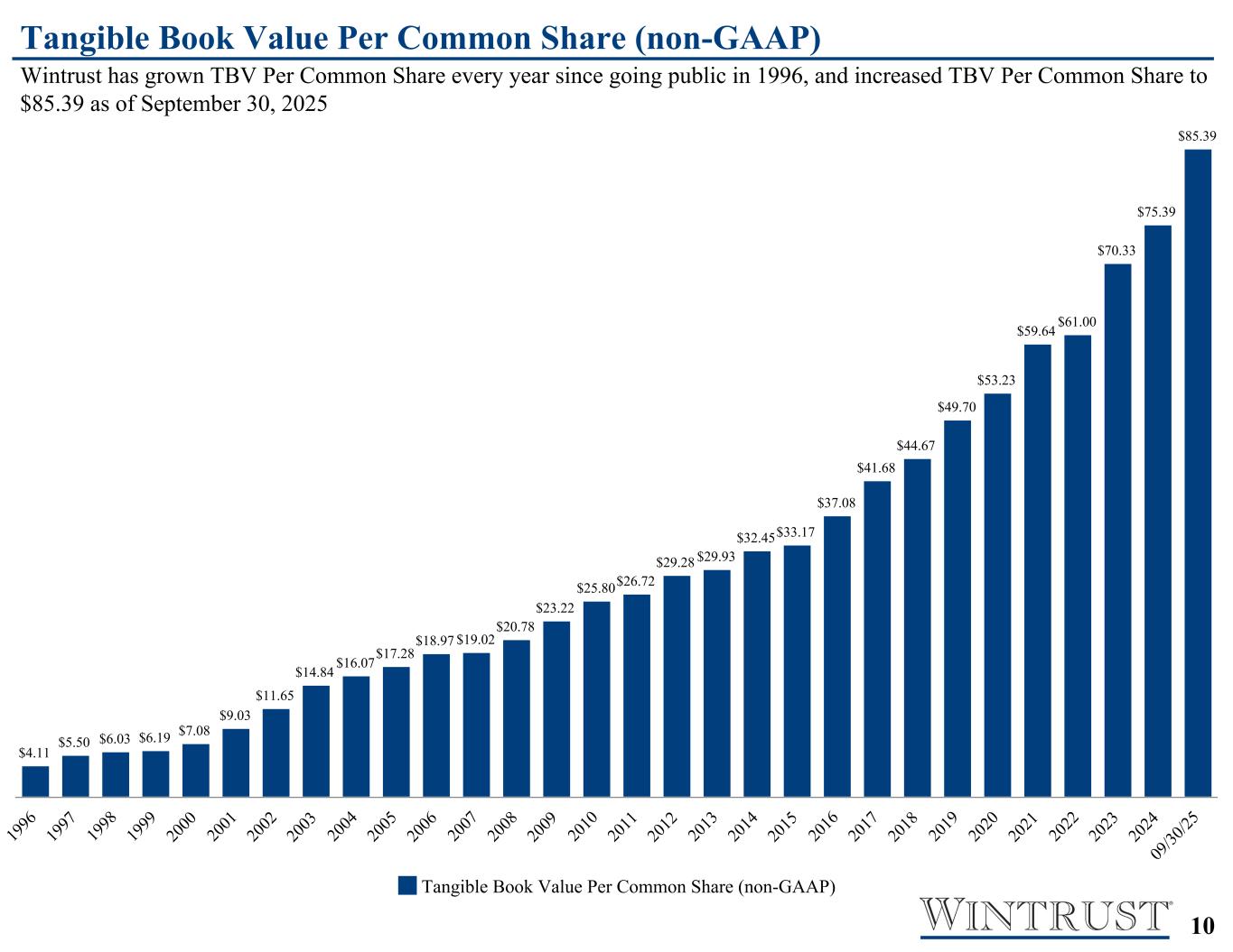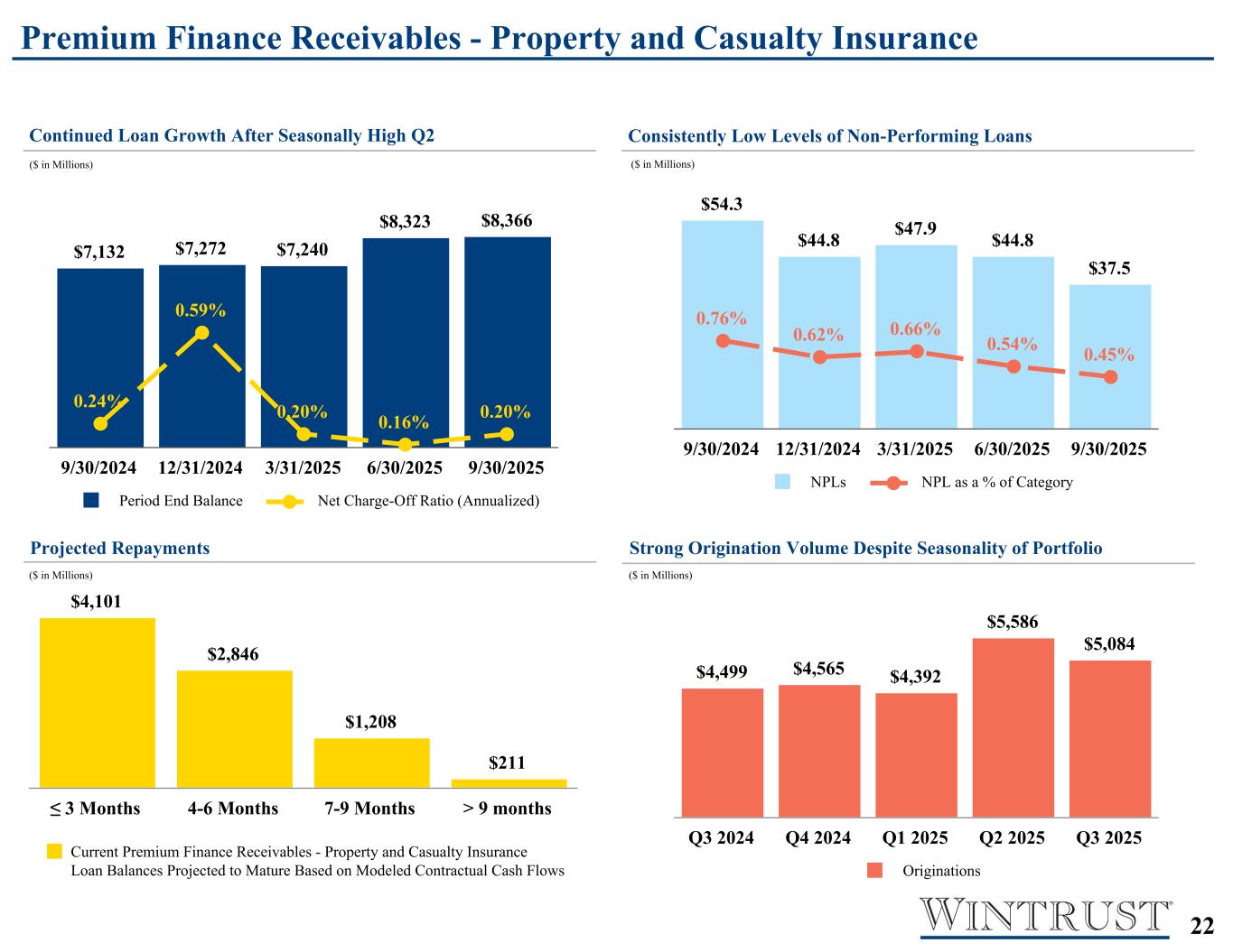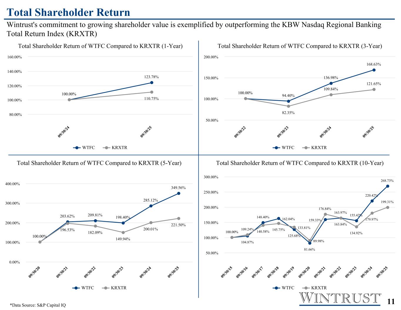 イリノイ州ローズモント発-ウィントラスト・ファイナンシャル・コーポレーション(以下「ウィント ラスト」、「当社」、「当社」または「当社」)(Nasdaq: WTFC)は、2025 年 1~9 月期の純利益が、前年同期の 5 億 970 万ドル(希薄化後普通株式 1 株当たり 7.67 ドル)に対し、過去最高の 6 億 80 万ドル(希薄化後普通株式 1 株当たり 8.25 ドル)となったことを発表した。税引前・引当金前利益(非GAAP基準)は、2024年1~9月期が7億7,810万ドルであったのに対し、2025年1~9月期は8億8,410万ドルと過去最高となった。