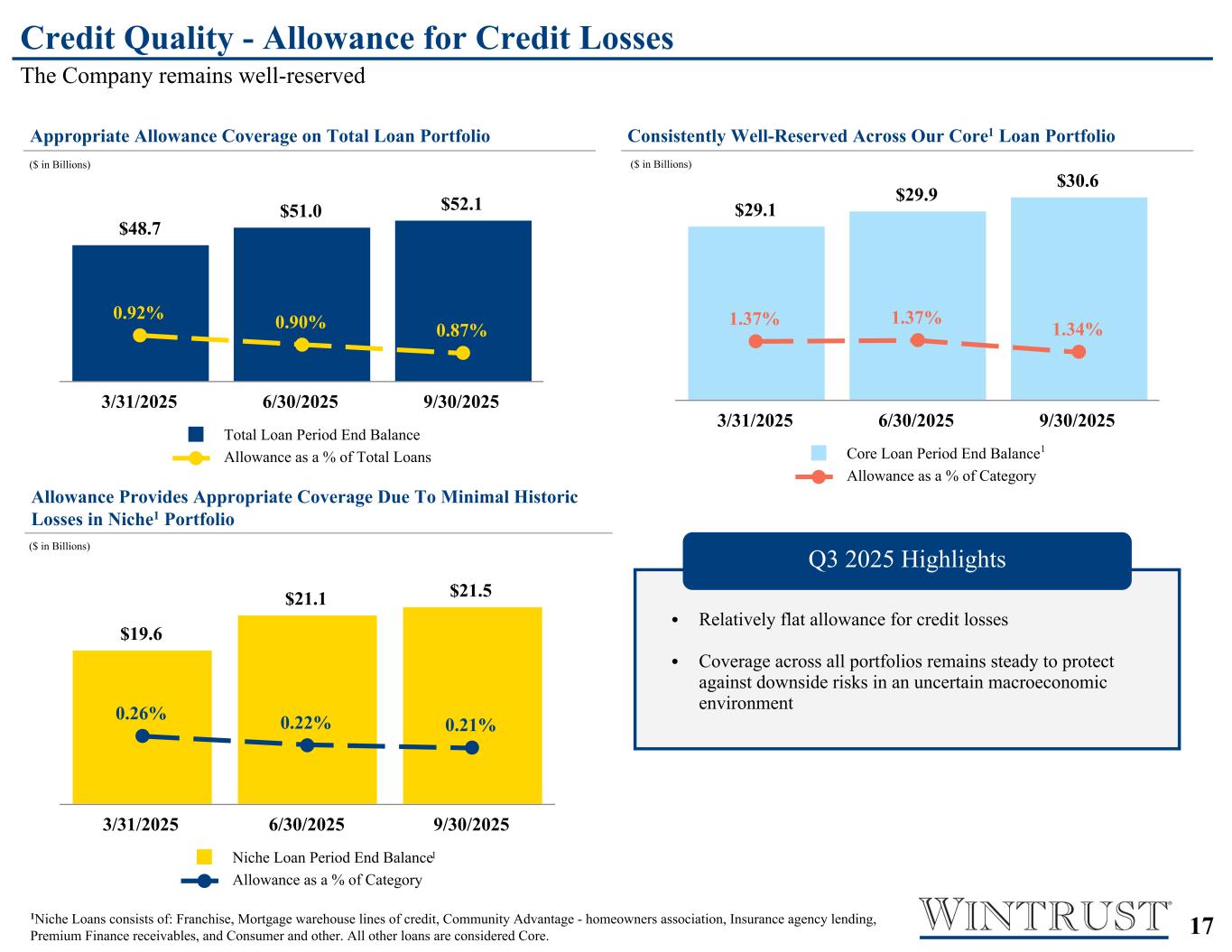 2025年9月30日現在の貸倒引当金は4億5,460万ドルで、2025年6月30日現在の4億5,750万ドルから若干減少した。貸倒引当金繰入額は、2025年第2四半期の2,220万ドルに対し、2025年第3四半期は2,180万ドルでした。2025年第3四半期に認識された貸倒引当金繰入額は、安定した信用の質およびマクロ経済見通しの改善を 反映したものです。しかし、将来の経済実績が依然不透明であることから、信用スプレッドに関連する引当金の質的追 加が行われました。貸倒引当金および貸倒引当金繰入額に関する詳細は、本レポートの表11を参照されたい。
