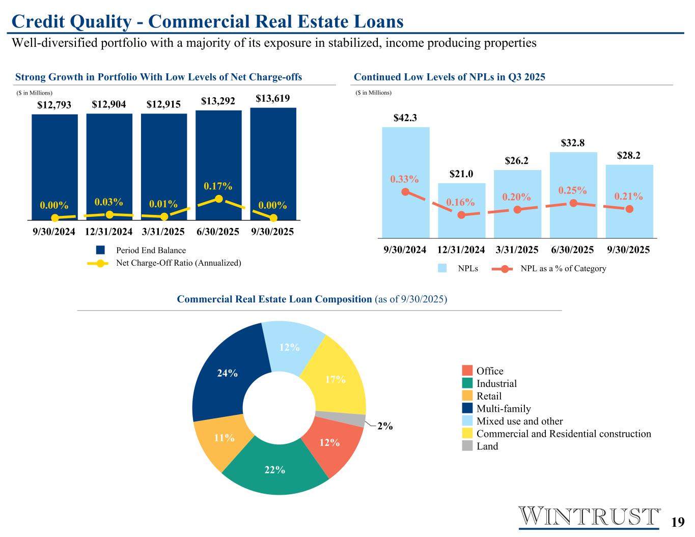 2025 年第 3 四半期の正味償却額は 2,460 万ドルで、前年同期の 1,330 万ドルから 1,130 万ドル増加した。平均貸出総額に占める正味償却額の割合は、2025 年第 2 四半期の年率 11bp に対し、2025 年第 3 四半期は 19bp となりました。正味貸倒損失の詳細については、本レポートの表10を参照されたい。