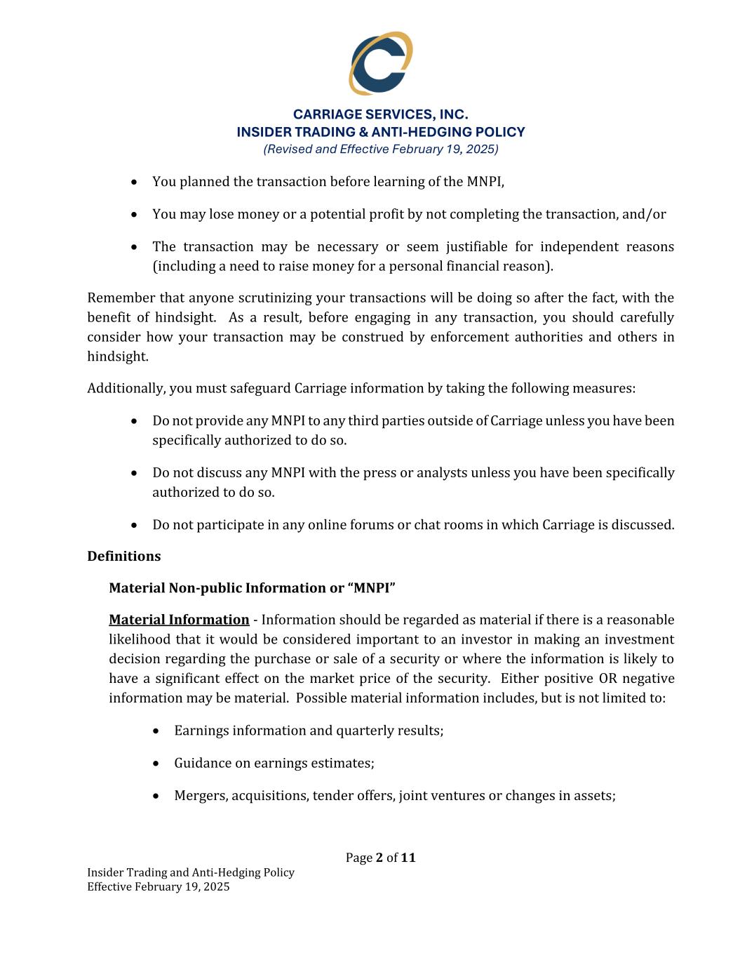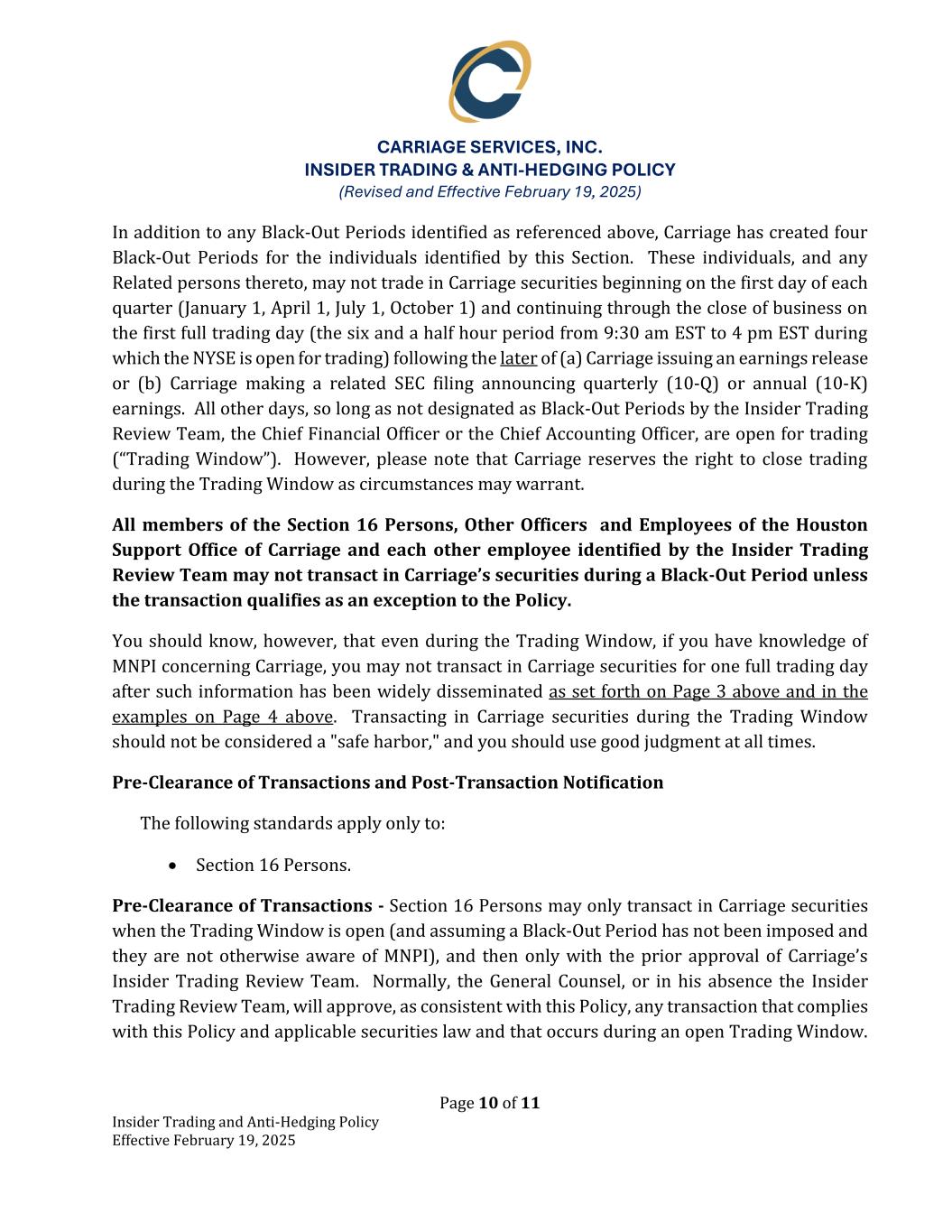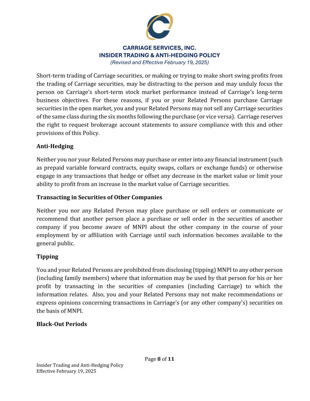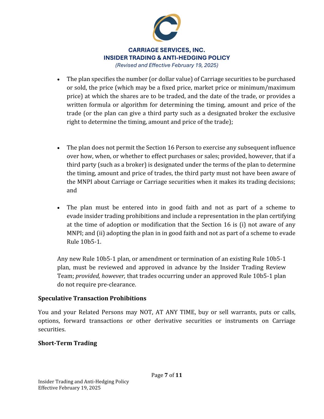 0001016281false2024FYhttp://fasb.org/us-gaap/2024#DeferredCostsAndOtherAssetshttp://fasb.org/us-gaap/2024#DeferredCostsAndOtherAssetsP2YP1Y3.5P1YP9Yhttp://fasb.org/us-gaap/2024#PropertyPlantAndEquipmentNethttp://fasb.org/us-gaap/2024#PropertyPlantAndEquipmentNethttp://www.carriageservices.com/20241231#LeaseLiabilitiesAndDebtCurrenthttp://www.carriageservices.com/20241231#LeaseLiabilitiesAndDebtCurrenthttp://www.carriageservices.com/20241231#LeaseLiabilitiesAndDebtCurrenthttp://www.carriageservices.com/20241231#LeaseLiabilitiesAndDebtCurrentP1YP1YP2YP7Y431399iso4217:USDxbrli:sharesiso4217:USDxbrli:sharescsv:segmentxbrli:purecsv:numberOfOperatingLocationcsv:statecsv:divestiturecsv:cemeterycsv:funeral_homecsv:cemetarycsv:crematorycsv:letter_of_creditcsv:plan00010162812024-01-012024-12-3100010162812024-06-2800010162812025-02-2400010162812024-12-3100010162812023-12-310001016281us-gaap:SeniorNotesMember2024-12-310001016281us-gaap:SeniorNotesMember2023-12-310001016281csv:ServiceRevenueMember2024-01-012024-12-310001016281csv:ServiceRevenueMember2023-01-012023-12-310001016281csv:ServiceRevenueMember2022-01-012022-12-310001016281csv:PropertyandMerchandiseMember2024-01-012024-12-310001016281csv:PropertyandMerchandiseMember2023-01-012023-12-310001016281csv:PropertyandMerchandiseMember2022-01-012022-12-310001016281csv:OtherRevenueMember2024-01-012024-12-310001016281csv:OtherRevenueMember2023-01-012023-12-310001016281csv:OtherRevenueMember2022-01-012022-12-3100010162812023-01-012023-12-3100010162812022-01-012022-12-310001016281us-gaap:CommonStockMember2021-12-310001016281us-gaap:AdditionalPaidInCapitalMember2021-12-310001016281us-gaap:RetainedEarningsMember2021-12-310001016281us-gaap:TreasuryStockCommonMember2021-12-3100010162812021-12-310001016281us-gaap:RetainedEarningsMember2022-01-012022-12-310001016281us-gaap:CommonStockMember2022-01-012022-12-310001016281us-gaap:AdditionalPaidInCapitalMember2022-01-012022-12-310001016281us-gaap:TreasuryStockCommonMember2022-01-012022-12-310001016281us-gaap:CommonStockMember2022-12-310001016281us-gaap:AdditionalPaidInCapitalMember2022-12-310001016281us-gaap:RetainedEarningsMember2022-12-310001016281us-gaap:TreasuryStockCommonMember2022-12-3100010162812022-12-310001016281us-gaap:RetainedEarningsMember2023-01-012023-12-310001016281us-gaap:CommonStockMember2023-01-012023-12-310001016281us-gaap:AdditionalPaidInCapitalMember2023-01-012023-12-310001016281us-gaap:CommonStockMember2023-12-310001016281us-gaap:AdditionalPaidInCapitalMember2023-12-310001016281us-gaap:RetainedEarningsMember2023-12-310001016281us-gaap:TreasuryStockCommonMember2023-12-310001016281us-gaap:RetainedEarningsMember2024-01-012024-12-310001016281us-gaap:CommonStockMember2024-01-012024-12-310001016281us-gaap:AdditionalPaidInCapitalMember2024-01-012024-12-310001016281us-gaap:CommonStockMember2024-12-310001016281us-gaap:AdditionalPaidInCapitalMember2024-12-310001016281us-gaap:RetainedEarningsMember2024-12-310001016281us-gaap:TreasuryStockCommonMember2024-12-310001016281csv:FuneralHomesMember2024-12-310001016281csv:CemeteriesMember2024-12-310001016281us-gaap:OperatingSegmentsMembercsv:FuneralHomeMember2024-01-012024-12-310001016281us-gaap:OperatingSegmentsMembercsv:CemeteryMember2024-01-012024-12-310001016281csv:FuneralAndCemeteryMember2024-01-012024-12-310001016281csv:CemeteryMember2024-01-012024-12-310001016281csv:FuneralHomesMember2024-01-012024-12-310001016281csv:CemeteryMember2024-01-012024-12-310001016281srt:MinimumMemberus-gaap:SoftwareAndSoftwareDevelopmentCostsMember2024-12-310001016281srt:MaximumMemberus-gaap:SoftwareAndSoftwareDevelopmentCostsMember2024-12-310001016281srt:MinimumMemberus-gaap:BuildingAndBuildingImprovementsMember2024-12-310001016281srt:MaximumMemberus-gaap:BuildingAndBuildingImprovementsMember2024-12-310001016281srt:MinimumMemberus-gaap:FurnitureAndFixturesMember2024-12-310001016281srt:MaximumMemberus-gaap:FurnitureAndFixturesMember2024-12-310001016281srt:MinimumMemberus-gaap:MachineryAndEquipmentMember2024-12-310001016281srt:MaximumMemberus-gaap:MachineryAndEquipmentMember2024-12-310001016281srt:MinimumMemberus-gaap:AutomobilesMember2024-12-310001016281srt:MaximumMemberus-gaap:AutomobilesMember2024-12-310001016281us-gaap:LandMemberus-gaap:SegmentContinuingOperationsMember2024-12-310001016281us-gaap:LandMemberus-gaap:SegmentContinuingOperationsMember2023-12-310001016281us-gaap:BuildingAndBuildingImprovementsMemberus-gaap:SegmentContinuingOperationsMember2024-12-310001016281us-gaap:BuildingAndBuildingImprovementsMemberus-gaap:SegmentContinuingOperationsMember2023-12-310001016281csv:FurnitureEquipmentAndAutomobilesMemberus-gaap:SegmentContinuingOperationsMember2024-12-310001016281csv:FurnitureEquipmentAndAutomobilesMemberus-gaap:SegmentContinuingOperationsMember2023-12-310001016281us-gaap:SegmentContinuingOperationsMember2024-12-310001016281us-gaap:SegmentContinuingOperationsMember2023-12-310001016281us-gaap:SegmentDiscontinuedOperationsMember2024-12-310001016281us-gaap:SegmentDiscontinuedOperationsMember2023-12-310001016281csv:FuneralHomesAndCemeteriesMember2024-01-012024-12-310001016281csv:BakersfieldCaliforniaMember2023-12-310001016281csv:FuneralHomesMember2023-01-012023-12-310001016281csv:FuneralHomesMember2023-12-310001016281csv:CemeteriesMember2023-01-012023-12-310001016281csv:CemeteriesMember2023-12-310001016281srt:MinimumMember2024-12-310001016281srt:MaximumMember2024-12-310001016281csv:FuneralMember2024-12-310001016281csv:FuneralMember2023-12-3100010162812025-01-01csv:FuneralMember2024-12-310001016281csv:CemeteryMember2024-12-310001016281csv:CemeteryMember2023-12-3100010162812025-01-01csv:CemeteryMember2024-12-310001016281csv:BakersfieldCaliforniaMember2023-03-222023-03-220001016281csv:BakersfieldCaliforniaMember2023-03-220001016281csv:BakersfieldCaliforniaMember2023-03-232023-12-3100010162812023-03-232023-12-310001016281csv:BakersfieldCaliforniaMembercsv:BakersfieldCaliforniaMember2023-03-220001016281csv:FuneralMember2024-01-012024-12-310001016281csv:CemeteryMember2024
