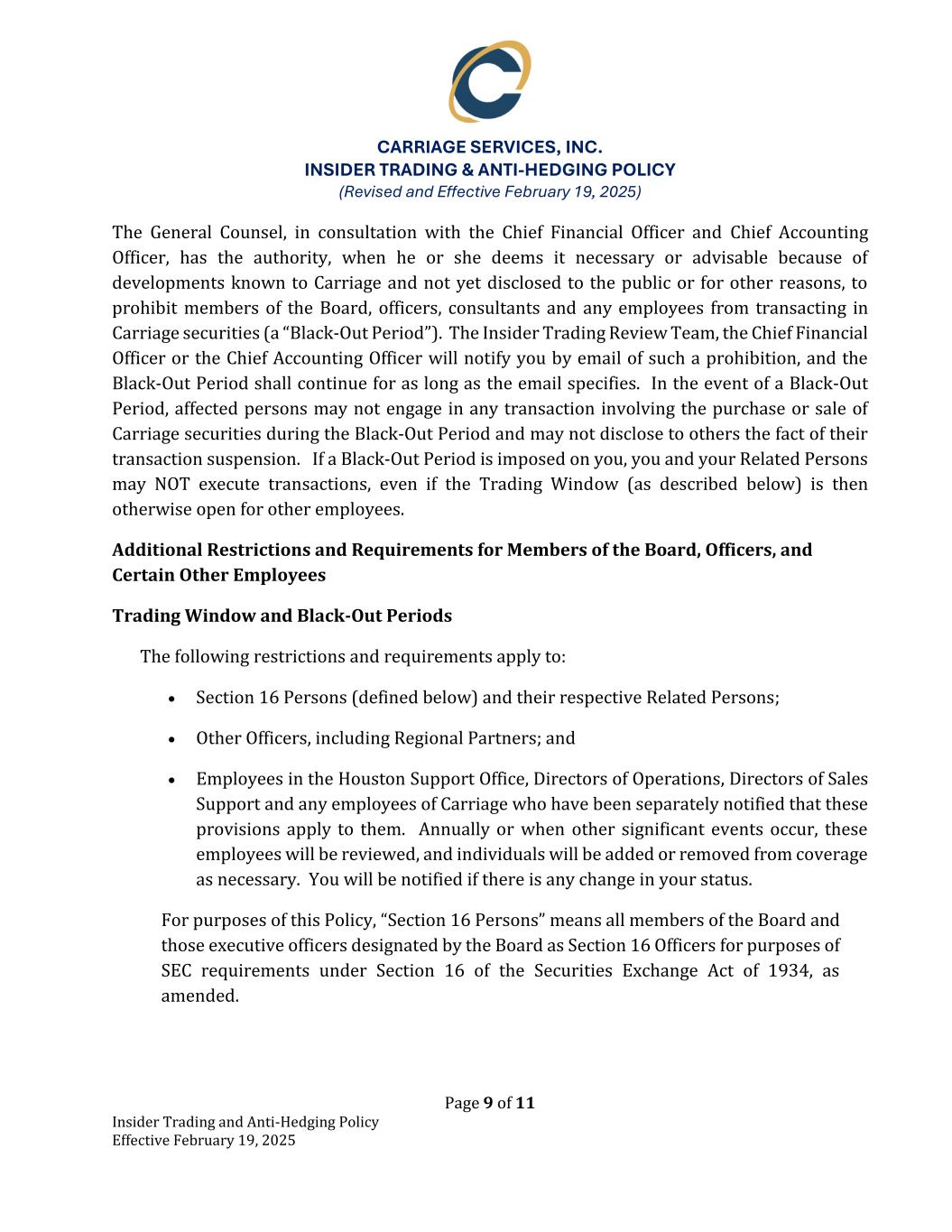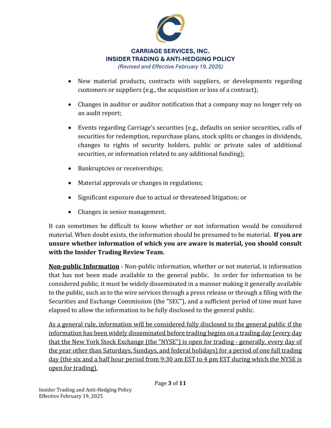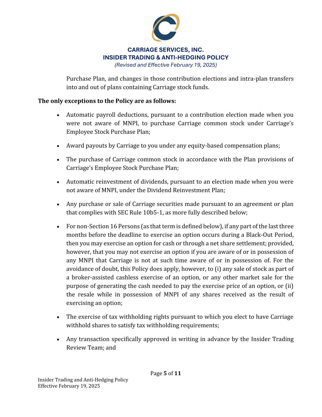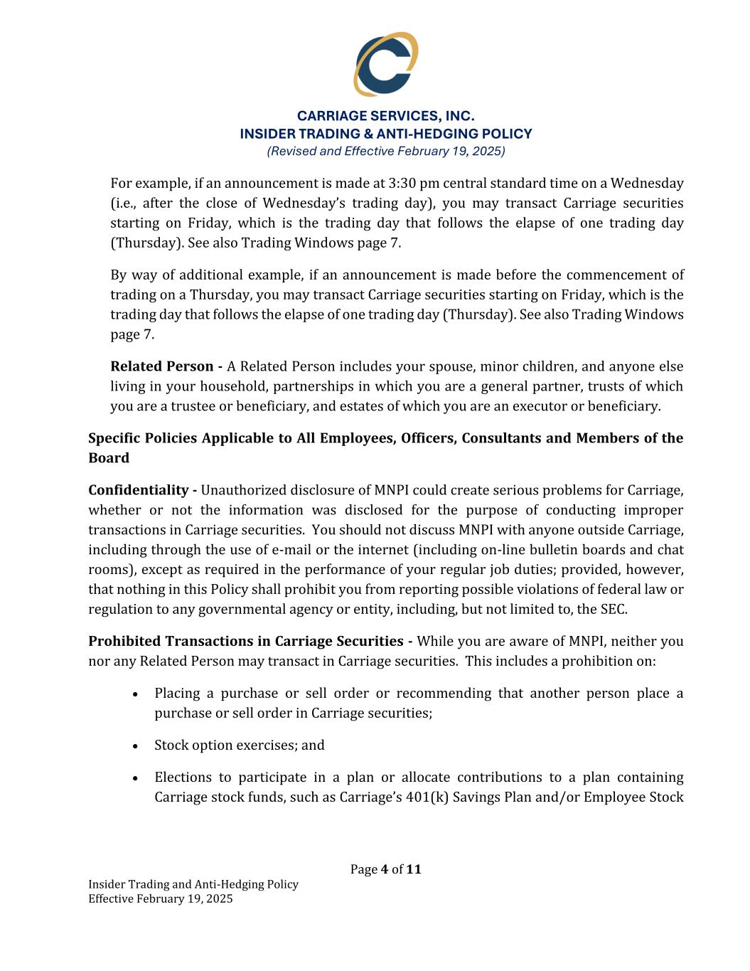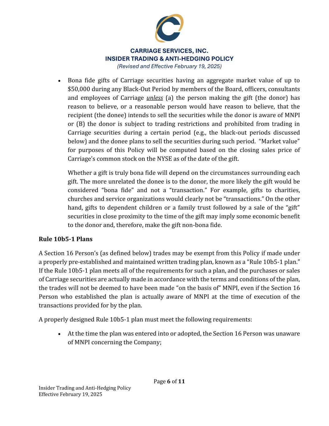0001016281false2024FYhttp://fasb.org/us-gaap/2024#DeferredCostsAndOtherAssetshttp://fasb.org/us-gaap/2024#DeferredCostsAndOtherAssetsP2YP1Y3.5P1YP9Yhttp://fasb.org/us-gaap/2024#PropertyPlantAndEquipmentNethttp://fasb.org/us-gaap/2024#PropertyPlantAndEquipmentNethttp://www.carriageservices.com/20241231#LeaseLiabilitiesAndDebtCurrenthttp://www.carriageservices.com/20241231#LeaseLiabilitiesAndDebtCurrenthttp://www.carriageservices.com/20241231#LeaseLiabilitiesAndDebtCurrenthttp://www.carriageservices.com/20241231#LeaseLiabilitiesAndDebtCurrentP1YP1YP2YP7Y431399iso4217:USDxbrli:sharesiso4217:USDxbrli:sharescsv:segmentxbrli:purecsv:numberOfOperatingLocationcsv:statecsv:divestiturecsv:cemeterycsv:funeral_homecsv:cemetarycsv:crematorycsv:letter_of_creditcsv:plan00010162812024-01-012024-12-3100010162812024-06-2800010162812025-02-2400010162812024-12-3100010162812023-12-310001016281us-gaap:SeniorNotesMember2024-12-310001016281us-gaap:SeniorNotesMember2023-12-310001016281csv:ServiceRevenueMember2024-01-012024-12-310001016281csv:ServiceRevenueMember2023-01-012023-12-310001016281csv:ServiceRevenueMember2022-01-012022-12-310001016281csv:PropertyandMerchandiseMember2024-01-012024-12-310001016281csv:PropertyandMerchandiseMember2023-01-012023-12-310001016281csv:PropertyandMerchandiseMember2022-01-012022-12-310001016281csv:OtherRevenueMember2024-01-012024-12-310001016281csv:OtherRevenueMember2023-01-012023-12-310001016281csv:OtherRevenueMember2022-01-012022-12-3100010162812023-01-012023-12-3100010162812022-01-012022-12-310001016281us-gaap:CommonStockMember2021-12-310001016281us-gaap:AdditionalPaidInCapitalMember2021-12-310001016281us-gaap:RetainedEarningsMember2021-12-310001016281us-gaap:TreasuryStockCommonMember2021-12-3100010162812021-12-310001016281us-gaap:RetainedEarningsMember2022-01-012022-12-310001016281us-gaap:CommonStockMember2022-01-012022-12-310001016281us-gaap:AdditionalPaidInCapitalMember2022-01-012022-12-310001016281us-gaap:TreasuryStockCommonMember2022-01-012022-12-310001016281us-gaap:CommonStockMember2022-12-310001016281us-gaap:AdditionalPaidInCapitalMember2022-12-310001016281us-gaap:RetainedEarningsMember2022-12-310001016281us-gaap:TreasuryStockCommonMember2022-12-3100010162812022-12-310001016281us-gaap:RetainedEarningsMember2023-01-012023-12-310001016281us-gaap:CommonStockMember2023-01-012023-12-310001016281us-gaap:AdditionalPaidInCapitalMember2023-01-012023-12-310001016281us-gaap:CommonStockMember2023-12-310001016281us-gaap:AdditionalPaidInCapitalMember2023-12-310001016281us-gaap:RetainedEarningsMember2023-12-310001016281us-gaap:TreasuryStockCommonMember2023-12-310001016281us-gaap:RetainedEarningsMember2024-01-012024-12-310001016281us-gaap:CommonStockMember2024-01-012024-12-310001016281us-gaap:AdditionalPaidInCapitalMember2024-01-012024-12-310001016281us-gaap:CommonStockMember2024-12-310001016281us-gaap:AdditionalPaidInCapitalMember2024-12-310001016281us-gaap:RetainedEarningsMember2024-12-310001016281us-gaap:TreasuryStockCommonMember2024-12-310001016281csv:FuneralHomesMember2024-12-310001016281csv:CemeteriesMember2024-12-310001016281us-gaap:OperatingSegmentsMembercsv:FuneralHomeMember2024-01-012024-12-310001016281us-gaap:OperatingSegmentsMembercsv:CemeteryMember2024-01-012024-12-310001016281csv:FuneralAndCemeteryMember2024-01-012024-12-310001016281csv:CemeteryMember2024-01-012024-12-310001016281csv:FuneralHomesMember2024-01-012024-12-310001016281csv:CemeteryMember2024-01-012024-12-310001016281srt:MinimumMemberus-gaap:SoftwareAndSoftwareDevelopmentCostsMember2024-12-310001016281srt:MaximumMemberus-gaap:SoftwareAndSoftwareDevelopmentCostsMember2024-12-310001016281srt:MinimumMemberus-gaap:BuildingAndBuildingImprovementsMember2024-12-310001016281srt:MaximumMemberus-gaap:BuildingAndBuildingImprovementsMember2024-12-310001016281srt:MinimumMemberus-gaap:FurnitureAndFixturesMember2024-12-310001016281srt:MaximumMemberus-gaap:FurnitureAndFixturesMember2024-12-310001016281srt:MinimumMemberus-gaap:MachineryAndEquipmentMember2024-12-310001016281srt:MaximumMemberus-gaap:MachineryAndEquipmentMember2024-12-310001016281srt:MinimumMemberus-gaap:AutomobilesMember2024-12-310001016281srt:MaximumMemberus-gaap:AutomobilesMember2024-12-310001016281us-gaap:LandMemberus-gaap:SegmentContinuingOperationsMember2024-12-310001016281us-gaap:LandMemberus-gaap:SegmentContinuingOperationsMember2023-12-310001016281us-gaap:BuildingAndBuildingImprovementsMemberus-gaap:SegmentContinuingOperationsMember2024-12-310001016281us-gaap:BuildingAndBuildingImprovementsMemberus-gaap:SegmentContinuingOperationsMember2023-12-310001016281csv:FurnitureEquipmentAndAutomobilesMemberus-gaap:SegmentContinuingOperationsMember2024-12-310001016281csv:FurnitureEquipmentAndAutomobilesMemberus-gaap:SegmentContinuingOperationsMember2023-12-310001016281us-gaap:SegmentContinuingOperationsMember2024-12-310001016281us-gaap:SegmentContinuingOperationsMember2023-12-310001016281us-gaap:SegmentDiscontinuedOperationsMember2024-12-310001016281us-gaap:SegmentDiscontinuedOperationsMember2023-12-310001016281csv:FuneralHomesAndCemeteriesMember2024-01-012024-12-310001016281csv:BakersfieldCaliforniaMember2023-12-310001016281csv:FuneralHomesMember2023-01-012023-12-310001016281csv:FuneralHomesMember2023-12-310001016281csv:CemeteriesMember2023-01-012023-12-310001016281csv:CemeteriesMember2023-12-310001016281srt:MinimumMember2024-12-310001016281srt:MaximumMember2024-12-310001016281csv:FuneralMember2024-12-310001016281csv:FuneralMember2023-12-3100010162812025-01-01csv:FuneralMember2024-12-310001016281csv:CemeteryMember2024-12-310001016281csv:CemeteryMember2023-12-3100010162812025-01-01csv:CemeteryMember2024-12-310001016281csv:BakersfieldCaliforniaMember2023-03-222023-03-220001016281csv:BakersfieldCaliforniaMember2023-03-220001016281csv:BakersfieldCaliforniaMember2023-03-232023-12-3100010162812023-03-232023-12-310001016281csv:BakersfieldCaliforniaMembercsv:BakersfieldCaliforniaMember2023-03-220001016281csv:FuneralMember2024-01-012024-12-310001016281csv:CemeteryMember2024