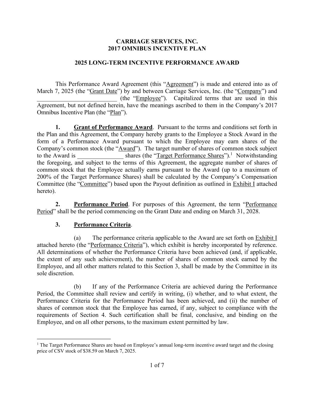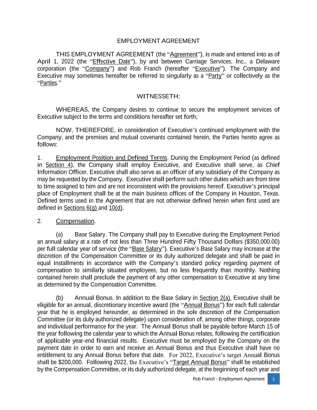 Rob Franch - Employment Agreement 1 EMPLOYMENT AGREEMENT THIS EMPLOYMENT AGREEMENT (the “Agreement”), is made and entered into as of April 1, 2022 (the “Effective Date”), by and between Carriage Services, Inc., a Delaware corporation (the “Company”) and Rob Franch (hereafter “Executive”). The Company and Executive may sometimes hereafter be referred to singularly as a “Party” or collectively as the “Parties.” WITNESSETH: WHEREAS, the Company desires to continue to secure the employment services of Executive subject to the terms and conditions hereafter set forth; NOW, THEREFORE, in consideration of Executive’s continued employment with the Company, and the premises and mutual covenants contained herein, the Parties hereto agree as follows: 1. Employment Position and Defined Terms. During the Employment Period (as defined in Section 4), the Company shall employ Executive, and Executive shall serve, as Chief Information Officer. Executive shall also serve as an officer of any subsidiary of the Company as may be requested by the Company. Executive shall perform such other duties which are from time to time assigned to him and are not inconsistent with the provisions hereof. Executive’s principal place of Employment shall be at the main business offices of the Company in Houston, Texas. Defined terms used in the Agreement that are not otherwise defined herein when first used are defined in Sections 6(g) and 10(d). 2. Compensation. (a) Base Salary. The Company shall pay to Executive during the Employment Period an annual salary at a rate of not less than Three Hundred Fifty Thousand Dollars ($350,000.00) per full calendar year of service (the “Base Salary”). Executive’s Base Salary may increase at the discretion of the Compensation Committee or its duly authorized delegate and shall be paid in equal installments in accordance with the Company’s standard policy regarding payment of compensation to similarly situated employees, but no less frequently than monthly. Nothing contained herein shall preclude the payment of any other compensation to Executive at any time as determined by the Compensation Committee. (b) Annual Bonus. In addition to the Base Salary in Section 2(a), Executive shall be eligible for an annual, discretionary incentive award (the “Annual Bonus”) for each full calendar year that he is employed hereunder, as determined in the sole discretion of the Compensation Committee (or its duly authorized delegate) upon consideration of, among other things, corporate and individual performance for the year. The Annual Bonus shall be payable before March 15 of the year following the calendar year to which the Annual Bonus relates, following the certification of applicable year-end financial results. Executive must be employed by the Company on the payment date in order to earn and receive an Annual Bonus and thus Executive shall have no entitlement to any Annual Bonus before that date. For 2022, Executive’s target Annual Bonus shall be $200,000. Following 2022, the Executive’s “Target Annual Bonus” shall be established by the Compensation Committee, or its duly authorized delegate, at the beginning of each year and