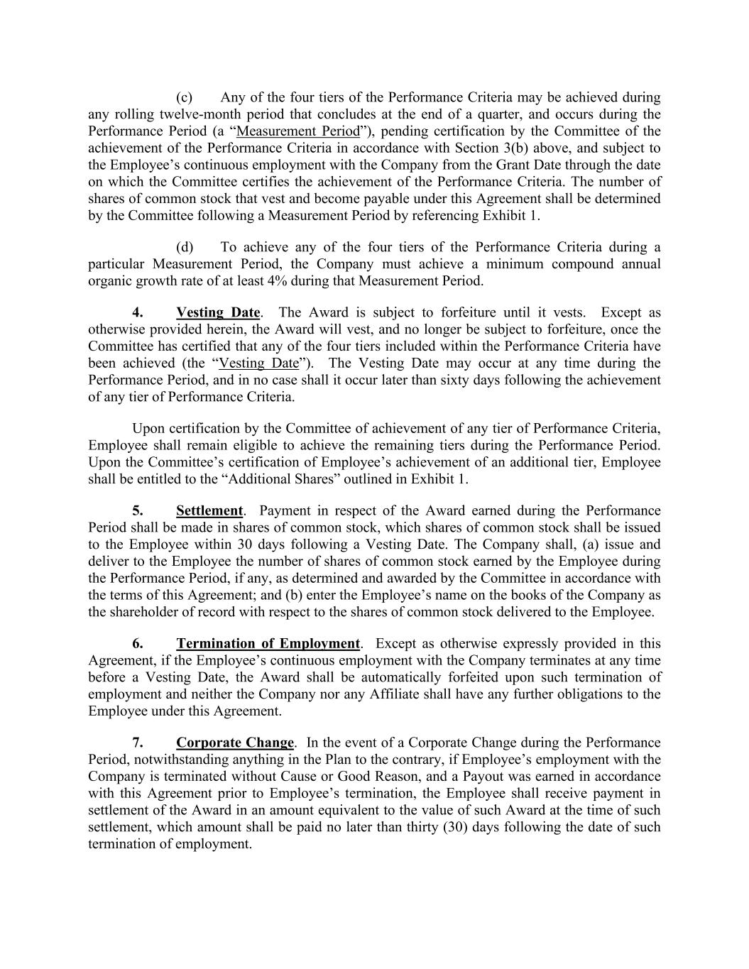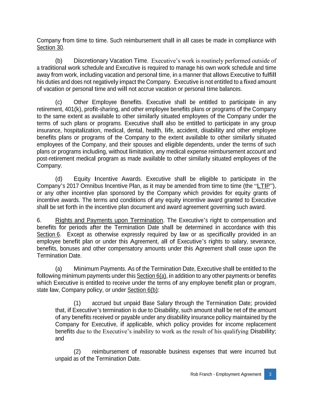 Rob Franch - Employment Agreement 3 Company from time to time. Such reimbursement shall in all cases be made in compliance with Section 30. (b) Discretionary Vacation Time. Executive’s work is routinely performed outside of a traditional work schedule and Executive is required to manage his own work schedule and time away from work, including vacation and personal time, in a manner that allows Executive to fulfill his duties and does not negatively impact the Company. Executive is not entitled to a fixed amount of vacation or personal time and will not accrue vacation or personal time balances. (c) Other Employee Benefits. Executive shall be entitled to participate in any retirement, 401(k), profit-sharing, and other employee benefits plans or programs of the Company to the same extent as available to other similarly situated employees of the Company under the terms of such plans or programs. Executive shall also be entitled to participate in any group insurance, hospitalization, medical, dental, health, life, accident, disability and other employee benefits plans or programs of the Company to the extent available to other similarly situated employees of the Company, and their spouses and eligible dependents, under the terms of such plans or programs including, without limitation, any medical expense reimbursement account and post-retirement medical program as made available to other similarly situated employees of the Company. (d) Equity Incentive Awards. Executive shall be eligible to participate in the Company’s 2017 Omnibus Incentive Plan, as it may be amended from time to time (the “LTIP”), or any other incentive plan sponsored by the Company which provides for equity grants of incentive awards. The terms and conditions of any equity incentive award granted to Executive shall be set forth in the incentive plan document and award agreement governing such award. 6. Rights and Payments upon Termination. The Executive’s right to compensation and benefits for periods after the Termination Date shall be determined in accordance with this Section 6. Except as otherwise expressly required by law or as specifically provided in an employee benefit plan or under this Agreement, all of Executive’s rights to salary, severance, benefits, bonuses and other compensatory amounts under this Agreement shall cease upon the Termination Date. (a) Minimum Payments. As of the Termination Date, Executive shall be entitled to the following minimum payments under this Section 6(a), in addition to any other payments or benefits which Executive is entitled to receive under the terms of any employee benefit plan or program, state law, Company policy, or under Section 6(b): (1) accrued but unpaid Base Salary through the Termination Date; provided that, if Executive’s termination is due to Disability, such amount shall be net of the amount of any benefits received or payable under any disability insurance policy maintained by the Company for Executive, if applicable, which policy provides for income replacement benefits due to the Executive’s inability to work as the result of his qualifying Disability; and (2) reimbursement of reasonable business expenses that were incurred but unpaid as of the Termination Date.