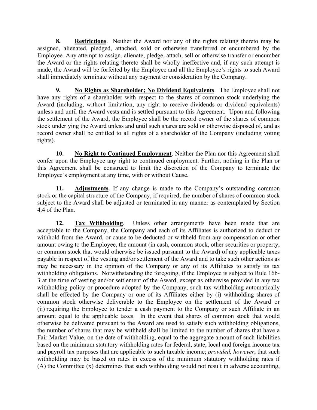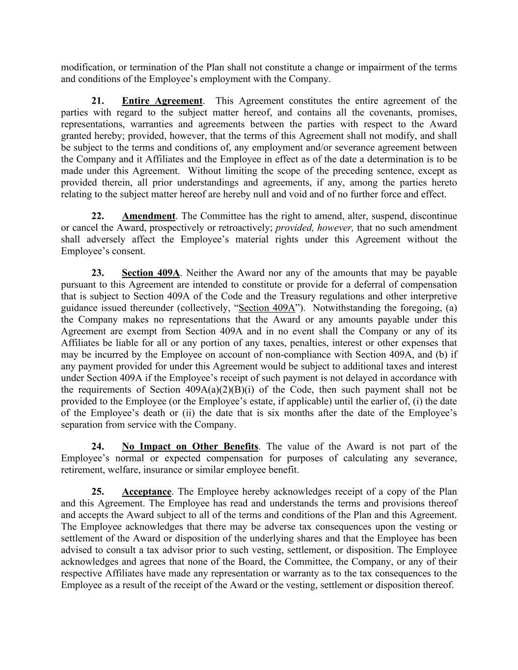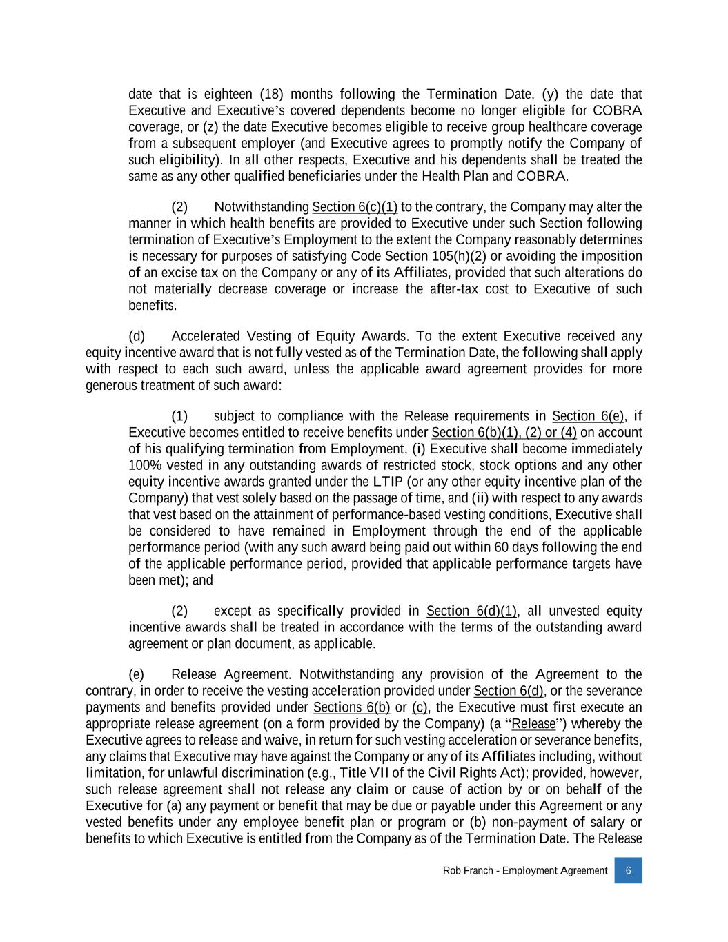 Rob Franch - Employment Agreement 6 date that is eighteen (18) months following the Termination Date, (y) the date that Executive and Executive’s covered dependents become no longer eligible for COBRA coverage, or (z) the date Executive becomes eligible to receive group healthcare coverage from a subsequent employer (and Executive agrees to promptly notify the Company of such eligibility). In all other respects, Executive and his dependents shall be treated the same as any other qualified beneficiaries under the Health Plan and COBRA. (2) Notwithstanding Section 6(c)(1) to the contrary, the Company may alter the manner in which health benefits are provided to Executive under such Section following termination of Executive’s Employment to the extent the Company reasonably determines is necessary for purposes of satisfying Code Section 105(h)(2) or avoiding the imposition of an excise tax on the Company or any of its Affiliates, provided that such alterations do not materially decrease coverage or increase the after-tax cost to Executive of such benefits. (d) Accelerated Vesting of Equity Awards. To the extent Executive received any equity incentive award that is not fully vested as of the Termination Date, the following shall apply with respect to each such award, unless the applicable award agreement provides for more generous treatment of such award: (1) subject to compliance with the Release requirements in Section 6(e), if Executive becomes entitled to receive benefits under Section 6(b)(1), (2) or (4) on account of his qualifying termination from Employment, (i) Executive shall become immediately 100% vested in any outstanding awards of restricted stock, stock options and any other equity incentive awards granted under the LTIP (or any other equity incentive plan of the Company) that vest solely based on the passage of time, and (ii) with respect to any awards that vest based on the attainment of performance-based vesting conditions, Executive shall be considered to have remained in Employment through the end of the applicable performance period (with any such award being paid out within 60 days following the end of the applicable performance period, provided that applicable performance targets have been met); and (2) except as specifically provided in Section 6(d)(1), all unvested equity incentive awards shall be treated in accordance with the terms of the outstanding award agreement or plan document, as applicable. (e) Release Agreement. Notwithstanding any provision of the Agreement to the contrary, in order to receive the vesting acceleration provided under Section 6(d), or the severance payments and benefits provided under Sections 6(b) or (c), the Executive must first execute an appropriate release agreement (on a form provided by the Company) (a “Release”) whereby the Executive agrees to release and waive, in return for such vesting acceleration or severance benefits, any claims that Executive may have against the Company or any of its Affiliates including, without limitation, for unlawful discrimination (e.g., Title VII of the Civil Rights Act); provided, however, such release agreement shall not release any claim or cause of action by or on behalf of the Executive for (a) any payment or benefit that may be due or payable under this Agreement or any vested benefits under any employee benefit plan or program or (b) non-payment of salary or benefits to which Executive is entitled from the Company as of the Termination Date. The Release