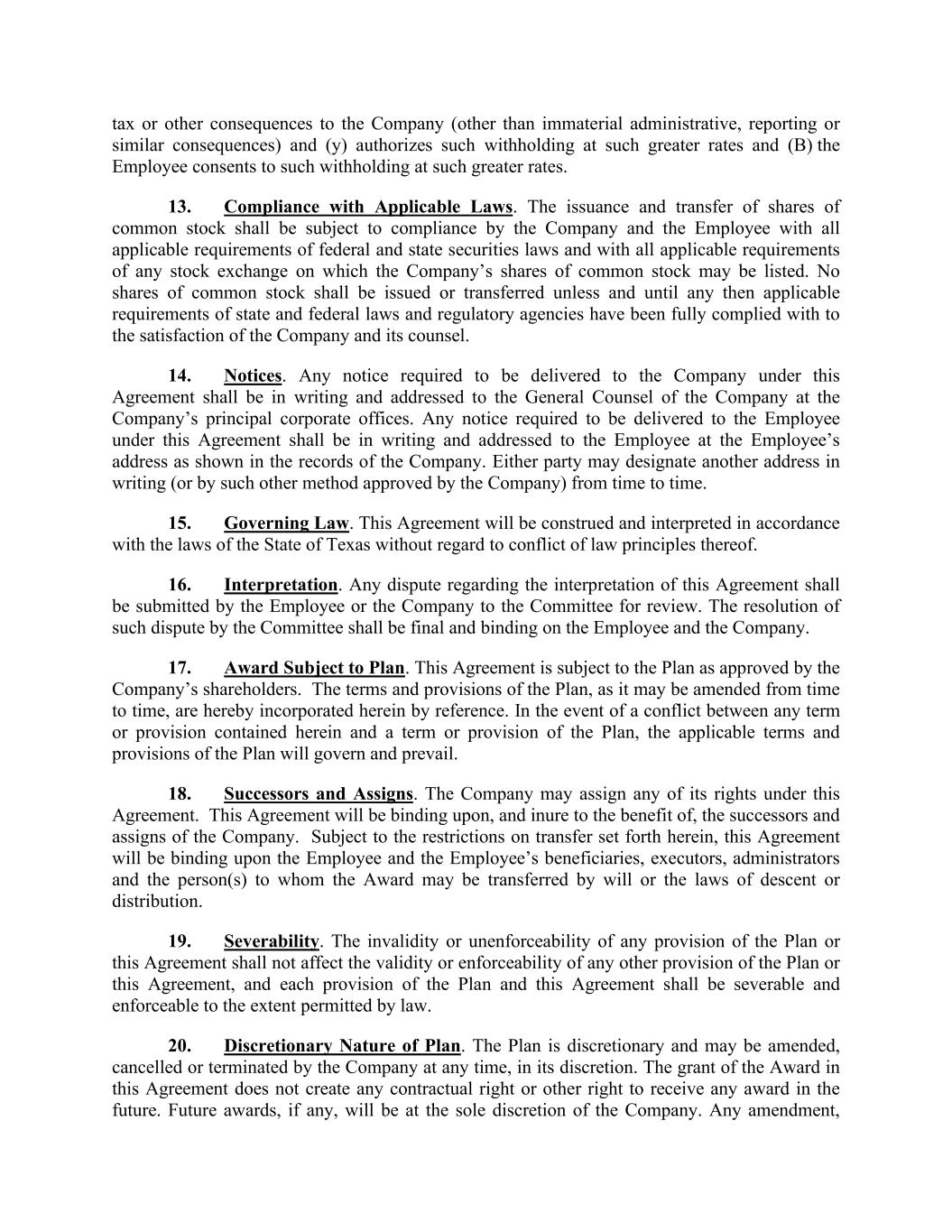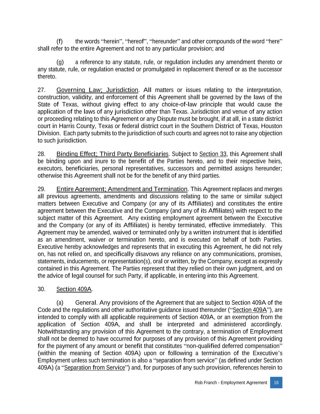 Rob Franch - Employment Agreement 16 (f) the words “herein”, “hereof”, “hereunder” and other compounds of the word “here” shall refer to the entire Agreement and not to any particular provision; and (g) a reference to any statute, rule, or regulation includes any amendment thereto or any statute, rule, or regulation enacted or promulgated in replacement thereof or as the successor thereto. 27. Governing Law; Jurisdiction. All matters or issues relating to the interpretation, construction, validity, and enforcement of this Agreement shall be governed by the laws of the State of Texas, without giving effect to any choice-of-law principle that would cause the application of the laws of any jurisdiction other than Texas. Jurisdiction and venue of any action or proceeding relating to this Agreement or any Dispute must be brought, if at all, in a state district court in Harris County, Texas or federal district court in the Southern District of Texas, Houston Division. Each party submits to the jurisdiction of such courts and agrees not to raise any objection to such jurisdiction. 28. Binding Effect; Third Party Beneficiaries. Subject to Section 33, this Agreement shall be binding upon and inure to the benefit of the Parties hereto, and to their respective heirs, executors, beneficiaries, personal representatives, successors and permitted assigns hereunder; otherwise this Agreement shall not be for the benefit of any third parties. 29. Entire Agreement; Amendment and Termination. This Agreement replaces and merges all previous agreements, amendments and discussions relating to the same or similar subject matters between Executive and Company (or any of its Affiliates) and constitutes the entire agreement between the Executive and the Company (and any of its Affiliates) with respect to the subject matter of this Agreement. Any existing employment agreement between the Executive and the Company (or any of its Affiliates) is hereby terminated, effective immediately. This Agreement may be amended, waived or terminated only by a written instrument that is identified as an amendment, waiver or termination hereto, and is executed on behalf of both Parties. Executive hereby acknowledges and represents that in executing this Agreement, he did not rely on, has not relied on, and specifically disavows any reliance on any communications, promises, statements, inducements, or representation(s), oral or written, by the Company, except as expressly contained in this Agreement. The Parties represent that they relied on their own judgment, and on the advice of legal counsel for such Party, if applicable, in entering into this Agreement. 30. Section 409A. (a) General. Any provisions of the Agreement that are subject to Section 409A of the Code and the regulations and other authoritative guidance issued thereunder (“Section 409A”), are intended to comply with all applicable requirements of Section 409A, or an exemption from the application of Section 409A, and shall be interpreted and administered accordingly. Notwithstanding any provision of this Agreement to the contrary, a termination of Employment shall not be deemed to have occurred for purposes of any provision of this Agreement providing for the payment of any amount or benefit that constitutes “non-qualified deferred compensation” (within the meaning of Section 409A) upon or following a termination of the Executive’s Employment unless such termination is also a “separation from service” (as defined under Section 409A) (a “Separation from Service”) and, for purposes of any such provision, references herein to