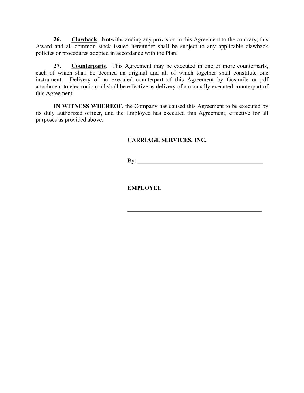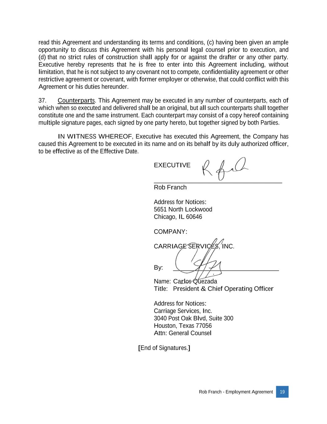 Rob Franch - Employment Agreement 19 read this Agreement and understanding its terms and conditions, (c) having been given an ample opportunity to discuss this Agreement with his personal legal counsel prior to execution, and (d) that no strict rules of construction shall apply for or against the drafter or any other party. Executive hereby represents that he is free to enter into this Agreement including, without limitation, that he is not subject to any covenant not to compete, confidentiality agreement or other restrictive agreement or covenant, with former employer or otherwise, that could conflict with this Agreement or his duties hereunder. 37. Counterparts. This Agreement may be executed in any number of counterparts, each of which when so executed and delivered shall be an original, but all such counterparts shall together constitute one and the same instrument. Each counterpart may consist of a copy hereof containing multiple signature pages, each signed by one party hereto, but together signed by both Parties. IN WITNESS WHEREOF, Executive has executed this Agreement, the Company has caused this Agreement to be executed in its name and on its behalf by its duly authorized officer, to be effective as of the Effective Date. EXECUTIVE: ________________________________________ Rob Franch Address for Notices: 5651 North Lockwood Chicago, IL 60646 COMPANY: CARRIAGE SERVICES, INC. By: _________________________________ Name: Carlos Quezada Title: President & Chief Operating Officer Address for Notices: Carriage Services, Inc. 3040 Post Oak Blvd, Suite 300 Houston, Texas 77056 Attn: General Counsel [End of Signatures.]