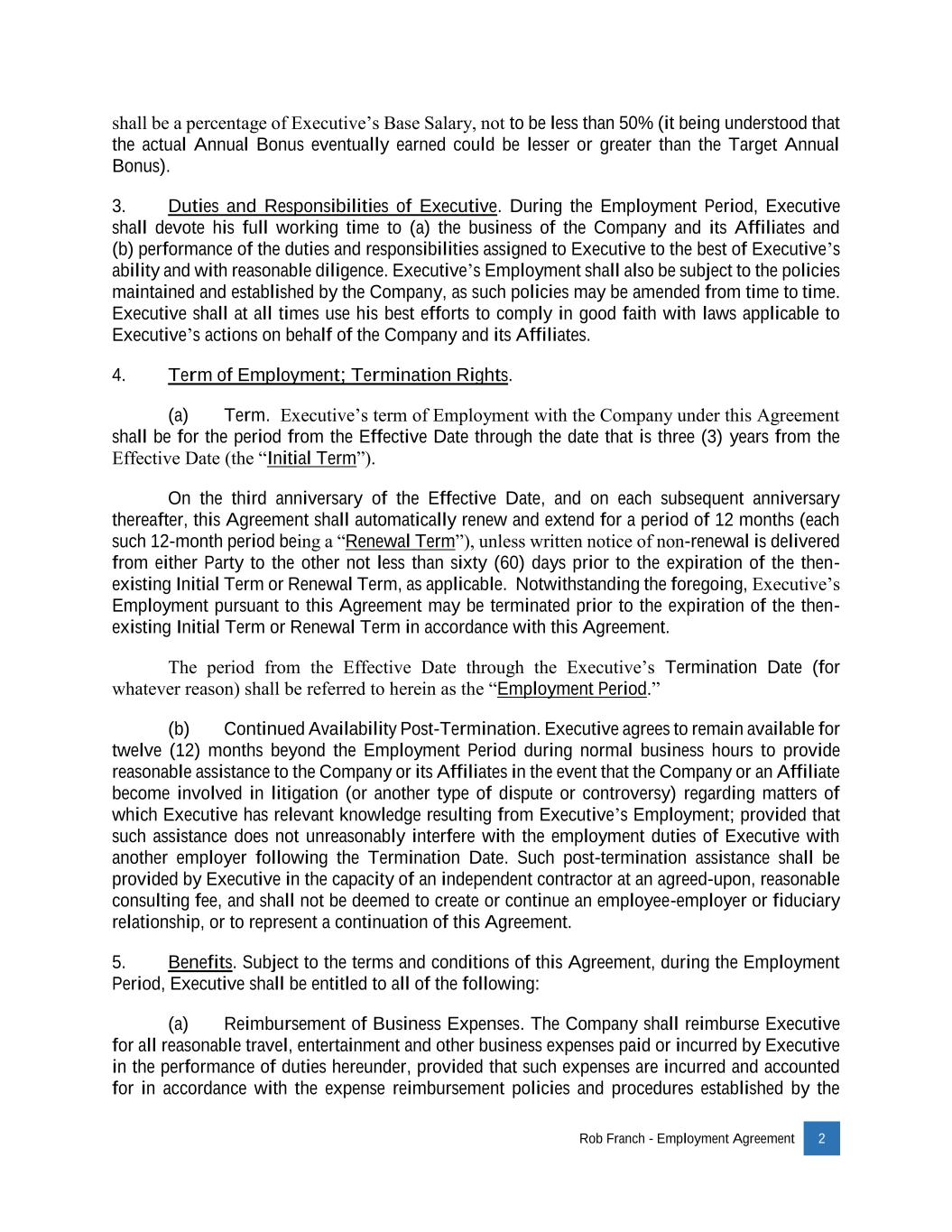 Rob Franch - Employment Agreement 2 shall be a percentage of Executive’s Base Salary, not to be less than 50% (it being understood that the actual Annual Bonus eventually earned could be lesser or greater than the Target Annual Bonus). 3. Duties and Responsibilities of Executive. During the Employment Period, Executive shall devote his full working time to (a) the business of the Company and its Affiliates and (b) performance of the duties and responsibilities assigned to Executive to the best of Executive’s ability and with reasonable diligence. Executive’s Employment shall also be subject to the policies maintained and established by the Company, as such policies may be amended from time to time. Executive shall at all times use his best efforts to comply in good faith with laws applicable to Executive’s actions on behalf of the Company and its Affiliates. 4. Term of Employment; Termination Rights. (a) Term. Executive’s term of Employment with the Company under this Agreement shall be for the period from the Effective Date through the date that is three (3) years from the Effective Date (the “Initial Term”). On the third anniversary of the Effective Date, and on each subsequent anniversary thereafter, this Agreement shall automatically renew and extend for a period of 12 months (each such 12-month period being a “Renewal Term”), unless written notice of non-renewal is delivered from either Party to the other not less than sixty (60) days prior to the expiration of the then- existing Initial Term or Renewal Term, as applicable. Notwithstanding the foregoing, Executive’s Employment pursuant to this Agreement may be terminated prior to the expiration of the then- existing Initial Term or Renewal Term in accordance with this Agreement. The period from the Effective Date through the Executive’s Termination Date (for whatever reason) shall be referred to herein as the “Employment Period.” (b) Continued Availability Post-Termination. Executive agrees to remain available for twelve (12) months beyond the Employment Period during normal business hours to provide reasonable assistance to the Company or its Affiliates in the event that the Company or an Affiliate become involved in litigation (or another type of dispute or controversy) regarding matters of which Executive has relevant knowledge resulting from Executive’s Employment; provided that such assistance does not unreasonably interfere with the employment duties of Executive with another employer following the Termination Date. Such post-termination assistance shall be provided by Executive in the capacity of an independent contractor at an agreed-upon, reasonable consulting fee, and shall not be deemed to create or continue an employee-employer or fiduciary relationship, or to represent a continuation of this Agreement. 5. Benefits. Subject to the terms and conditions of this Agreement, during the Employment Period, Executive shall be entitled to all of the following: (a) Reimbursement of Business Expenses. The Company shall reimburse Executive for all reasonable travel, entertainment and other business expenses paid or incurred by Executive in the performance of duties hereunder, provided that such expenses are incurred and accounted for in accordance with the expense reimbursement policies and procedures established by the
