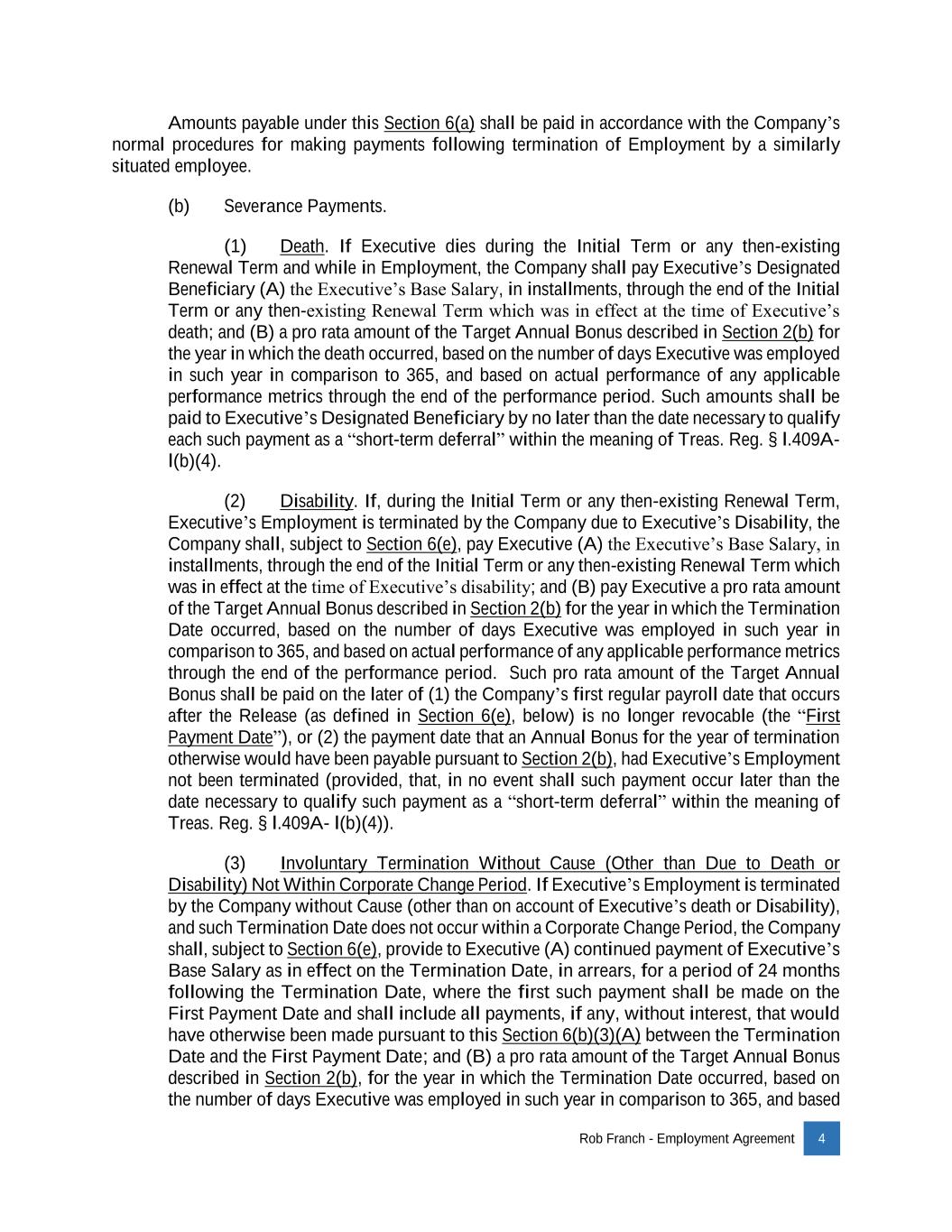 Rob Franch - Employment Agreement 4 Amounts payable under this Section 6(a) shall be paid in accordance with the Company’s normal procedures for making payments following termination of Employment by a similarly situated employee. (b) Severance Payments. (1) Death. If Executive dies during the Initial Term or any then-existing Renewal Term and while in Employment, the Company shall pay Executive’s Designated Beneficiary (A) the Executive’s Base Salary, in installments, through the end of the Initial Term or any then-existing Renewal Term which was in effect at the time of Executive’s death; and (B) a pro rata amount of the Target Annual Bonus described in Section 2(b) for the year in which the death occurred, based on the number of days Executive was employed in such year in comparison to 365, and based on actual performance of any applicable performance metrics through the end of the performance period. Such amounts shall be paid to Executive’s Designated Beneficiary by no later than the date necessary to qualify each such payment as a “short-term deferral” within the meaning of Treas. Reg. § l.409A l(b)(4). (2) Disability. If, during the Initial Term or any then-existing Renewal Term, Executive’s Employment is terminated by the Company due to Executive’s Disability, the Company shall, subject to Section 6(e), pay Executive (A) the Executive’s Base Salary, in installments, through the end of the Initial Term or any then-existing Renewal Term which was in effect at the time of Executive’s disability; and (B) pay Executive a pro rata amount of the Target Annual Bonus described in Section 2(b) for the year in which the Termination Date occurred, based on the number of days Executive was employed in such year in comparison to 365, and based on actual performance of any applicable performance metrics through the end of the performance period. Such pro rata amount of the Target Annual Bonus shall be paid on the later of (1) the Company’s first regular payroll date that occurs after the Release (as defined in Section 6(e), below) is no longer revocable (the “First Payment Date”), or (2) the payment date that an Annual Bonus for the year of termination otherwise would have been payable pursuant to Section 2(b), had Executive’s Employment not been terminated (provided, that, in no event shall such payment occur later than the date necessary to qualify such payment as a “short-term deferral” within the meaning of Treas. Reg. § l.409A l(b)(4)). (3) Involuntary Termination Without Cause (Other than Due to Death or Disability) Not Within Corporate Change Period. If Executive’s Employment is terminated by the Company without Cause (other than on account of Executive’s death or Disability), and such Termination Date does not occur within a Corporate Change Period, the Company shall, subject to Section 6(e), provide to Executive (A) continued payment of Executive’s Base Salary as in effect on the Termination Date, in arrears, for a period of 24 months following the Termination Date, where the first such payment shall be made on the First Payment Date and shall include all payments, if any, without interest, that would have otherwise been made pursuant to this Section 6(b)(3)(A) between the Termination Date and the First Payment Date; and (B) a pro rata amount of the Target Annual Bonus described in Section 2(b), for the year in which the Termination Date occurred, based on the number of days Executive was employed in such year in comparison to 365, and based