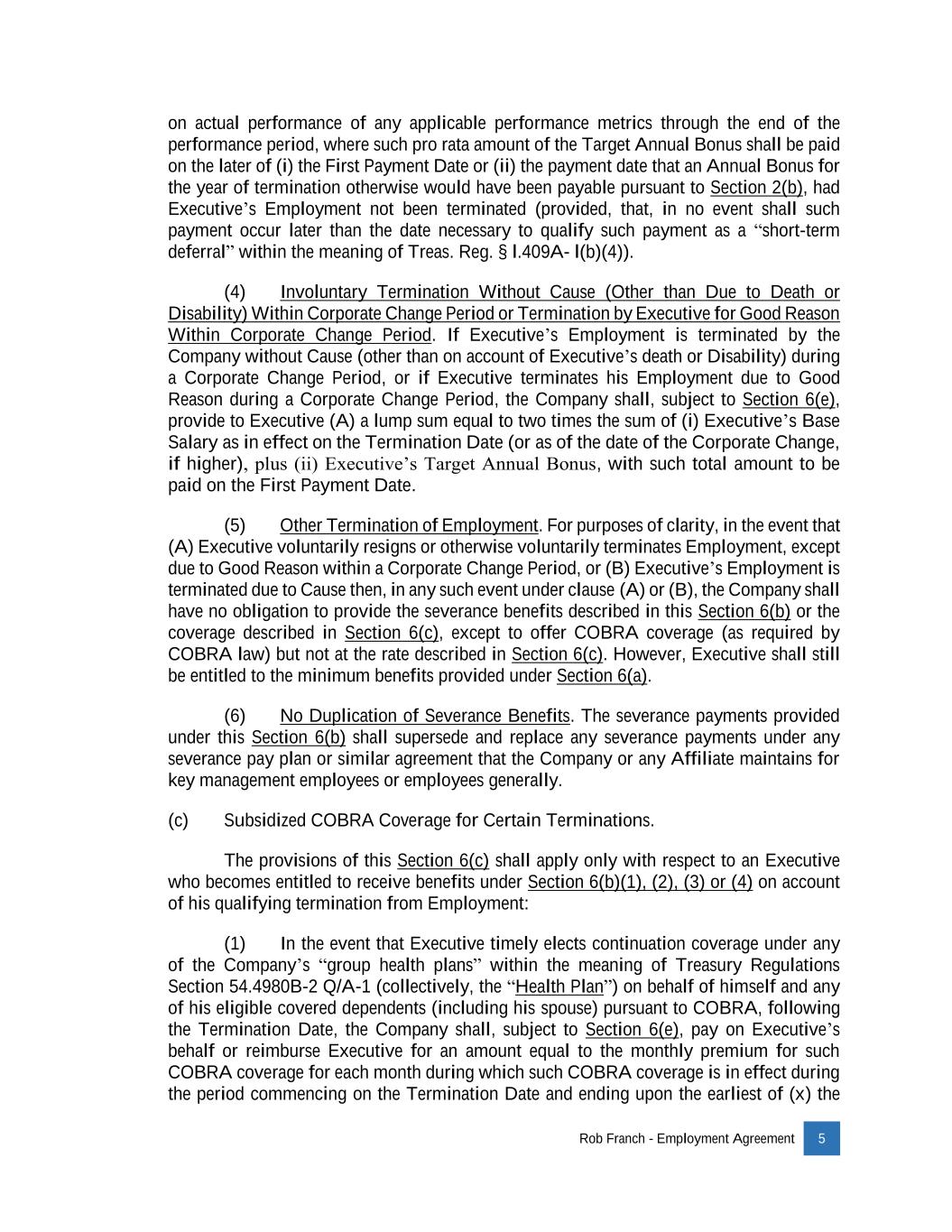 Rob Franch - Employment Agreement 5 on actual performance of any applicable performance metrics through the end of the performance period, where such pro rata amount of the Target Annual Bonus shall be paid on the later of (i) the First Payment Date or (ii) the payment date that an Annual Bonus for the year of termination otherwise would have been payable pursuant to Section 2(b), had Executive’s Employment not been terminated (provided, that, in no event shall such payment occur later than the date necessary to qualify such payment as a “short-term deferral” within the meaning of Treas. Reg. § l.409A l(b)(4)). (4) Involuntary Termination Without Cause (Other than Due to Death or Disability) Within Corporate Change Period or Termination by Executive for Good Reason Within Corporate Change Period. If Executive’s Employment is terminated by the Company without Cause (other than on account of Executive’s death or Disability) during a Corporate Change Period, or if Executive terminates his Employment due to Good Reason during a Corporate Change Period, the Company shall, subject to Section 6(e), provide to Executive (A) a lump sum equal to two times the sum of (i) Executive’s Base Salary as in effect on the Termination Date (or as of the date of the Corporate Change, if higher), plus (ii) Executive’s Target Annual Bonus, with such total amount to be paid on the First Payment Date. (5) Other Termination of Employment. For purposes of clarity, in the event that (A) Executive voluntarily resigns or otherwise voluntarily terminates Employment, except due to Good Reason within a Corporate Change Period, or (B) Executive’s Employment is terminated due to Cause then, in any such event under clause (A) or (B), the Company shall have no obligation to provide the severance benefits described in this Section 6(b) or the coverage described in Section 6(c), except to offer COBRA coverage (as required by COBRA law) but not at the rate described in Section 6(c). However, Executive shall still be entitled to the minimum benefits provided under Section 6(a). (6) No Duplication of Severance Benefits. The severance payments provided under this Section 6(b) shall supersede and replace any severance payments under any severance pay plan or similar agreement that the Company or any Affiliate maintains for key management employees or employees generally. (c) Subsidized COBRA Coverage for Certain Terminations. The provisions of this Section 6(c) shall apply only with respect to an Executive who becomes entitled to receive benefits under Section 6(b)(1), (2), (3) or (4) on account of his qualifying termination from Employment: (1) In the event that Executive timely elects continuation coverage under any of the Company’s “group health plans” within the meaning of Treasury Regulations Section 54.4980B-2 Q/A-1 (collectively, the “Health Plan”) on behalf of himself and any of his eligible covered dependents (including his spouse) pursuant to COBRA, following the Termination Date, the Company shall, subject to Section 6(e), pay on Executive’s behalf or reimburse Executive for an amount equal to the monthly premium for such COBRA coverage for each month during which such COBRA coverage is in effect during the period commencing on the Termination Date and ending upon the earliest of (x) the