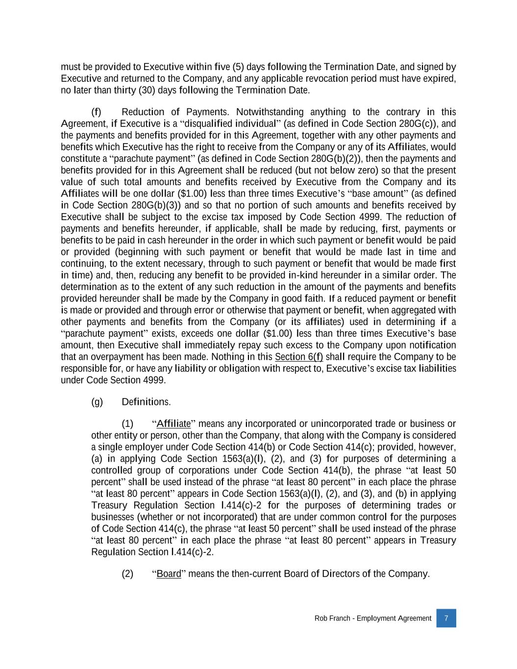 Rob Franch - Employment Agreement 7 must be provided to Executive within five (5) days following the Termination Date, and signed by Executive and returned to the Company, and any applicable revocation period must have expired, no later than thirty (30) days following the Termination Date. (f) Reduction of Payments. Notwithstanding anything to the contrary in this Agreement, if Executive is a “disqualified individual” (as defined in Code Section 280G(c)), and the payments and benefits provided for in this Agreement, together with any other payments and benefits which Executive has the right to receive from the Company or any of its Affiliates, would constitute a “parachute payment” (as defined in Code Section 280G(b)(2)), then the payments and benefits provided for in this Agreement shall be reduced (but not below zero) so that the present value of such total amounts and benefits received by Executive from the Company and its Affiliates will be one dollar ($1.00) less than three times Executive’s “base amount” (as defined in Code Section 280G(b)(3)) and so that no portion of such amounts and benefits received by Executive shall be subject to the excise tax imposed by Code Section 4999. The reduction of payments and benefits hereunder, if applicable, shall be made by reducing, first, payments or benefits to be paid in cash hereunder in the order in which such payment or benefit would be paid or provided (beginning with such payment or benefit that would be made last in time and continuing, to the extent necessary, through to such payment or benefit that would be made first in time) and, then, reducing any benefit to be provided in-kind hereunder in a similar order. The determination as to the extent of any such reduction in the amount of the payments and benefits provided hereunder shall be made by the Company in good faith. If a reduced payment or benefit is made or provided and through error or otherwise that payment or benefit, when aggregated with other payments and benefits from the Company (or its affiliates) used in determining if a “parachute payment” exists, exceeds one dollar ($1.00) less than three times Executive’s base amount, then Executive shall immediately repay such excess to the Company upon notification that an overpayment has been made. Nothing in this Section 6(f) shall require the Company to be responsible for, or have any liability or obligation with respect to, Executive’s excise tax liabilities under Code Section 4999. (g) Definitions. (1) “Affiliate” means any incorporated or unincorporated trade or business or other entity or person, other than the Company, that along with the Company is considered a single employer under Code Section 414(b) or Code Section 414(c); provided, however, (a) in applying Code Section 1563(a)(l), (2), and (3) for purposes of determining a controlled group of corporations under Code Section 414(b), the phrase “at least 50 percent” shall be used instead of the phrase “at least 80 percent” in each place the phrase “at least 80 percent” appears in Code Section 1563(a)(l), (2), and (3), and (b) in applying Treasury Regulation Section l.414(c)-2 for the purposes of determining trades or businesses (whether or not incorporated) that are under common control for the purposes of Code Section 414(c), the phrase “at least 50 percent” shall be used instead of the phrase “at least 80 percent” in each place the phrase “at least 80 percent” appears in Treasury Regulation Section l.414(c)-2. (2) “Board” means the then-current Board of Directors of the Company.