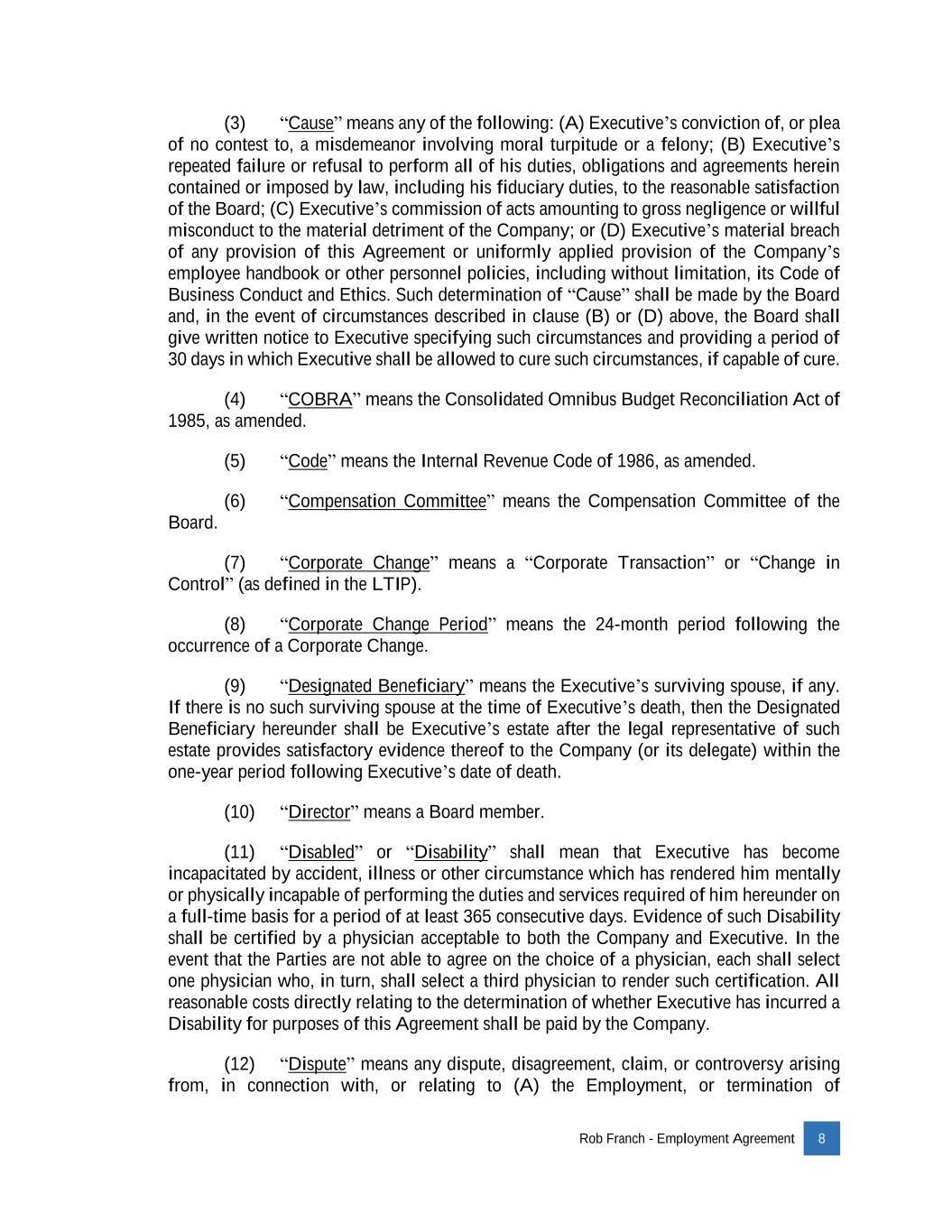 Rob Franch - Employment Agreement 8 (3) “Cause” means any of the following: (A) Executive’s conviction of, or plea of no contest to, a misdemeanor involving moral turpitude or a felony; (B) Executive’s repeated failure or refusal to perform all of his duties, obligations and agreements herein contained or imposed by law, including his fiduciary duties, to the reasonable satisfaction of the Board; (C) Executive’s commission of acts amounting to gross negligence or willful misconduct to the material detriment of the Company; or (D) Executive’s material breach of any provision of this Agreement or uniformly applied provision of the Company’s employee handbook or other personnel policies, including without limitation, its Code of Business Conduct and Ethics. Such determination of “Cause” shall be made by the Board and, in the event of circumstances described in clause (B) or (D) above, the Board shall give written notice to Executive specifying such circumstances and providing a period of 30 days in which Executive shall be allowed to cure such circumstances, if capable of cure. (4) “COBRA” means the Consolidated Omnibus Budget Reconciliation Act of 1985, as amended. (5) “Code” means the Internal Revenue Code of 1986, as amended. (6) “Compensation Committee” means the Compensation Committee of the Board. (7) “Corporate Change” means a “Corporate Transaction” or “Change in Control” (as defined in the LTIP). (8) “Corporate Change Period” means the 24-month period following the occurrence of a Corporate Change. (9) “Designated Beneficiary” means the Executive’s surviving spouse, if any. If there is no such surviving spouse at the time of Executive’s death, then the Designated Beneficiary hereunder shall be Executive’s estate after the legal representative of such estate provides satisfactory evidence thereof to the Company (or its delegate) within the one-year period following Executive’s date of death. (10) “Director” means a Board member. (11) “Disabled” or “Disability” shall mean that Executive has become incapacitated by accident, illness or other circumstance which has rendered him mentally or physically incapable of performing the duties and services required of him hereunder on a full-time basis for a period of at least 365 consecutive days. Evidence of such Disability shall be certified by a physician acceptable to both the Company and Executive. In the event that the Parties are not able to agree on the choice of a physician, each shall select one physician who, in turn, shall select a third physician to render such certification. All reasonable costs directly relating to the determination of whether Executive has incurred a Disability for purposes of this Agreement shall be paid by the Company. (12) “Dispute” means any dispute, disagreement, claim, or controversy arising from, in connection with, or relating to (A) the Employment, or termination of