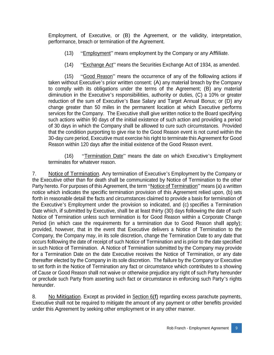 Rob Franch - Employment Agreement 9 Employment, of Executive, or (B) the Agreement, or the validity, interpretation, performance, breach or termination of the Agreement. (13) “Employment” means employment by the Company or any Affiliate. (14) “Exchange Act” means the Securities Exchange Act of 1934, as amended. (15) “Good Reason” means the occurrence of any of the following actions if taken without Executive’s prior written consent: (A) any material breach by the Company to comply with its obligations under the terms of the Agreement; (B) any material diminution in the Executive’s responsibilities, authority or duties, (C) a 10% or greater reduction of the sum of Executive’s Base Salary and Target Annual Bonus; or (D) any change greater than 50 miles in the permanent location at which Executive performs services for the Company. The Executive shall give written notice to the Board specifying such actions within 90 days of the initial existence of such action and providing a period of 30 days in which the Company shall be allowed to cure such circumstances. Provided that the condition purporting to give rise to the Good Reason event is not cured within the 30-day cure period, Executive must exercise his right to terminate this Agreement for Good Reason within 120 days after the initial existence of the Good Reason event. (16) “Termination Date” means the date on which Executive’s Employment terminates for whatever reason. 7. Notice of Termination. Any termination of Executive’s Employment by the Company or the Executive other than for death shall be communicated by Notice of Termination to the other Party hereto. For purposes of this Agreement, the term “Notice of Termination” means (a) a written notice which indicates the specific termination provision of this Agreement relied upon, (b) sets forth in reasonable detail the facts and circumstances claimed to provide a basis for termination of the Executive’s Employment under the provision so indicated, and (c) specifies a Termination Date which, if submitted by Executive, shall be at least thirty (30) days following the date of such Notice of Termination unless such termination is for Good Reason within a Corporate Change Period (in which case the requirements for a termination due to Good Reason shall apply); provided, however, that in the event that Executive delivers a Notice of Termination to the Company, the Company may, in its sole discretion, change the Termination Date to any date that occurs following the date of receipt of such Notice of Termination and is prior to the date specified in such Notice of Termination. A Notice of Termination submitted by the Company may provide for a Termination Date on the date Executive receives the Notice of Termination, or any date thereafter elected by the Company in its sole discretion. The failure by the Company or Executive to set forth in the Notice of Termination any fact or circumstance which contributes to a showing of Cause or Good Reason shall not waive or otherwise prejudice any right of such Party hereunder or preclude such Party from asserting such fact or circumstance in enforcing such Party’s rights hereunder. 8. No Mitigation. Except as provided in Section 6(f) regarding excess parachute payments, Executive shall not be required to mitigate the amount of any payment or other benefits provided under this Agreement by seeking other employment or in any other manner.