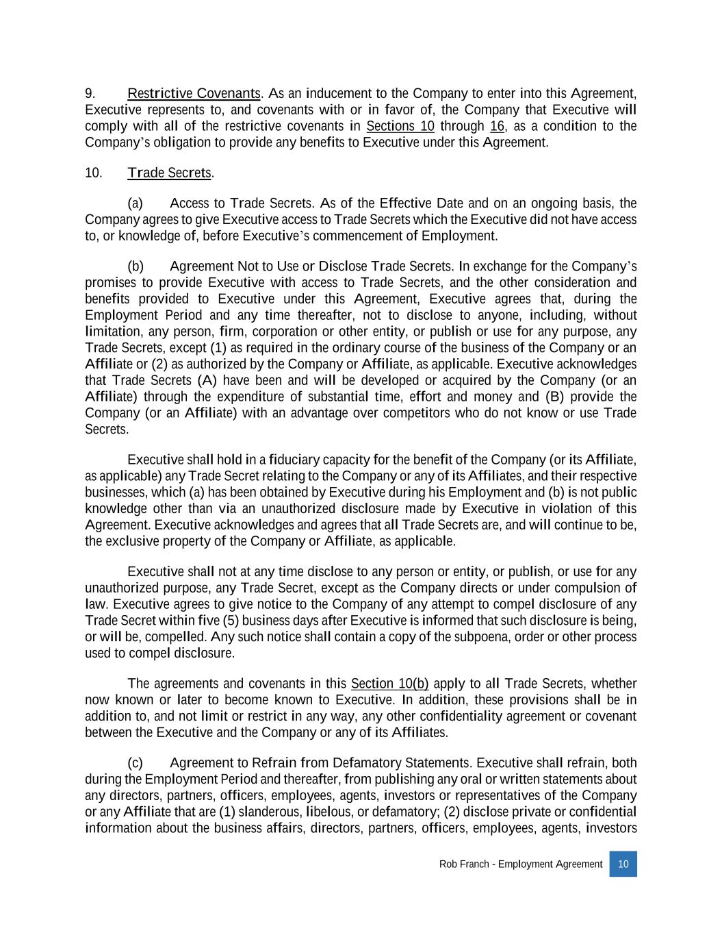 Rob Franch - Employment Agreement 10 9. Restrictive Covenants. As an inducement to the Company to enter into this Agreement, Executive represents to, and covenants with or in favor of, the Company that Executive will comply with all of the restrictive covenants in Sections 10 through 16, as a condition to the Company’s obligation to provide any benefits to Executive under this Agreement. 10. Trade Secrets. (a) Access to Trade Secrets. As of the Effective Date and on an ongoing basis, the Company agrees to give Executive access to Trade Secrets which the Executive did not have access to, or knowledge of, before Executive’s commencement of Employment. (b) Agreement Not to Use or Disclose Trade Secrets. In exchange for the Company’s promises to provide Executive with access to Trade Secrets, and the other consideration and benefits provided to Executive under this Agreement, Executive agrees that, during the Employment Period and any time thereafter, not to disclose to anyone, including, without limitation, any person, firm, corporation or other entity, or publish or use for any purpose, any Trade Secrets, except (1) as required in the ordinary course of the business of the Company or an Affiliate or (2) as authorized by the Company or Affiliate, as applicable. Executive acknowledges that Trade Secrets (A) have been and will be developed or acquired by the Company (or an Affiliate) through the expenditure of substantial time, effort and money and (B) provide the Company (or an Affiliate) with an advantage over competitors who do not know or use Trade Secrets. Executive shall hold in a fiduciary capacity for the benefit of the Company (or its Affiliate, as applicable) any Trade Secret relating to the Company or any of its Affiliates, and their respective businesses, which (a) has been obtained by Executive during his Employment and (b) is not public knowledge other than via an unauthorized disclosure made by Executive in violation of this Agreement. Executive acknowledges and agrees that all Trade Secrets are, and will continue to be, the exclusive property of the Company or Affiliate, as applicable. Executive shall not at any time disclose to any person or entity, or publish, or use for any unauthorized purpose, any Trade Secret, except as the Company directs or under compulsion of law. Executive agrees to give notice to the Company of any attempt to compel disclosure of any Trade Secret within five (5) business days after Executive is informed that such disclosure is being, or will be, compelled. Any such notice shall contain a copy of the subpoena, order or other process used to compel disclosure. The agreements and covenants in this Section 10(b) apply to all Trade Secrets, whether now known or later to become known to Executive. In addition, these provisions shall be in addition to, and not limit or restrict in any way, any other confidentiality agreement or covenant between the Executive and the Company or any of its Affiliates. (c) Agreement to Refrain from Defamatory Statements. Executive shall refrain, both during the Employment Period and thereafter, from publishing any oral or written statements about any directors, partners, officers, employees, agents, investors or representatives of the Company or any Affiliate that are (1) slanderous, libelous, or defamatory; (2) disclose private or confidential information about the business affairs, directors, partners, officers, employees, agents, investors