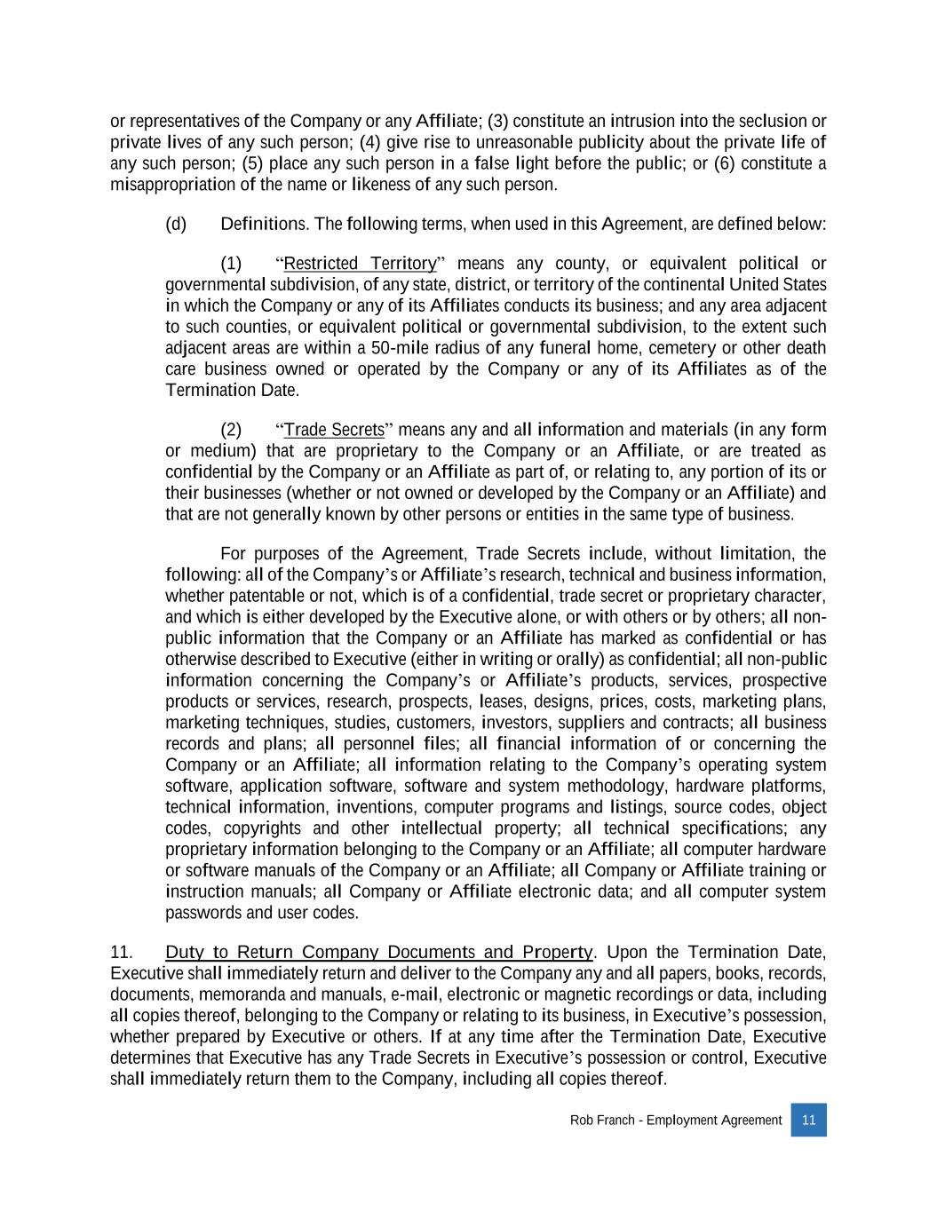 Rob Franch - Employment Agreement 11 or representatives of the Company or any Affiliate; (3) constitute an intrusion into the seclusion or private lives of any such person; (4) give rise to unreasonable publicity about the private life of any such person; (5) place any such person in a false light before the public; or (6) constitute a misappropriation of the name or likeness of any such person. (d) Definitions. The following terms, when used in this Agreement, are defined below: (1) “Restricted Territory” means any county, or equivalent political or governmental subdivision, of any state, district, or territory of the continental United States in which the Company or any of its Affiliates conducts its business; and any area adjacent to such counties, or equivalent political or governmental subdivision, to the extent such adjacent areas are within a 50-mile radius of any funeral home, cemetery or other death care business owned or operated by the Company or any of its Affiliates as of the Termination Date. (2) “Trade Secrets” means any and all information and materials (in any form or medium) that are proprietary to the Company or an Affiliate, or are treated as confidential by the Company or an Affiliate as part of, or relating to, any portion of its or their businesses (whether or not owned or developed by the Company or an Affiliate) and that are not generally known by other persons or entities in the same type of business. For purposes of the Agreement, Trade Secrets include, without limitation, the following: all of the Company’s or Affiliate’s research, technical and business information, whether patentable or not, which is of a confidential, trade secret or proprietary character, and which is either developed by the Executive alone, or with others or by others; all non- public information that the Company or an Affiliate has marked as confidential or has otherwise described to Executive (either in writing or orally) as confidential; all non-public information concerning the Company’s or Affiliate’s products, services, prospective products or services, research, prospects, leases, designs, prices, costs, marketing plans, marketing techniques, studies, customers, investors, suppliers and contracts; all business records and plans; all personnel files; all financial information of or concerning the Company or an Affiliate; all information relating to the Company’s operating system software, application software, software and system methodology, hardware platforms, technical information, inventions, computer programs and listings, source codes, object codes, copyrights and other intellectual property; all technical specifications; any proprietary information belonging to the Company or an Affiliate; all computer hardware or software manuals of the Company or an Affiliate; all Company or Affiliate training or instruction manuals; all Company or Affiliate electronic data; and all computer system passwords and user codes. 11. Duty to Return Company Documents and Property. Upon the Termination Date, Executive shall immediately return and deliver to the Company any and all papers, books, records, documents, memoranda and manuals, e-mail, electronic or magnetic recordings or data, including all copies thereof, belonging to the Company or relating to its business, in Executive’s possession, whether prepared by Executive or others. If at any time after the Termination Date, Executive determines that Executive has any Trade Secrets in Executive’s possession or control, Executive shall immediately return them to the Company, including all copies thereof.