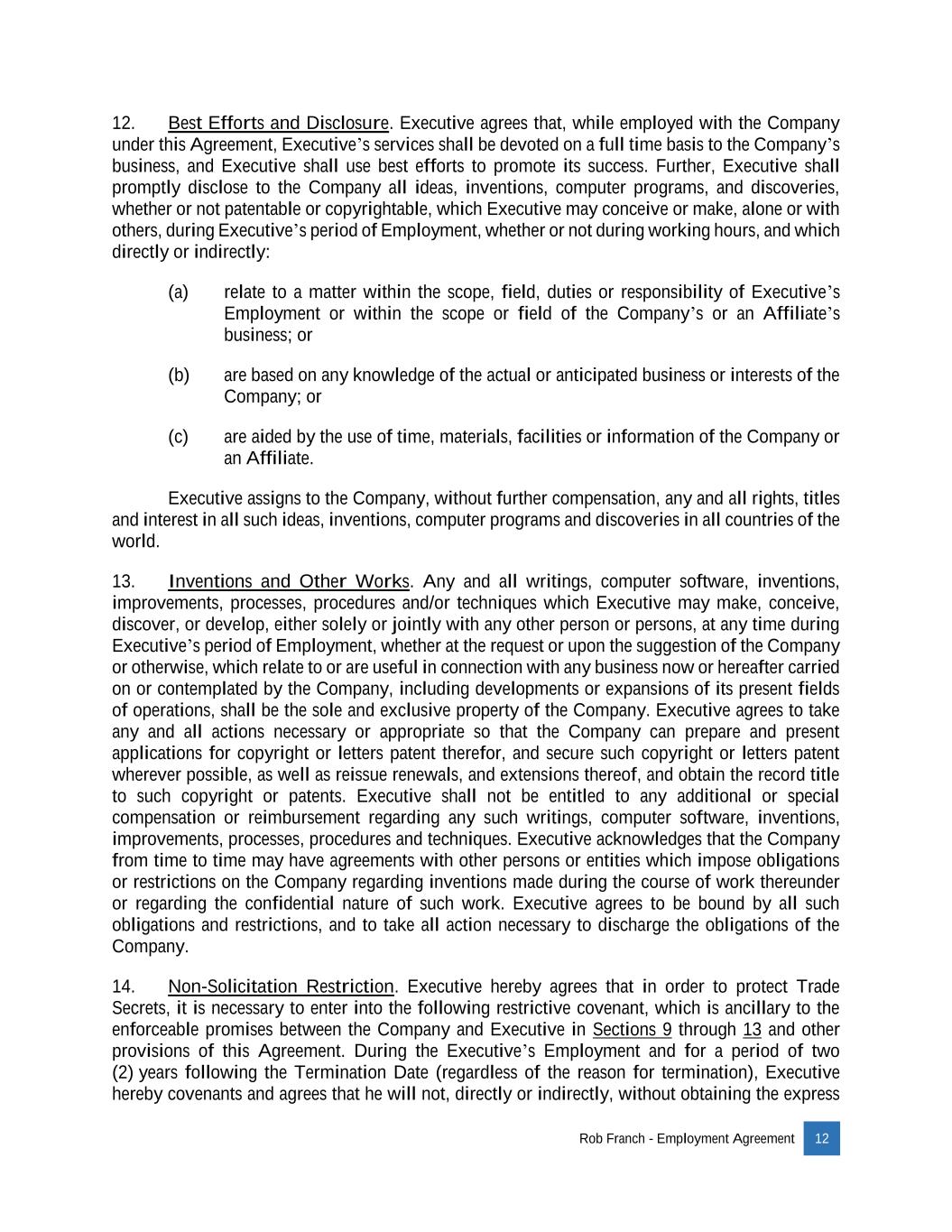 Rob Franch - Employment Agreement 12 12. Best Efforts and Disclosure. Executive agrees that, while employed with the Company under this Agreement, Executive’s services shall be devoted on a full time basis to the Company’s business, and Executive shall use best efforts to promote its success. Further, Executive shall promptly disclose to the Company all ideas, inventions, computer programs, and discoveries, whether or not patentable or copyrightable, which Executive may conceive or make, alone or with others, during Executive’s period of Employment, whether or not during working hours, and which directly or indirectly: (a) relate to a matter within the scope, field, duties or responsibility of Executive’s Employment or within the scope or field of the Company’s or an Affiliate’s business; or (b) are based on any knowledge of the actual or anticipated business or interests of the Company; or (c) are aided by the use of time, materials, facilities or information of the Company or an Affiliate. Executive assigns to the Company, without further compensation, any and all rights, titles and interest in all such ideas, inventions, computer programs and discoveries in all countries of the world. 13. Inventions and Other Works. Any and all writings, computer software, inventions, improvements, processes, procedures and/or techniques which Executive may make, conceive, discover, or develop, either solely or jointly with any other person or persons, at any time during Executive’s period of Employment, whether at the request or upon the suggestion of the Company or otherwise, which relate to or are useful in connection with any business now or hereafter carried on or contemplated by the Company, including developments or expansions of its present fields of operations, shall be the sole and exclusive property of the Company. Executive agrees to take any and all actions necessary or appropriate so that the Company can prepare and present applications for copyright or letters patent therefor, and secure such copyright or letters patent wherever possible, as well as reissue renewals, and extensions thereof, and obtain the record title to such copyright or patents. Executive shall not be entitled to any additional or special compensation or reimbursement regarding any such writings, computer software, inventions, improvements, processes, procedures and techniques. Executive acknowledges that the Company from time to time may have agreements with other persons or entities which impose obligations or restrictions on the Company regarding inventions made during the course of work thereunder or regarding the confidential nature of such work. Executive agrees to be bound by all such obligations and restrictions, and to take all action necessary to discharge the obligations of the Company. 14. Non-Solicitation Restriction. Executive hereby agrees that in order to protect Trade Secrets, it is necessary to enter into the following restrictive covenant, which is ancillary to the enforceable promises between the Company and Executive in Sections 9 through 13 and other provisions of this Agreement. During the Executive’s Employment and for a period of two (2) years following the Termination Date (regardless of the reason for termination), Executive hereby covenants and agrees that he will not, directly or indirectly, without obtaining the express