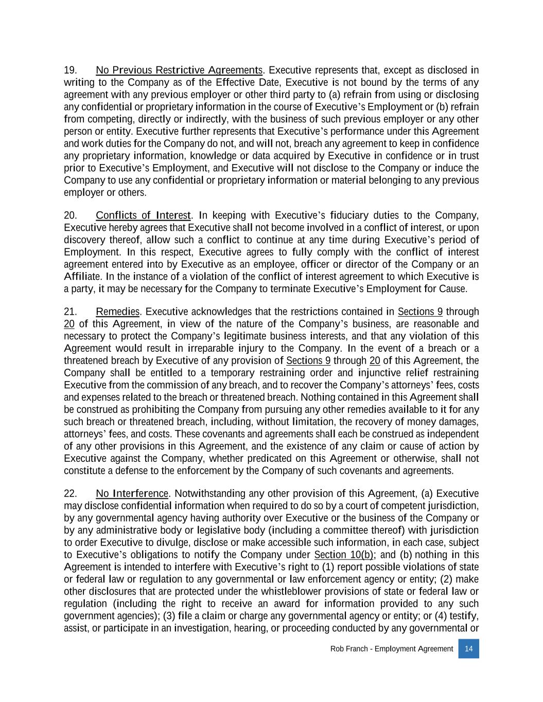 Rob Franch - Employment Agreement 14 19. No Previous Restrictive Agreements. Executive represents that, except as disclosed in writing to the Company as of the Effective Date, Executive is not bound by the terms of any agreement with any previous employer or other third party to (a) refrain from using or disclosing any confidential or proprietary information in the course of Executive’s Employment or (b) refrain from competing, directly or indirectly, with the business of such previous employer or any other person or entity. Executive further represents that Executive’s performance under this Agreement and work duties for the Company do not, and will not, breach any agreement to keep in confidence any proprietary information, knowledge or data acquired by Executive in confidence or in trust prior to Executive’s Employment, and Executive will not disclose to the Company or induce the Company to use any confidential or proprietary information or material belonging to any previous employer or others. 20. Conflicts of Interest. In keeping with Executive’s fiduciary duties to the Company, Executive hereby agrees that Executive shall not become involved in a conflict of interest, or upon discovery thereof, allow such a conflict to continue at any time during Executive’s period of Employment. In this respect, Executive agrees to fully comply with the conflict of interest agreement entered into by Executive as an employee, officer or director of the Company or an Affiliate. In the instance of a violation of the conflict of interest agreement to which Executive is a party, it may be necessary for the Company to terminate Executive’s Employment for Cause. 21. Remedies. Executive acknowledges that the restrictions contained in Sections 9 through 20 of this Agreement, in view of the nature of the Company’s business, are reasonable and necessary to protect the Company’s legitimate business interests, and that any violation of this Agreement would result in irreparable injury to the Company. In the event of a breach or a threatened breach by Executive of any provision of Sections 9 through 20 of this Agreement, the Company shall be entitled to a temporary restraining order and injunctive relief restraining Executive from the commission of any breach, and to recover the Company’s attorneys’ fees, costs and expenses related to the breach or threatened breach. Nothing contained in this Agreement shall be construed as prohibiting the Company from pursuing any other remedies available to it for any such breach or threatened breach, including, without limitation, the recovery of money damages, attorneys’ fees, and costs. These covenants and agreements shall each be construed as independent of any other provisions in this Agreement, and the existence of any claim or cause of action by Executive against the Company, whether predicated on this Agreement or otherwise, shall not constitute a defense to the enforcement by the Company of such covenants and agreements. 22. No Interference. Notwithstanding any other provision of this Agreement, (a) Executive may disclose confidential information when required to do so by a court of competent jurisdiction, by any governmental agency having authority over Executive or the business of the Company or by any administrative body or legislative body (including a committee thereof) with jurisdiction to order Executive to divulge, disclose or make accessible such information, in each case, subject to Executive’s obligations to notify the Company under Section 10(b); and (b) nothing in this Agreement is intended to interfere with Executive’s right to (1) report possible violations of state or federal law or regulation to any governmental or law enforcement agency or entity; (2) make other disclosures that are protected under the whistleblower provisions of state or federal law or regulation (including the right to receive an award for information provided to any such government agencies); (3) file a claim or charge any governmental agency or entity; or (4) testify, assist, or participate in an investigation, hearing, or proceeding conducted by any governmental or