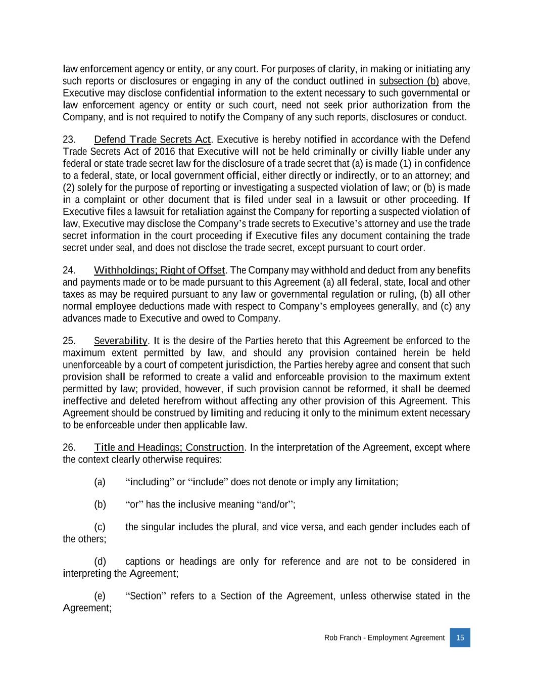 Rob Franch - Employment Agreement 15 law enforcement agency or entity, or any court. For purposes of clarity, in making or initiating any such reports or disclosures or engaging in any of the conduct outlined in subsection (b) above, Executive may disclose confidential information to the extent necessary to such governmental or law enforcement agency or entity or such court, need not seek prior authorization from the Company, and is not required to notify the Company of any such reports, disclosures or conduct. 23. Defend Trade Secrets Act. Executive is hereby notified in accordance with the Defend Trade Secrets Act of 2016 that Executive will not be held criminally or civilly liable under any federal or state trade secret law for the disclosure of a trade secret that (a) is made (1) in confidence to a federal, state, or local government official, either directly or indirectly, or to an attorney; and (2) solely for the purpose of reporting or investigating a suspected violation of law; or (b) is made in a complaint or other document that is filed under seal in a lawsuit or other proceeding. If Executive files a lawsuit for retaliation against the Company for reporting a suspected violation of law, Executive may disclose the Company’s trade secrets to Executive’s attorney and use the trade secret information in the court proceeding if Executive files any document containing the trade secret under seal, and does not disclose the trade secret, except pursuant to court order. 24. Withholdings; Right of Offset. The Company may withhold and deduct from any benefits and payments made or to be made pursuant to this Agreement (a) all federal, state, local and other taxes as may be required pursuant to any law or governmental regulation or ruling, (b) all other normal employee deductions made with respect to Company’s employees generally, and (c) any advances made to Executive and owed to Company. 25. Severability. It is the desire of the Parties hereto that this Agreement be enforced to the maximum extent permitted by law, and should any provision contained herein be held unenforceable by a court of competent jurisdiction, the Parties hereby agree and consent that such provision shall be reformed to create a valid and enforceable provision to the maximum extent permitted by law; provided, however, if such provision cannot be reformed, it shall be deemed ineffective and deleted herefrom without affecting any other provision of this Agreement. This Agreement should be construed by limiting and reducing it only to the minimum extent necessary to be enforceable under then applicable law. 26. Title and Headings; Construction. In the interpretation of the Agreement, except where the context clearly otherwise requires: (a) “including” or “include” does not denote or imply any limitation; (b) “or” has the inclusive meaning “and/or”; (c) the singular includes the plural, and vice versa, and each gender includes each of the others; (d) captions or headings are only for reference and are not to be considered in interpreting the Agreement; (e) “Section” refers to a Section of the Agreement, unless otherwise stated in the Agreement;