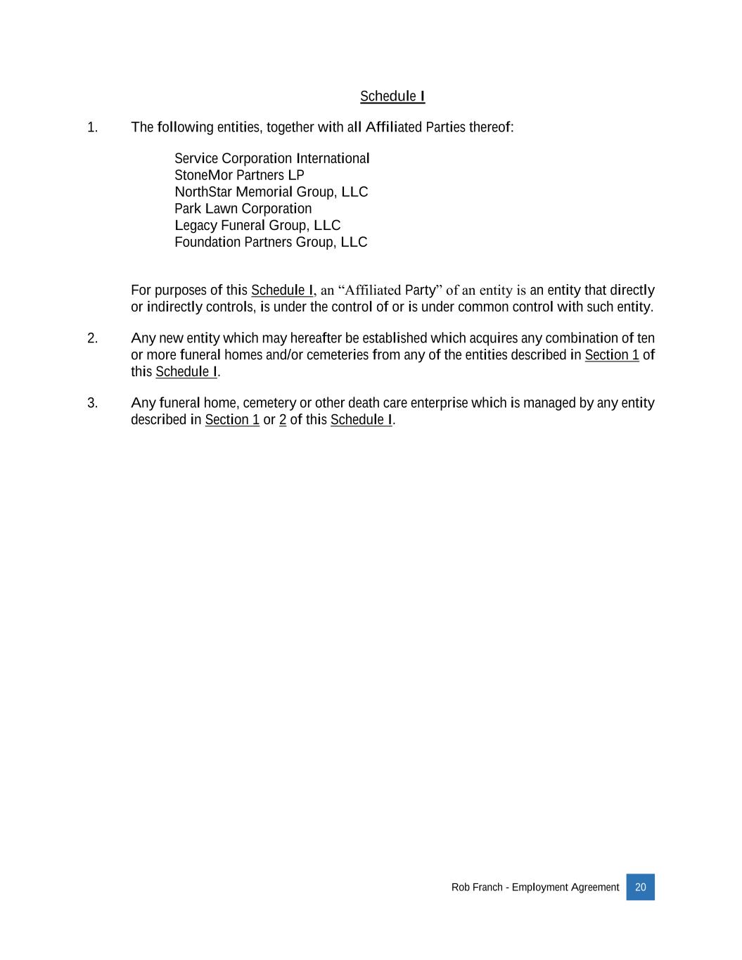Rob Franch - Employment Agreement 20 Schedule I 1. The following entities, together with all Affiliated Parties thereof: Service Corporation International StoneMor Partners LP NorthStar Memorial Group, LLC Park Lawn Corporation Legacy Funeral Group, LLC Foundation Partners Group, LLC For purposes of this Schedule I, an “Affiliated Party” of an entity is an entity that directly or indirectly controls, is under the control of or is under common control with such entity. 2. Any new entity which may hereafter be established which acquires any combination of ten or more funeral homes and/or cemeteries from any of the entities described in Section 1 of this Schedule I. 3. Any funeral home, cemetery or other death care enterprise which is managed by any entity described in Section 1 or 2 of this Schedule I.