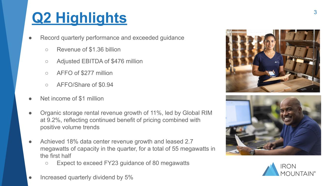 FOR IMMEDIATE RELEASE Iron Mountain Reports Second Quarter Results -- Net Income of $1 million; Achieves record quarterly Revenue and Adjusted EBITDA -- -- Increases quarterly dividend per share by 5% -- PORTSMOUTH, N.H. – August 3, 2023 – Iron Mountain Incorporated (NYSE: IRM), a global leader in innovative storage, data center infrastructure, asset lifecycle management and information management services, announces financial and operating results for the second quarter of 2023. The conference call / webcast details, earnings call presentation and supplemental financial information, which includes definitions of certain capitalized terms used in this release, are available on Iron Mountain’s Investor Relations website. Reconciliations of non-GAAP measures to the appropriate GAAP measures are included herein. "We are pleased to have delivered strong performance in the second quarter, resulting in all-time record Revenue and Adjusted EBITDA," said William L. Meaney, President and CEO of Iron Mountain. "The dedication and drive of our team is unwavering. We remain grateful to our Mountaineers for their service to our customers, which has delivered these outstanding results today. The resilience of our business model and the success of Project Matterhorn are fueling our sustained growth trajectory." Financial Performance Highlights for the Second Quarter of 2023 ($ in millions, except per share data) Three Months Ended Y/Y % Change Year to Date Y/Y % Change 6/30/23 6/30/22 Reported $ Constant Fx 6/30/23 6/30/22 Reported $ Constant Fx Storage Rental Revenue $831 $753 10% 11% $1,641 $1,504 9% 11% Service Revenue $527 $536 (2)% (1)% $1,031 $1,033 — 1% Total Revenue $1,358 $1,290 5% 6% $2,672 $2,538 5% 7% Net Income $1 $202 (99)% $67 $244 (73)% Reported EPS $0.00 $0.68 (100)% $0.22 $0.83 (73)% Adjusted EPS $0.40 $0.46 (13)% $0.83 $0.85 (2)% Adjusted EBITDA $476 $455 5% 5% $936 $886 6% 7% Adjusted EBITDA Margin 35.0% 35.3% (30) bps 35.0% 34.9% 10 bps AFFO $277 $271 2% $561 $535 5% AFFO per share $0.94 $0.93 1% $1.91 $1.83 4% 1