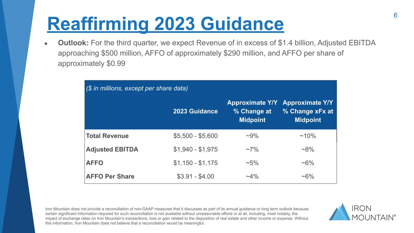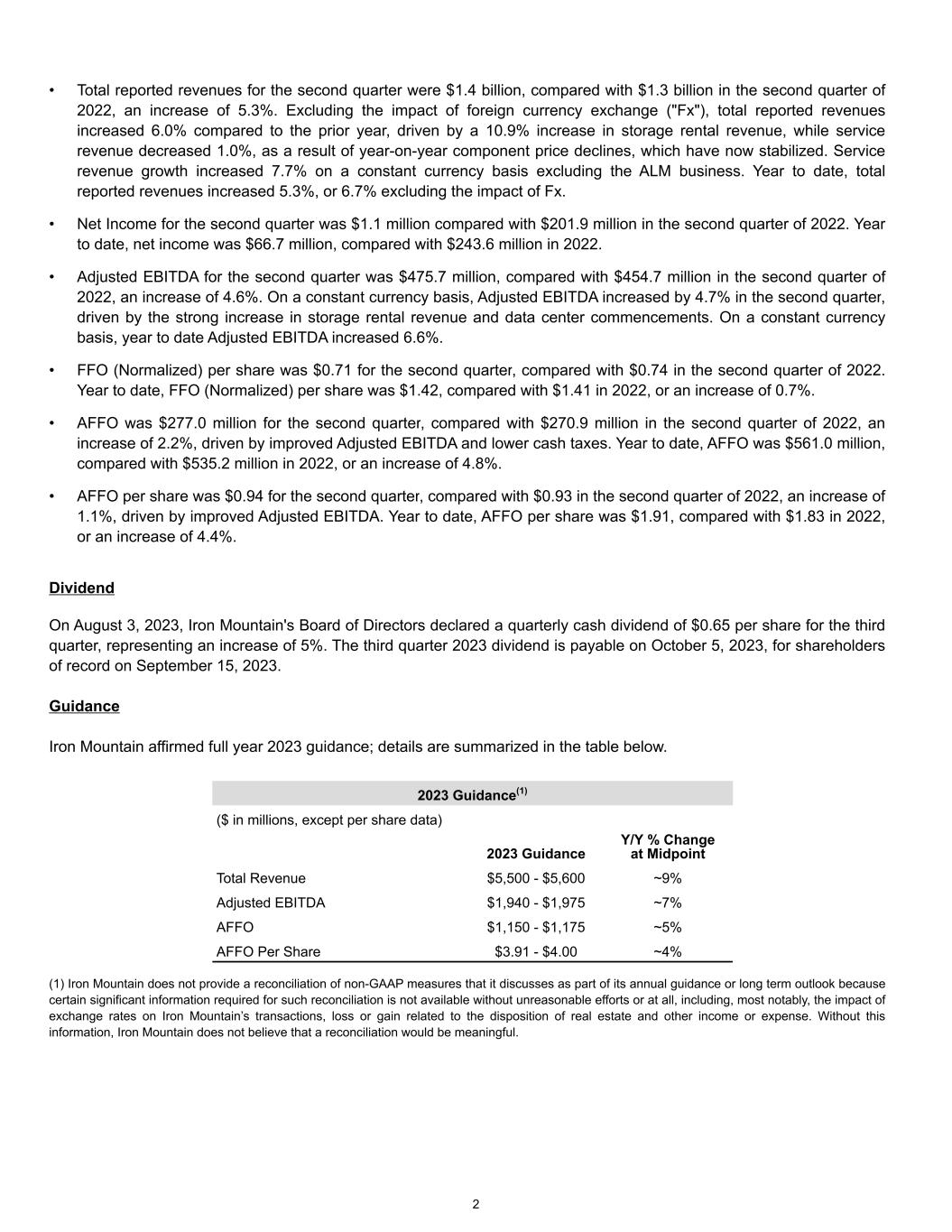 • Total reported revenues for the second quarter were $1.4 billion, compared with $1.3 billion in the second quarter of 2022, an increase of 5.3%. Excluding the impact of foreign currency exchange ("Fx"), total reported revenues increased 6.0% compared to the prior year, driven by a 10.9% increase in storage rental revenue, while service revenue decreased 1.0%, as a result of year-on-year component price declines, which have now stabilized. Service revenue growth increased 7.7% on a constant currency basis excluding the ALM business. Year to date, total reported revenues increased 5.3%, or 6.7% excluding the impact of Fx. • Net Income for the second quarter was $1.1 million compared with $201.9 million in the second quarter of 2022. Year to date, net income was $66.7 million, compared with $243.6 million in 2022. • Adjusted EBITDA for the second quarter was $475.7 million, compared with $454.7 million in the second quarter of 2022, an increase of 4.6%. On a constant currency basis, Adjusted EBITDA increased by 4.7% in the second quarter, driven by the strong increase in storage rental revenue and data center commencements. On a constant currency basis, year to date Adjusted EBITDA increased 6.6%. • FFO (Normalized) per share was $0.71 for the second quarter, compared with $0.74 in the second quarter of 2022. Year to date, FFO (Normalized) per share was $1.42, compared with $1.41 in 2022, or an increase of 0.7%. • AFFO was $277.0 million for the second quarter, compared with $270.9 million in the second quarter of 2022, an increase of 2.2%, driven by improved Adjusted EBITDA and lower cash taxes. Year to date, AFFO was $561.0 million, compared with $535.2 million in 2022, or an increase of 4.8%. • AFFO per share was $0.94 for the second quarter, compared with $0.93 in the second quarter of 2022, an increase of 1.1%, driven by improved Adjusted EBITDA. Year to date, AFFO per share was $1.91, compared with $1.83 in 2022, or an increase of 4.4%. Dividend On August 3, 2023, Iron Mountain's Board of Directors declared a quarterly cash dividend of $0.65 per share for the third quarter, representing an increase of 5%. The third quarter 2023 dividend is payable on October 5, 2023, for shareholders of record on September 15, 2023. Guidance Iron Mountain affirmed full year 2023 guidance; details are summarized in the table below. 2023 Guidance(1) ($ in millions, except per share data) 2023 Guidance Y/Y % Change at Midpoint Total Revenue $5,500 - $5,600 ~9% Adjusted EBITDA $1,940 - $1,975 ~7% AFFO $1,150 - $1,175 ~5% AFFO Per Share $3.91 - $4.00 ~4% (1) Iron Mountain does not provide a reconciliation of non-GAAP measures that it discusses as part of its annual guidance or long term outlook because certain significant information required for such reconciliation is not available without unreasonable efforts or at all, including, most notably, the impact of exchange rates on Iron Mountain’s transactions, loss or gain related to the disposition of real estate and other income or expense. Without this information, Iron Mountain does not believe that a reconciliation would be meaningful. 2