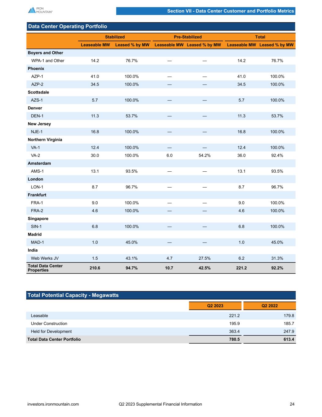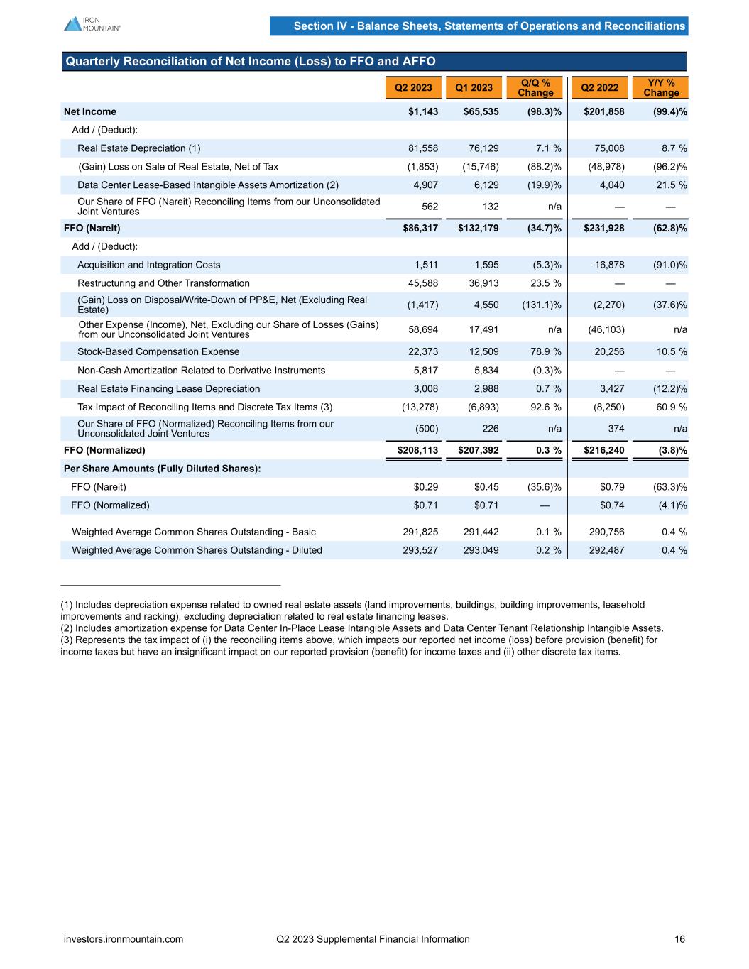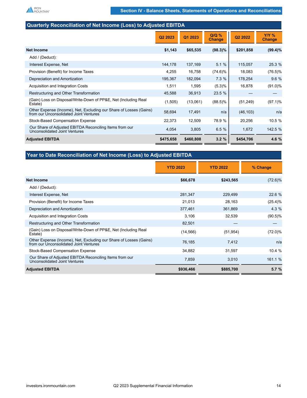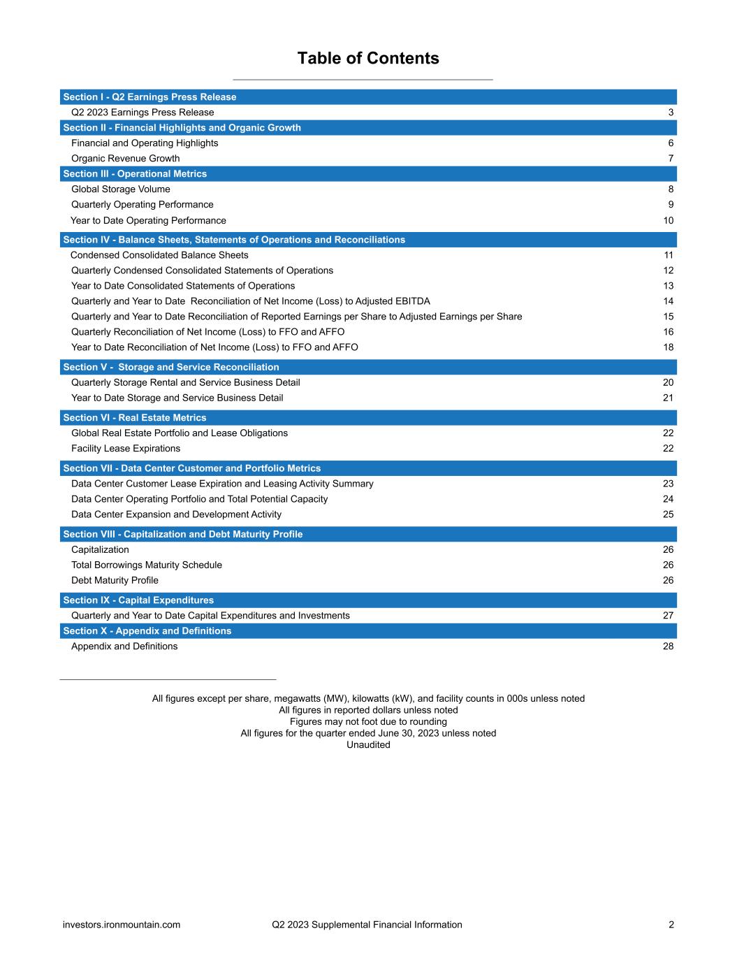 Quarterly Condensed Consolidated Statements of Operations (Unaudited; dollars in thousands, except per-share data) Q2 2023 Q1 2023 Q/Q % Change Q2 2022 Y/Y % Change Revenues: Storage Rental $830,756 $810,089 2.6 % $753,126 10.3 % Service 527,180 504,260 4.5 % 536,408 (1.7) % Total Revenues $1,357,936 $1,314,349 3.3 % $1,289,534 5.3 % Operating Expenses: Cost of Sales (excluding Depreciation and Amortization) $592,644 $571,626 3.7 % $556,476 6.5 % Selling, General and Administrative 311,805 294,520 5.9 % 295,394 5.6 % Depreciation and Amortization 195,367 182,094 7.3 % 178,254 9.6 % Acquisition and Integration Costs 1,511 1,595 (5.3) % 16,878 (91.0) % Restructuring and Other Transformation 45,588 36,913 23.5 % — — (Gain) Loss on Disposal/Write-Down of PP&E, Net (1,505) (13,061) (88.5) % (51,249) (97.1) % Total Operating Expenses $1,145,410 $1,073,687 6.7 % $995,753 15.0 % Operating Income (Loss) $212,526 $240,662 (11.7) % $293,781 (27.7) % Interest Expense, Net 144,178 137,169 5.1 % 115,057 25.3 % Other Expense (Income), Net 62,950 21,200 196.9 % (41,217) n/a Net Income (Loss) Before Provision (Benefit) for Income Taxes $5,398 $82,293 (93.4) % $219,941 (97.5) % Provision (Benefit) for Income Taxes 4,255 16,758 (74.6) % 18,083 (76.5) % Net Income (Loss) $1,143 $65,535 (98.3) % $201,858 (99.4) % Less: Net Income (Loss) Attributable to Noncontrolling Interests 1,029 940 9.5 % 1,777 (42.1) % Net Income (Loss) Attributable to Iron Mountain Incorporated $114 $64,595 (99.8) % $200,081 (99.9) % Net Income (Loss) Per Share Attributable to Iron Mountain Incorporated: Basic $0.00 $0.22 (100.0) % $0.69 (100.0) % Diluted $0.00 $0.22 (100.0) % $0.68 (100.0) % Weighted Average Common Shares Outstanding - Basic 291,825 291,442 0.1 % 290,756 0.4 % Weighted Average Common Shares Outstanding - Diluted 293,527 293,049 0.2 % 292,487 0.4 % 6