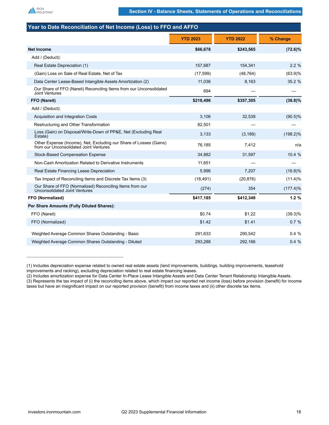 Quarterly Reconciliation of Reported Earnings per Share to Adjusted Earnings per Share Q2 2023 Q1 2023 Q/Q % Change Q2 2022 Y/Y % Change Reported EPS - Fully Diluted from Net Income (Loss) Attributable to Iron Mountain Incorporated $0.00 $0.22 (100.0) % $0.68 (100.0) % Add / (Deduct): Acquisition and Integration Costs 0.01 0.01 — 0.06 (83.3) % Restructuring and Other Transformation 0.16 0.13 23.1 % — — (Gain) Loss on Disposal/Write-Down of PP&E, Net (0.01) (0.04) (75.0) % (0.18) (94.4) Other Expense (Income), Net, Excluding our Share of Losses (Gains) from our Unconsolidated Joint Ventures 0.20 0.06 n/a (0.16) n/a Stock-Based Compensation Expense 0.08 0.04 100.0 % 0.07 14.3 % Non-Cash Amortization Related to Derivative Instruments 0.02 0.02 — — — Tax Impact of Reconciling Items and Discrete Tax Items (1) (0.05) (0.02) 150.0 % (0.03) 66.7 % Net Income Attributable to Noncontrolling Interests — — — 0.01 (100.0) % Adjusted EPS - Fully Diluted from Net Income (Loss) Attributable to Iron Mountain Incorporated $0.40 $0.42 (4.8) % $0.46 (13.0) % (1) The difference between our effective tax rates and our structural tax rate (or adjusted effective tax rates) for the three months ended June 30, 2023 and 2022 is primarily due to (i) the reconciling items above, which impact our reported net income (loss) before provision (benefit) for income taxes but have an insignificant impact on our reported provision (benefit) for income taxes and (ii) other discrete tax items. Our structural tax rate for purposes of the calculation of Adjusted EPS for the quarters ended June 30, 2023 and 2022 was 14.0% and 16.5%, respectively, and quarter ended March 31, 2023 was 15.2%. The Tax Impact of Reconciling Items and Discrete Tax Items is calculated using the current quarter’s estimate of the annual structural tax rate. This may result in the current period adjustment plus prior reported quarterly adjustments not summing to the year to date adjustment. Adjusted Earnings Per Share, or Adjusted EPS We define Adjusted EPS as reported earnings per share fully diluted from net income (loss) attributable to Iron Mountain Incorporated (inclusive of our share of adjusted losses (gains) from our unconsolidated joint ventures) and excluding certain items, specifically: (i) Acquisition and Integration Costs; (ii) Restructuring and other transformation; (iii) Amortization related to the write-off of certain customer relationship intangible assets; (iv) (Gain) loss on disposal/write-down of property, plant and equipment, net (including real estate); (v) Other expense (income), net; (vi) Stock-based compensation expense; (vii) Non-cash amortization related to derivative instruments and (viii) Tax impact of reconciling items and discrete tax items. We do not believe these excluded items to be indicative of our ongoing operating results, and they are not considered when we are forecasting our future results. We believe Adjusted EPS is of value to our current and potential investors when comparing our results from past, present and future periods. Figures may not foot due to rounding. 10