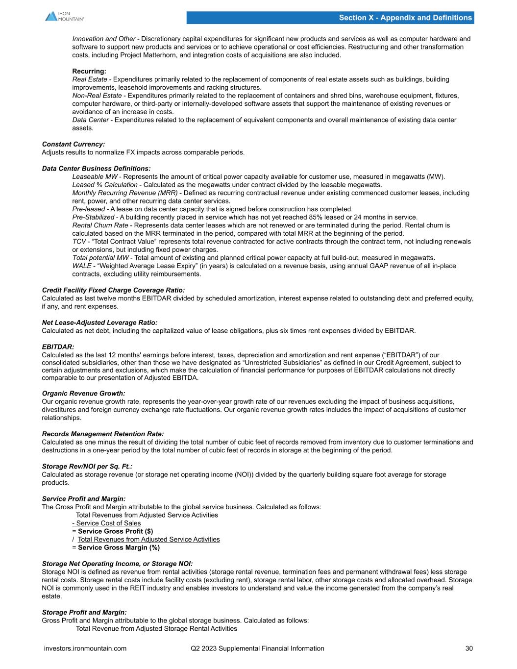 Forward Looking Statements We have made statements in this press release that constitute "forward-looking statements" as that term is defined in the Private Securities Litigation Reform Act of 1995 and other securities laws. These forward-looking statements concern our current expectations regarding our future results from operations, economic performance, financial condition, goals, strategies, investment objectives, plans and achievements. These forward-looking statements are subject to various known and unknown risks, uncertainties and other factors, and you should not rely upon them except as statements of our present intentions and of our present expectations, which may or may not occur. When we use words such as “believes”, “expects”, “anticipates”, “estimates”, “plans”, “intends”, “pursue”, “will” or similar expressions, we are making forward-looking statements. Although we believe that our forward- looking statements are based on reasonable assumptions, our expected results may not be achieved, and actual results may differ materially from our expectations. In addition, important factors that could cause actual results to differ from expectations include, among others: (i) our ability or inability to execute our strategic growth plan, including our ability to invest according to plan, grow our businesses (including through joint ventures), incorporate alternative technologies into our offerings, achieve satisfactory returns on new product offerings, continue our revenue management, expand and manage our global operations, complete acquisitions on satisfactory terms, integrate acquired companies efficiently and transition to more sustainable sources of energy; (ii) changes in customer preferences and demand for our storage and information management services, including as a result of the shift from paper and tape storage to alternative technologies that require less physical space; (iii) the impact of our distribution requirements on our ability to execute our business plan; (iv) the costs of complying with and our ability to comply with laws, regulations and customer requirements, including those relating to data privacy and cybersecurity issues, as well as fire and safety and environmental standards; (v) the impact of attacks on our internal information technology (“IT”) systems, including the impact of such incidents on our reputation and ability to compete and any litigation or disputes that may arise in connection with such incidents; (vi) our ability to fund capital expenditures; (vii) our ability to remain qualified for taxation as a real estate investment trust for United States federal income tax purposes (“REIT”); (viii) changes in the political and economic environments in the countries in which we operate and changes in the global political climate; (ix) our ability to raise debt or equity capital and changes in the cost of our debt; (x) our ability to comply with our existing debt obligations and restrictions in our debt instruments; (xi) the impact of service interruptions or equipment damage and the cost of power on our data center operations; (xii) the cost or potential liabilities associated with real estate necessary for our business; (xiii) unexpected events, including those resulting from climate change or geopolitical events, could disrupt our operations and adversely affect our reputation and results of operations; (xiv) failures to implement and manage new IT systems; (xv) other trends in competitive or economic conditions affecting our financial condition or results of operations not presently contemplated; and (xvi) the other risks described in our periodic reports filed with the SEC, including under the caption “Risk Factors” in Part I, Item 1A of our Annual Report. Except as required by law, we undertake no obligation to update any forward-looking statements appearing in this release. Reconciliation of Non-GAAP Measures Throughout this release, Iron Mountain discusses (1) Adjusted EBITDA, (2) Adjusted EPS, (3) FFO (Nareit), (4) FFO (Normalized), and (5) AFFO. These measures do not conform to accounting principles generally accepted in the United States (“GAAP”). These non-GAAP measures are supplemental metrics designed to enhance our disclosure and to provide additional information that we believe to be important for investors to consider in addition to, but not as a substitute for, other measures of financial performance reported in accordance with GAAP, such as operating income, net income (loss) attributable to Iron Mountain Incorporated or cash flows from operating activities (as determined in accordance with GAAP). The reconciliation of these measures to the appropriate GAAP measure, as required by Regulation G under the Securities Exchange Act of 1934, as amended, and their definitions are included later in this release. 4