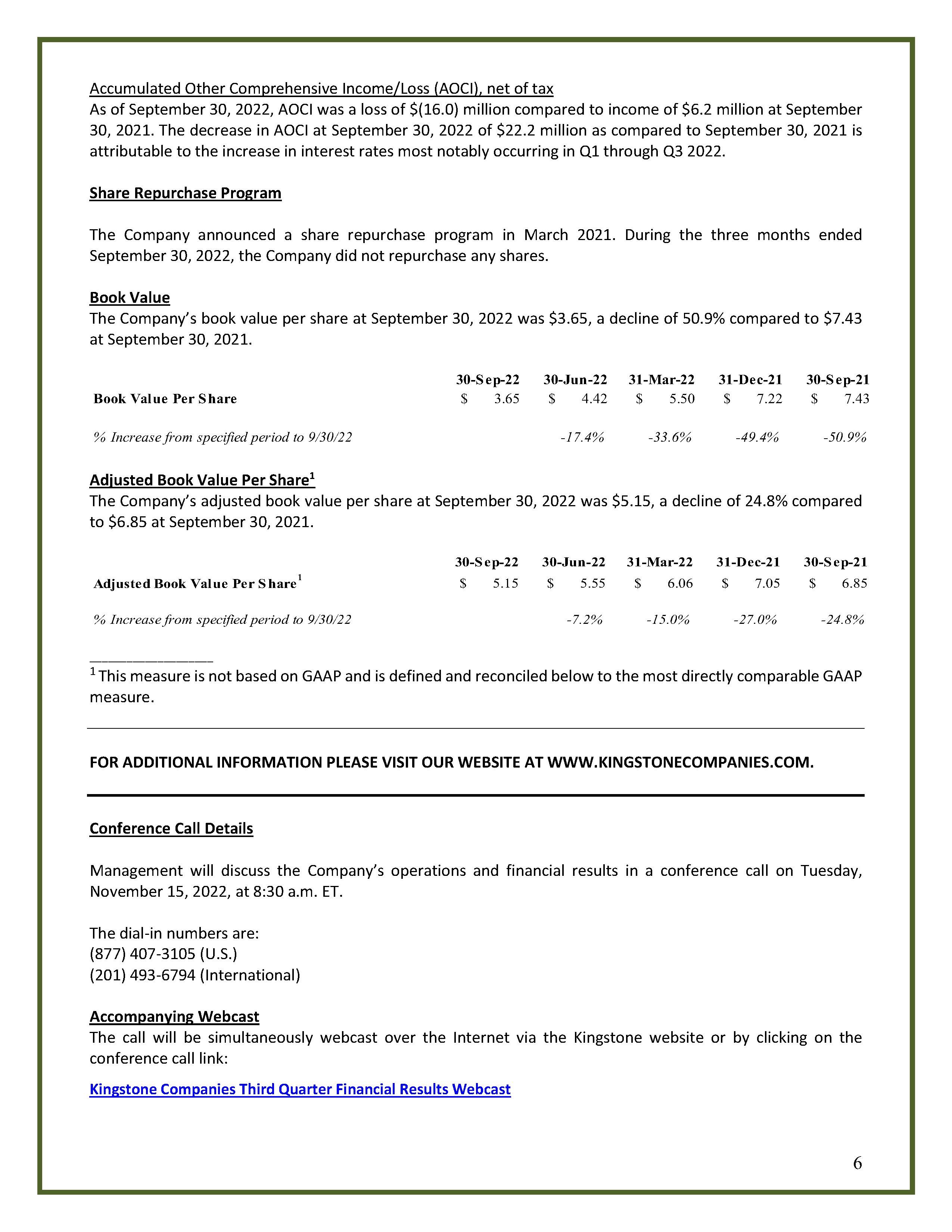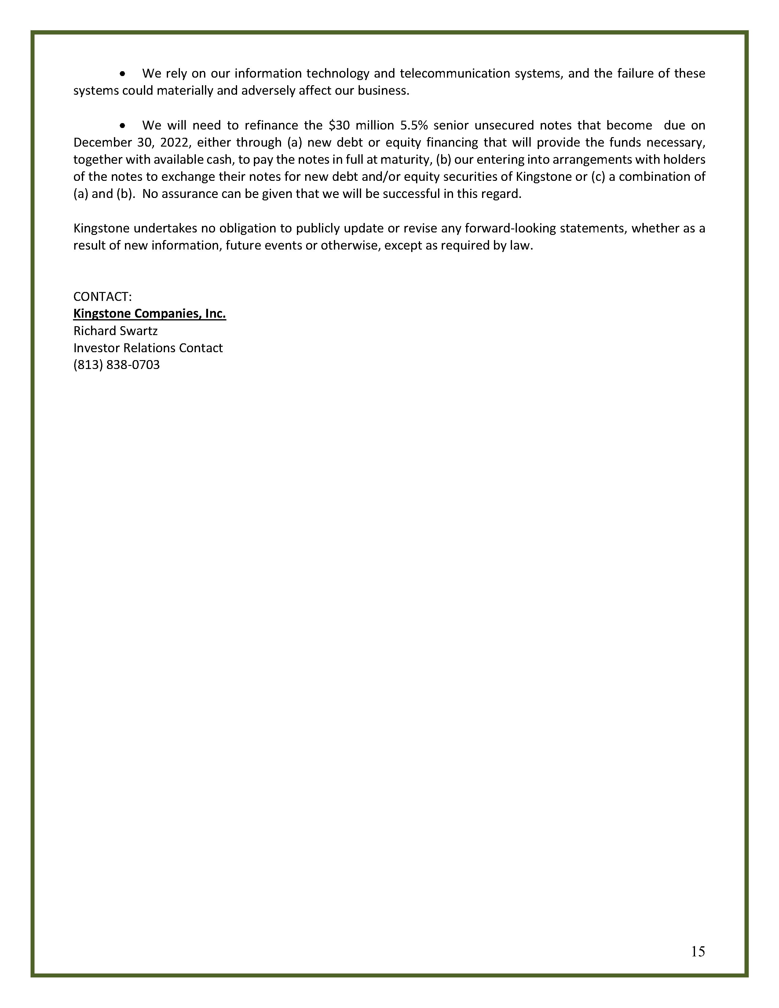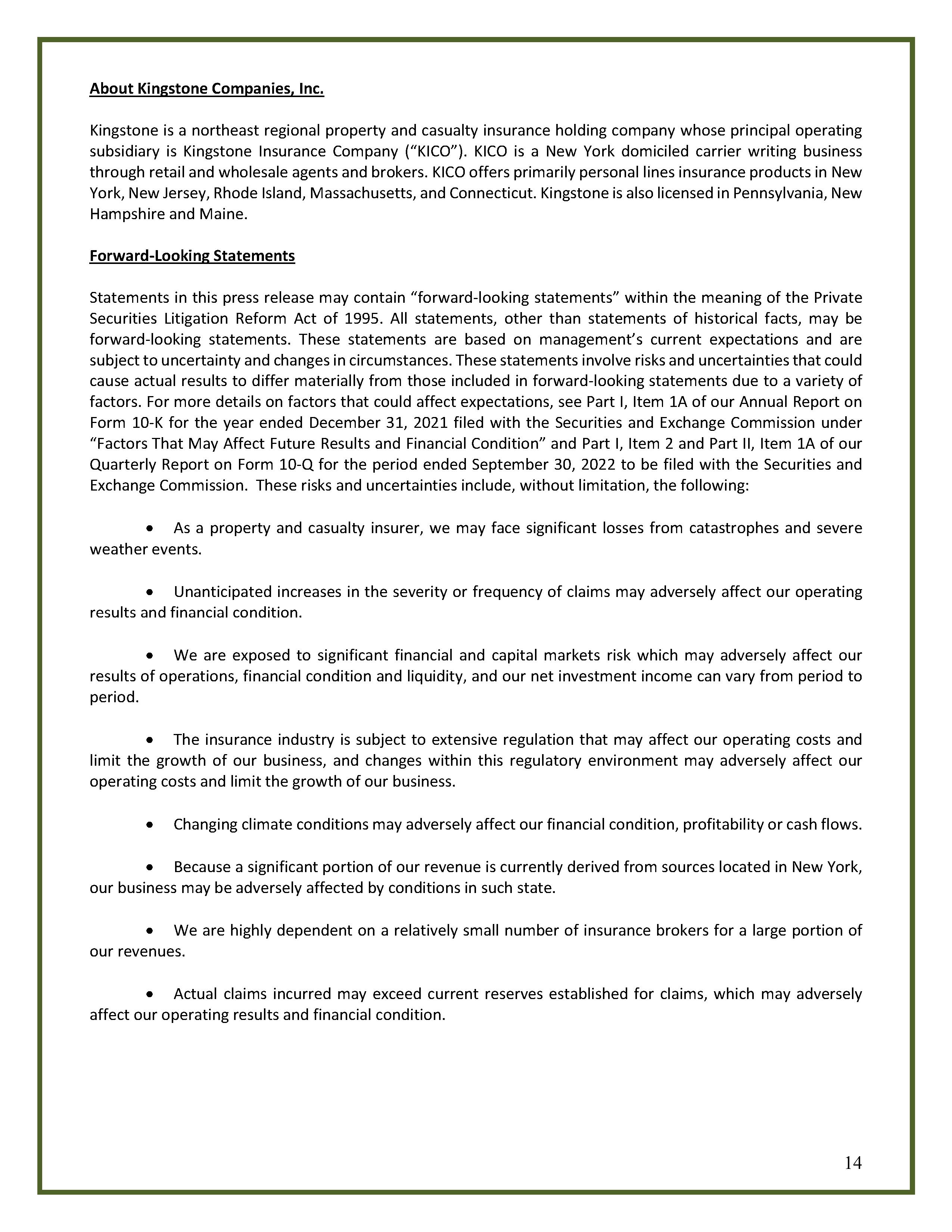 Press release, dated November 14, 2022, issued by Kingstone Companies, Inc.