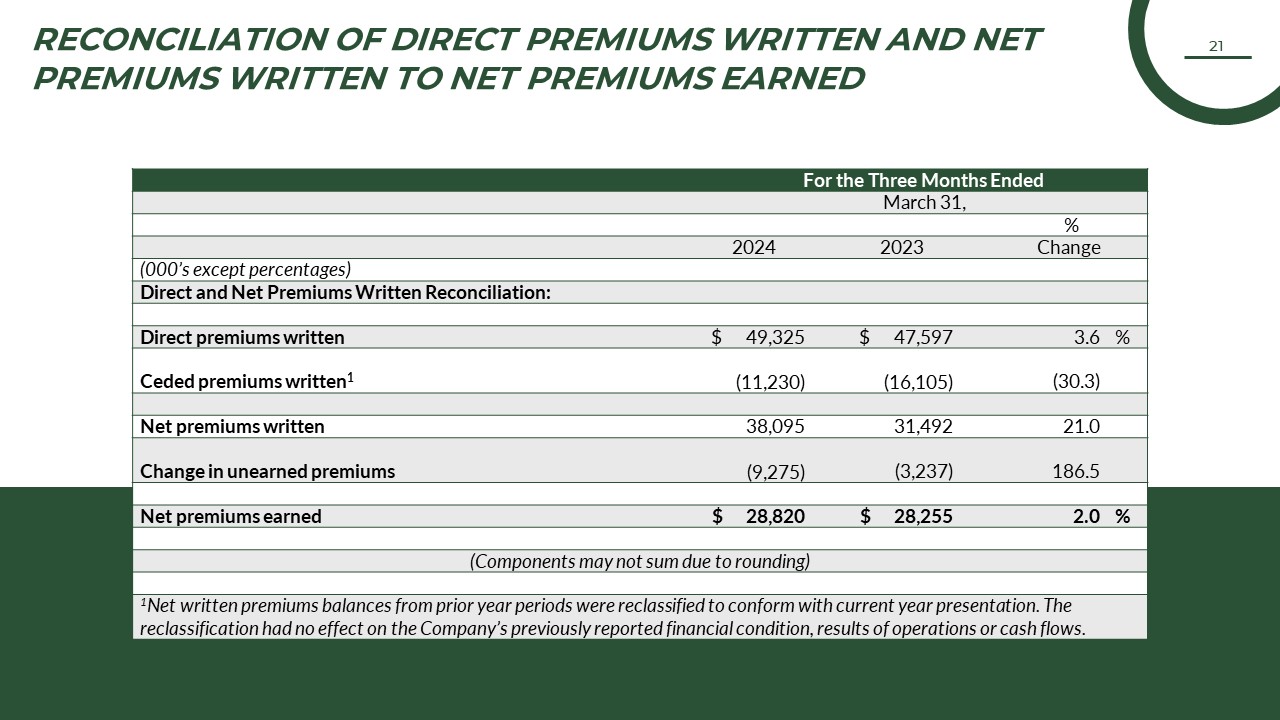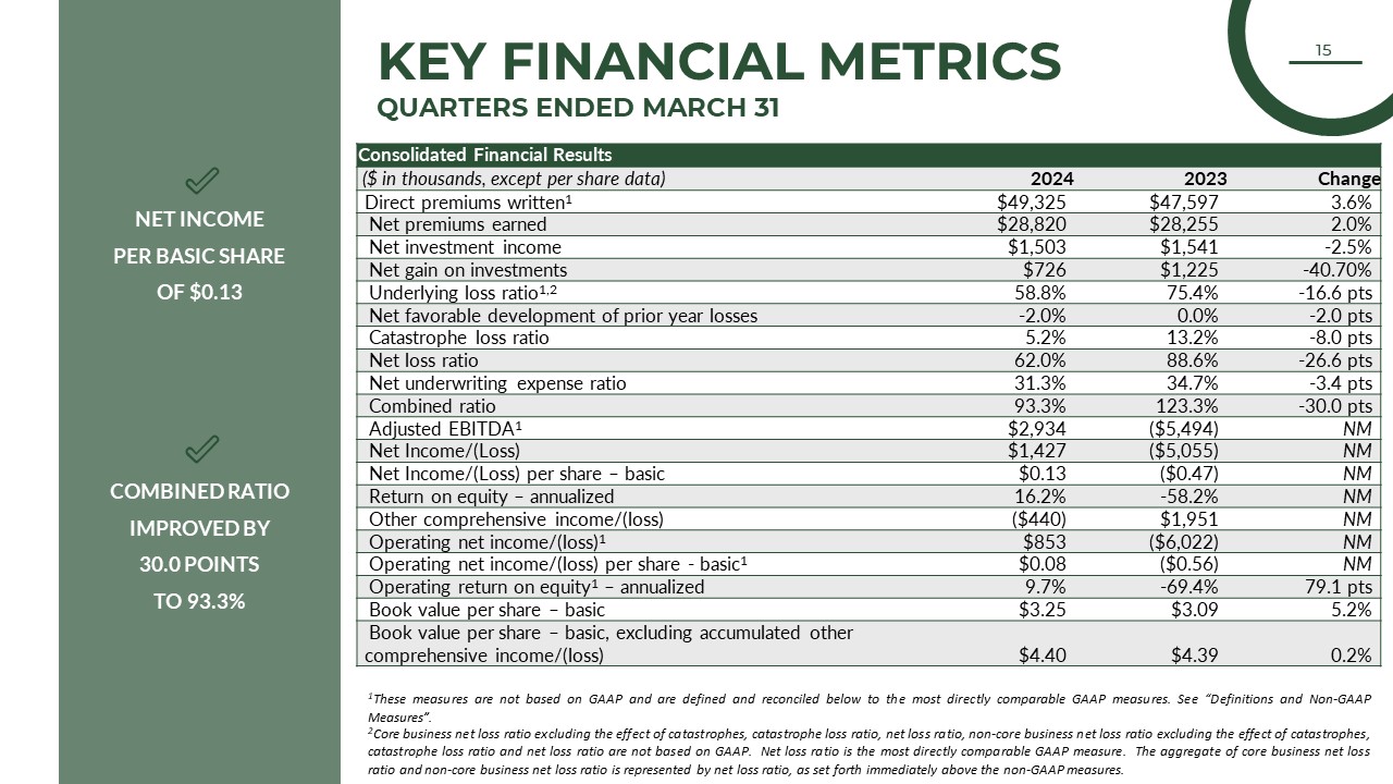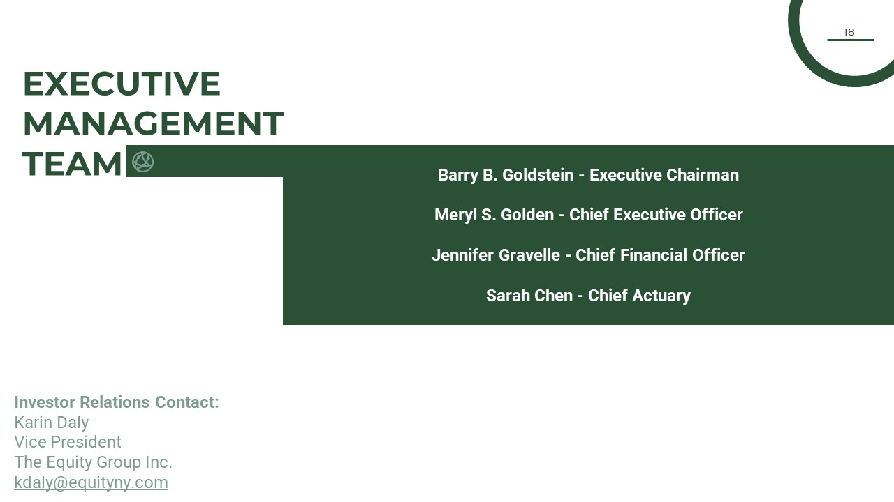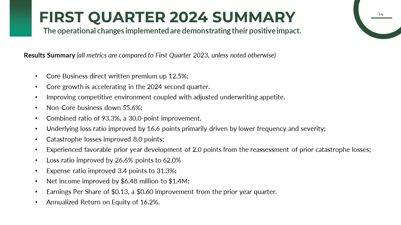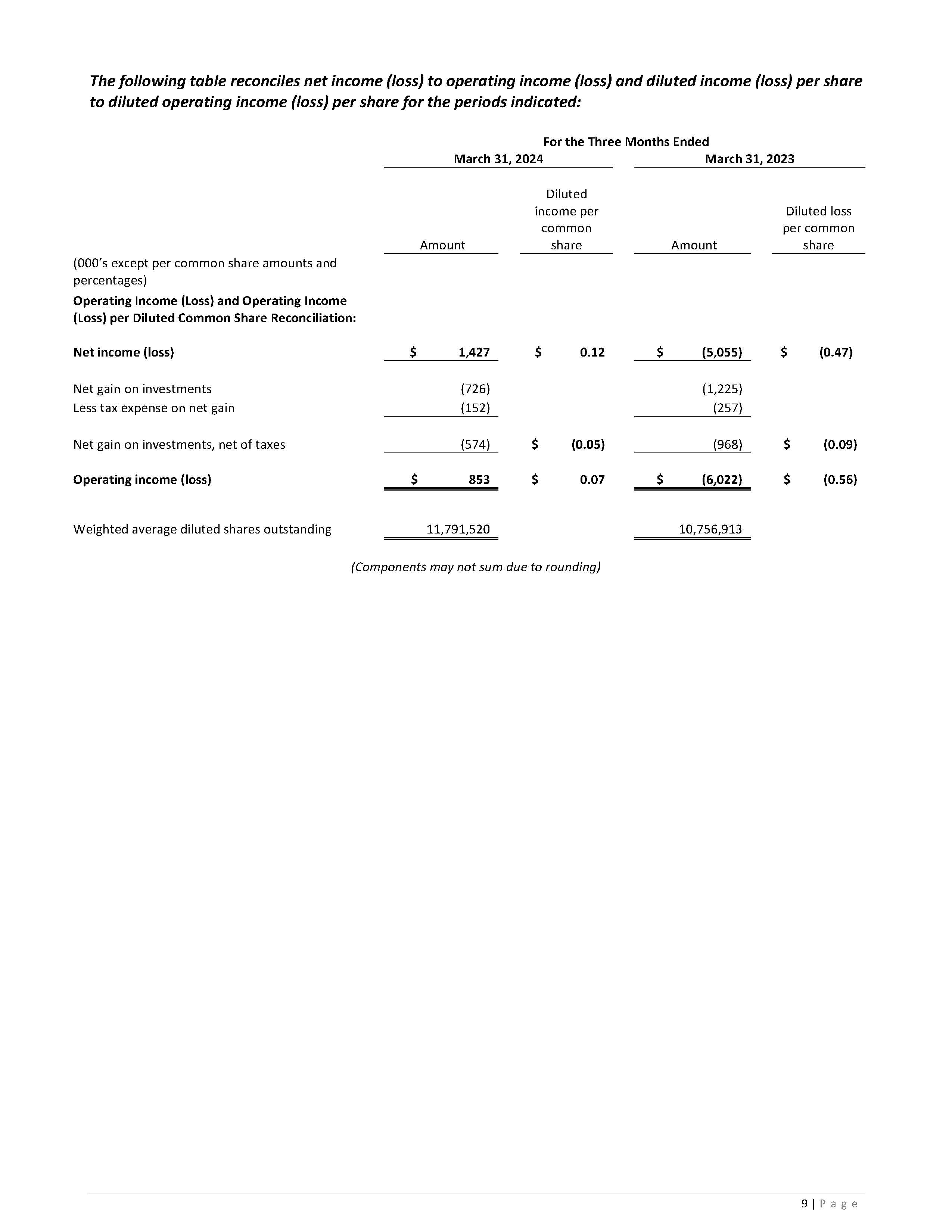 for the first quarter ended March 31, 2024 (the “Press Release”). The Press Release also announced that the Company will hold a conference call for analysts and investors on May 14, 2024 at 8:30 A.M. ET. (the “Conference Call”), as previously