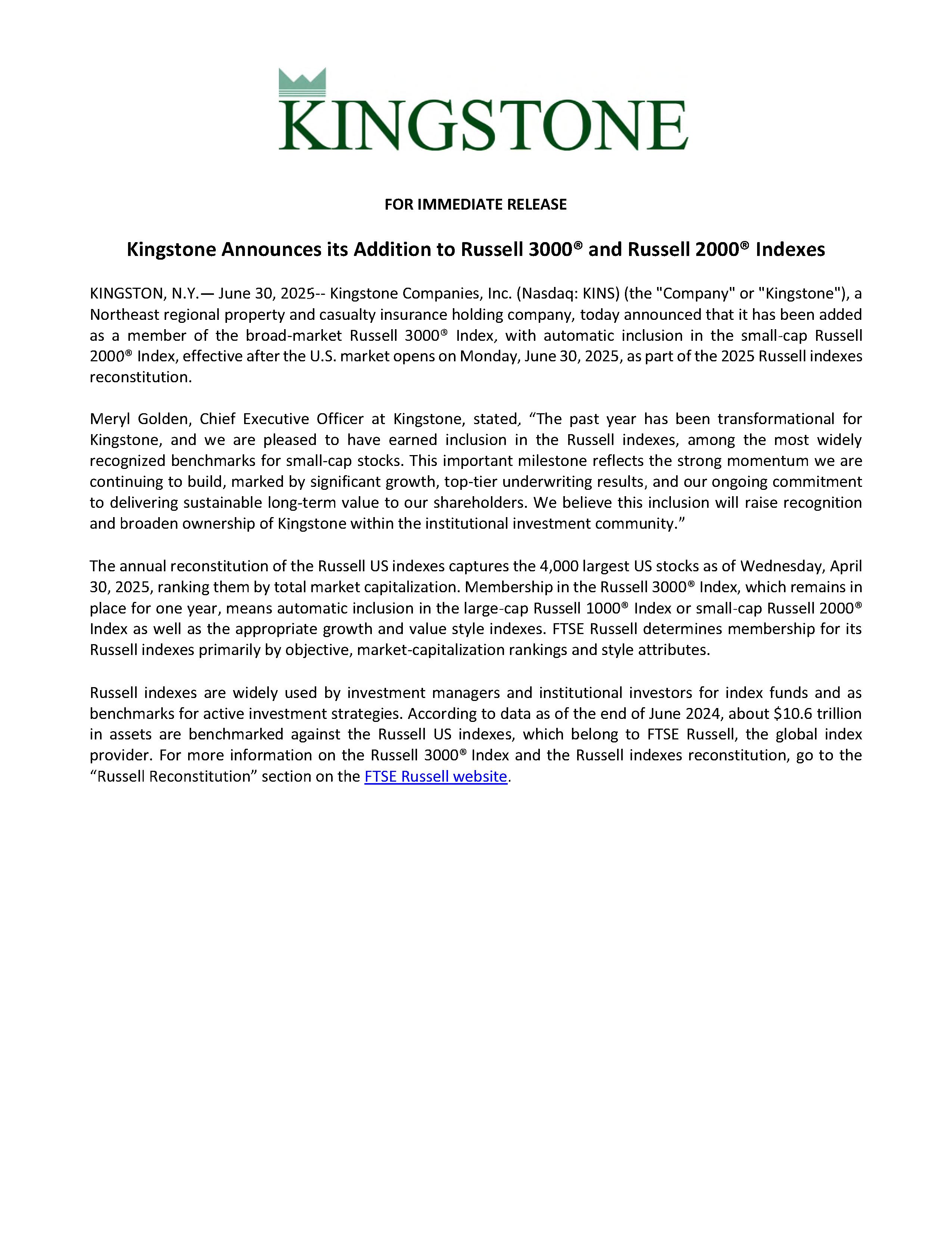 Press release, dated June 30, 2025, issued by Kingstone Companies, Inc.