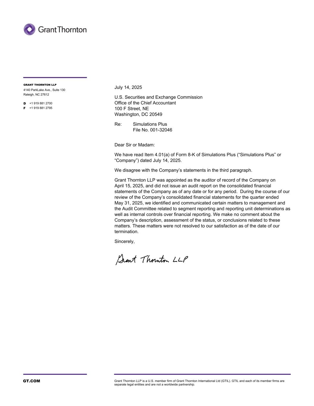 GT.COM Grant Thornton LLP is a U.S. member firm of Grant Thornton International Ltd (GTIL). GTIL and each of its member firms are separate legal entities and are not a worldwide partnership. July 14, 2025 U.S. Securities and Exchange Commission Office of the Chief Accountant 100 F Street, NE Washington, DC 20549 Re: Simulations Plus File No. 001-32046 Dear Sir or Madam: We have read Item 4.01(a) of Form 8-K of Simulations Plus (“Simulations Plus” or “Company”) dated July 14, 2025. We disagree with the Company’s statements in the third paragraph. Grant Thornton LLP was appointed as the auditor of record of the Company on April 15, 2025, and did not issue an audit report on the consolidated financial statements of the Company as of any date or for any period. During the course of our review of the Company’s consolidated financial statements for the quarter ended May 31, 2025, we identified and communicated certain matters to management and the Audit Committee related to segment reporting and reporting unit determinations as well as internal controls over financial reporting. We make no comment about the Company’s description, assessment of the status, or conclusions related to these matters. These matters were not resolved to our satisfaction as of the date of our termination. Sincerely, GRANT THORNTON LLP 4140 ParkLake Ave., Suite 130 Raleigh, NC 27612 D +1 919 881 2700 F +1 919 881 2795
