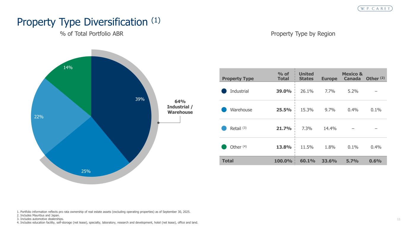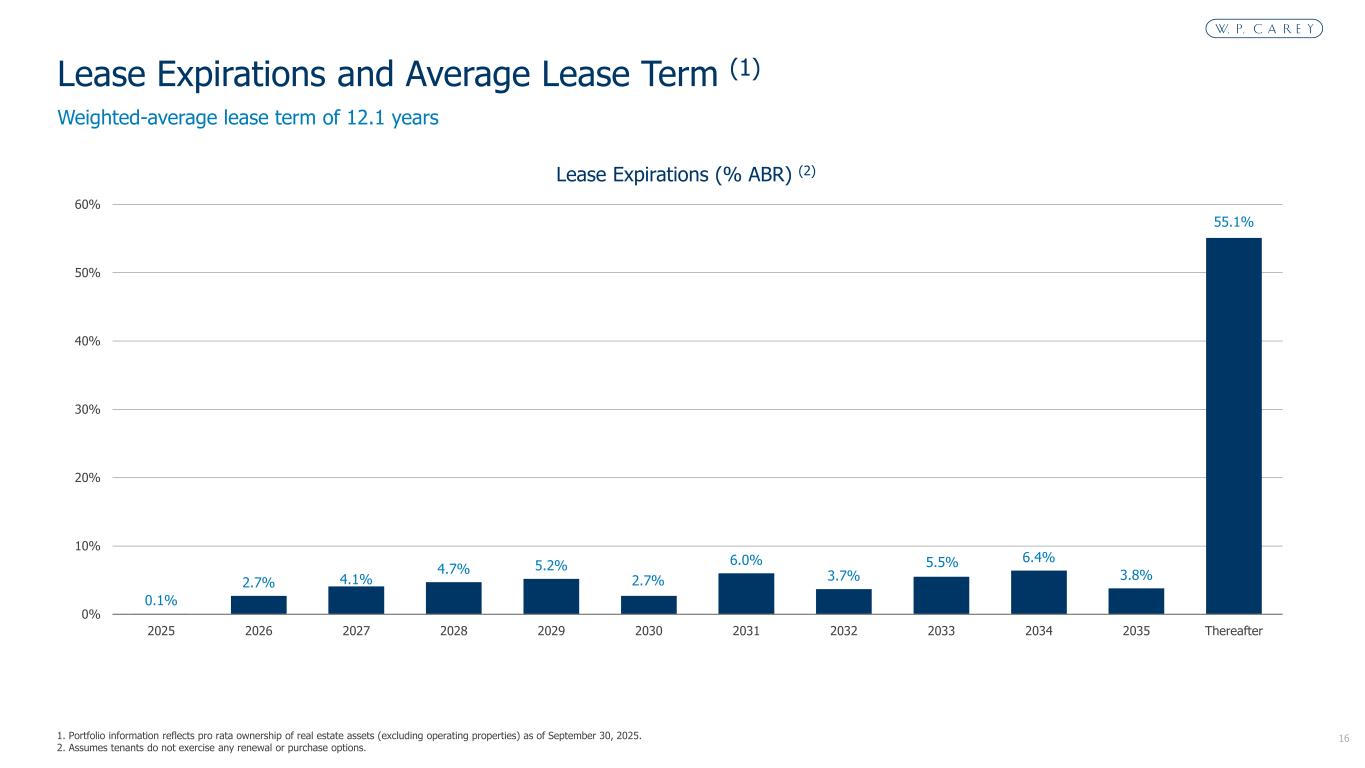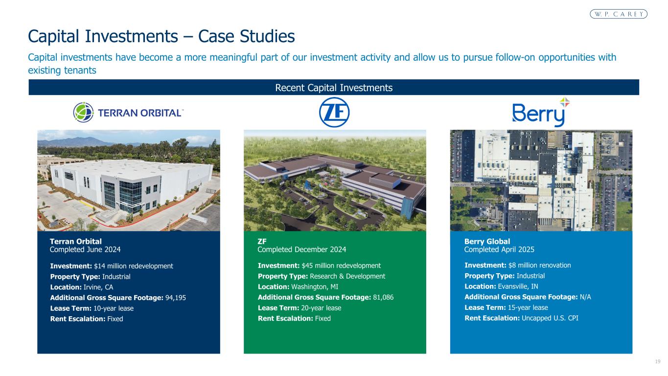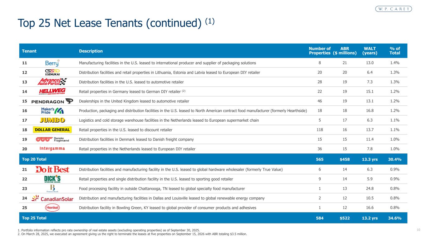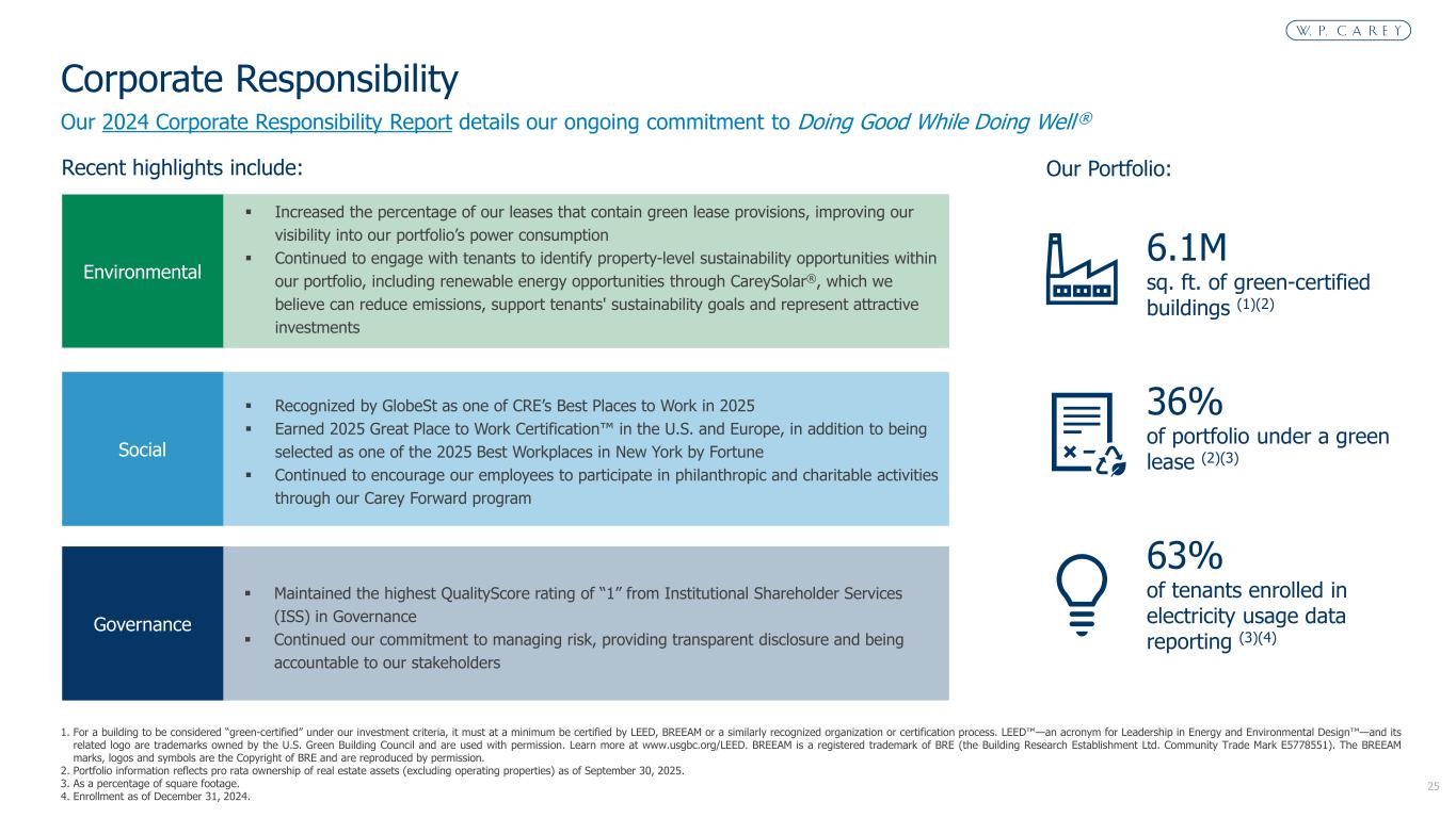 ニューヨーク州ニューヨーク - 2025 年 10 月 28 日 - ネットリース不動産投資信託の W. P. Carey Inc. (NYSE: WPC) (W. P. Carey または当社)は本日、2025 年 9 月 30 日に終了した第 3 四半期の決算を発表した。