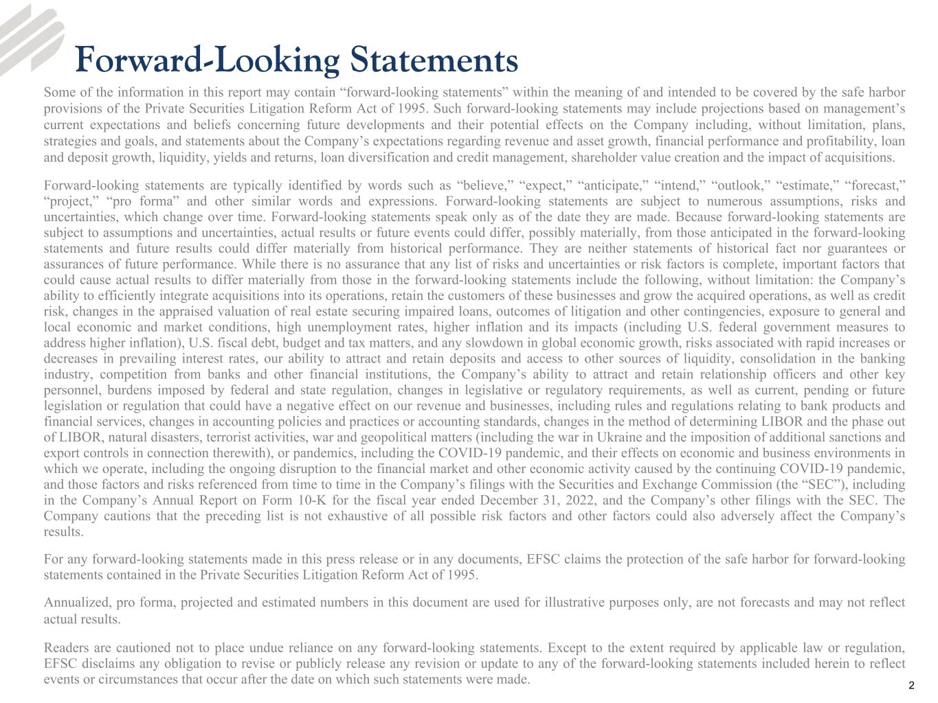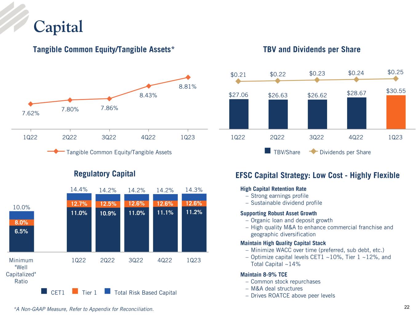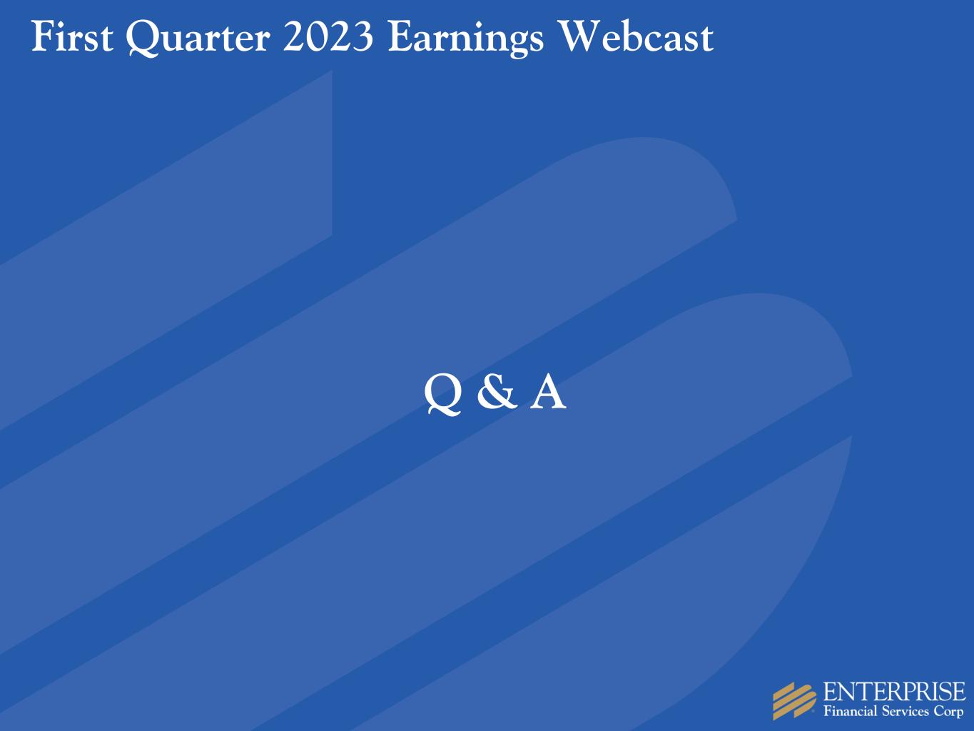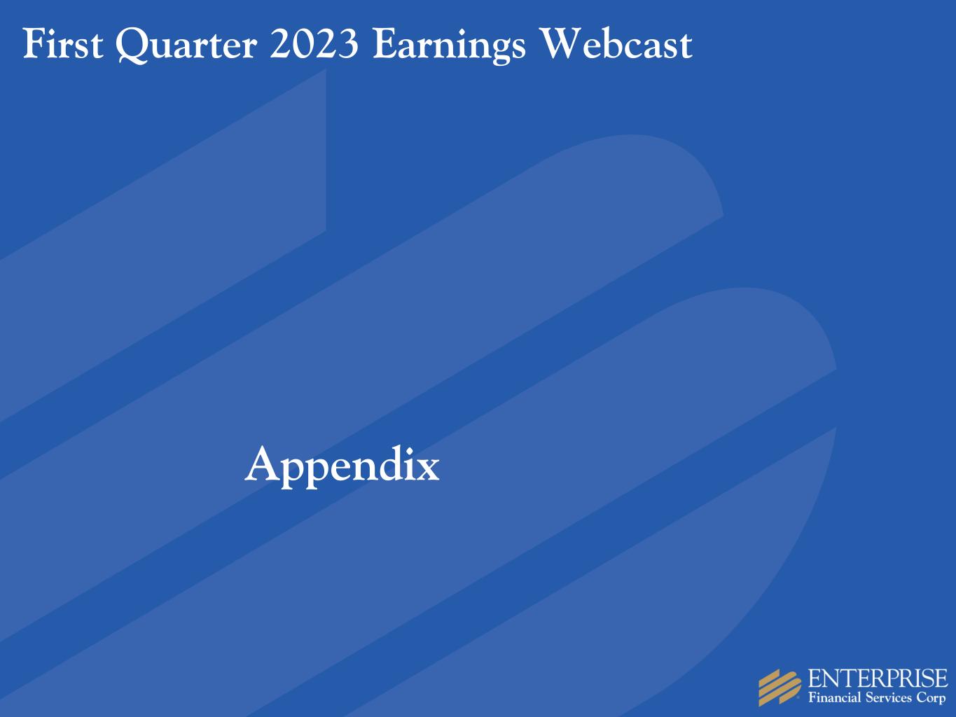 •Capital - Total shareholders’ equity was $1.6 billion and the tangible common equity to tangible assets ratio was 8.8% at March 31, 2023, compared to 8.4% at December 31, 2022. The tangible common equity to tangible assets ratio, adjusted for unrealized losses on held-to-maturity securities,3 was 8.4% at March 31, 2023 and 7.9% at December 31, 2022. Enterprise Bank & Trust remains “well-capitalized,” with a common equity tier 1 ratio of 12.0% and a total risk-based capital ratio of 13.1% as of March 31, 2023. The Company’s common equity tier 1 ratio and total risk-based capital ratio was 11.2% and 14.3%, respectively, at March 31, 2023.