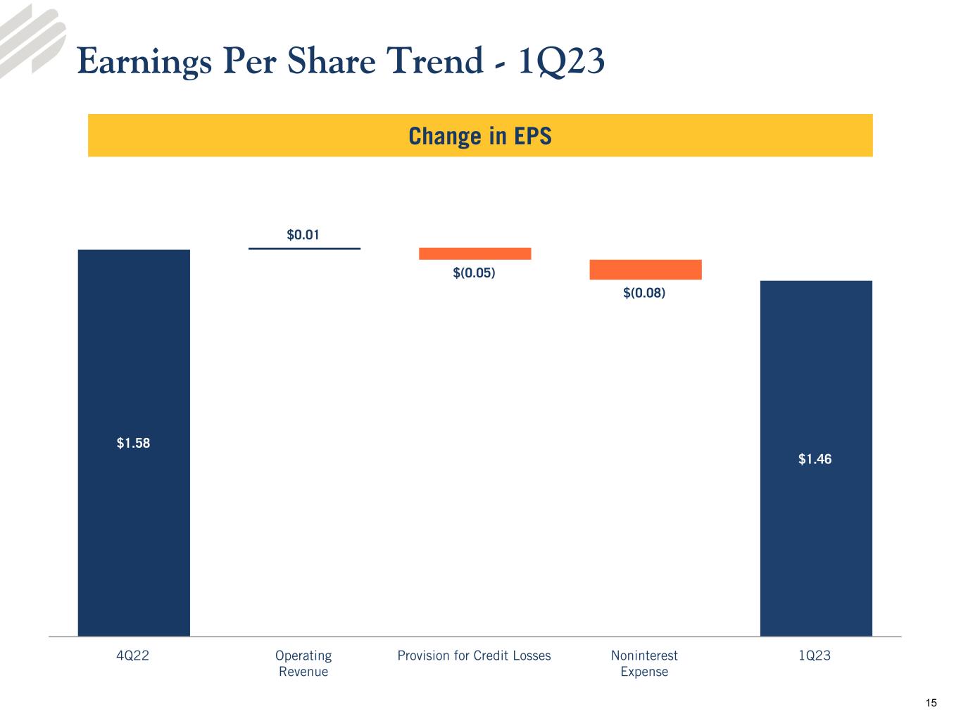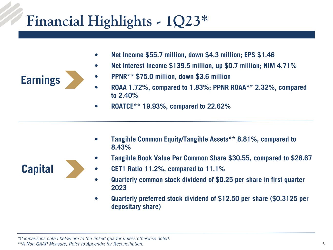 •Earnings - Net income in the first quarter 2023 was $55.7 million, a decrease of $4.3 million compared to the linked quarter and an increase of $8.0 million from the prior year quarter. Earnings per share (“EPS”) was $1.46 per diluted common share for the first quarter 2023, compared to $1.58 and $1.23 per diluted common share for the linked and prior year quarters, respectively.