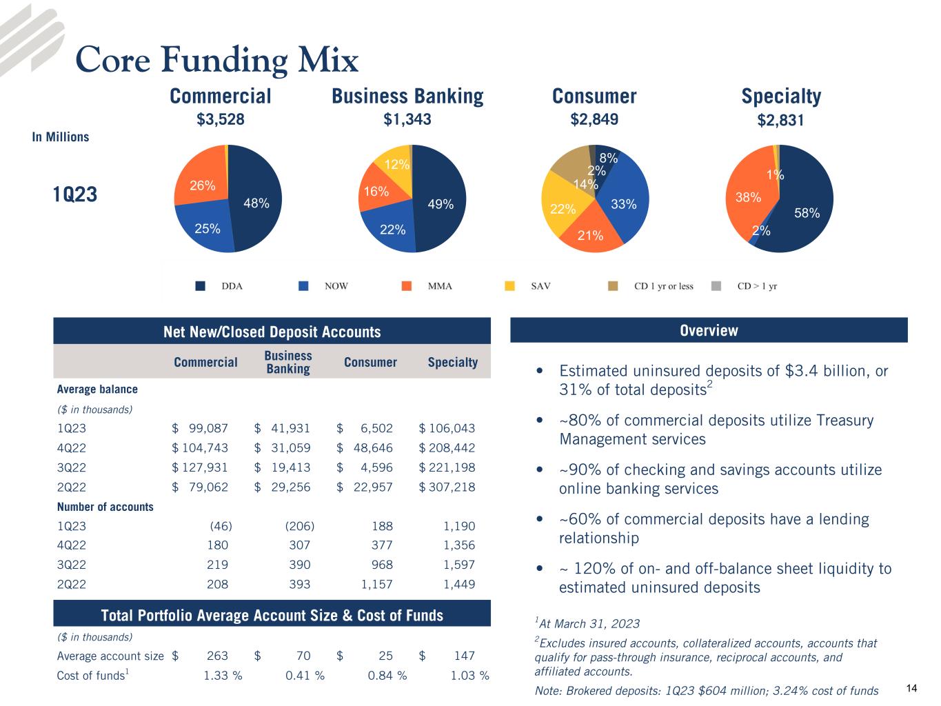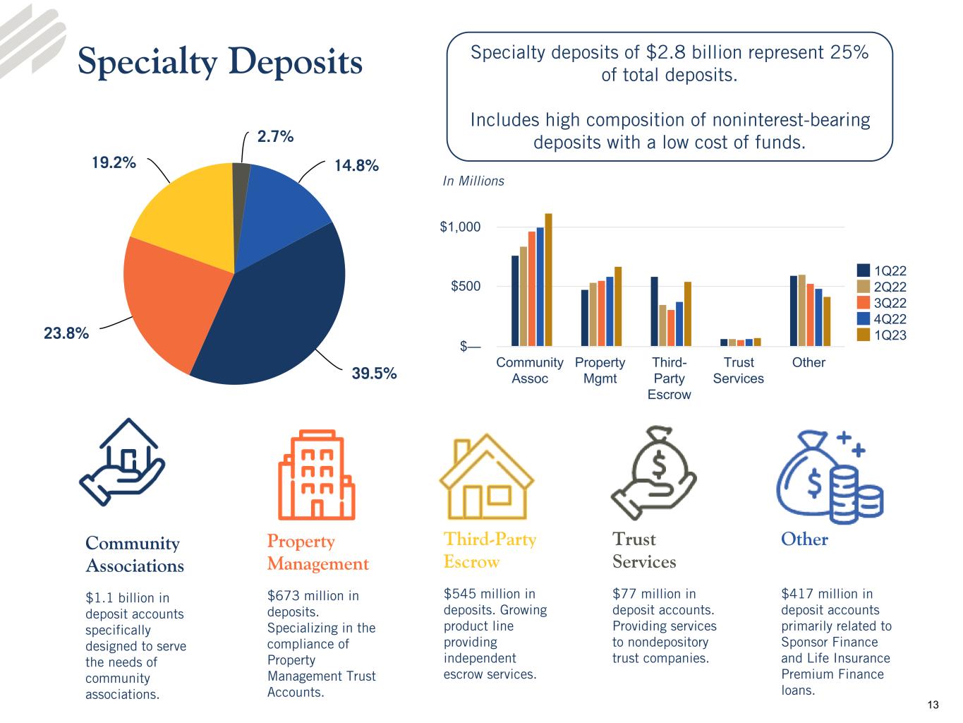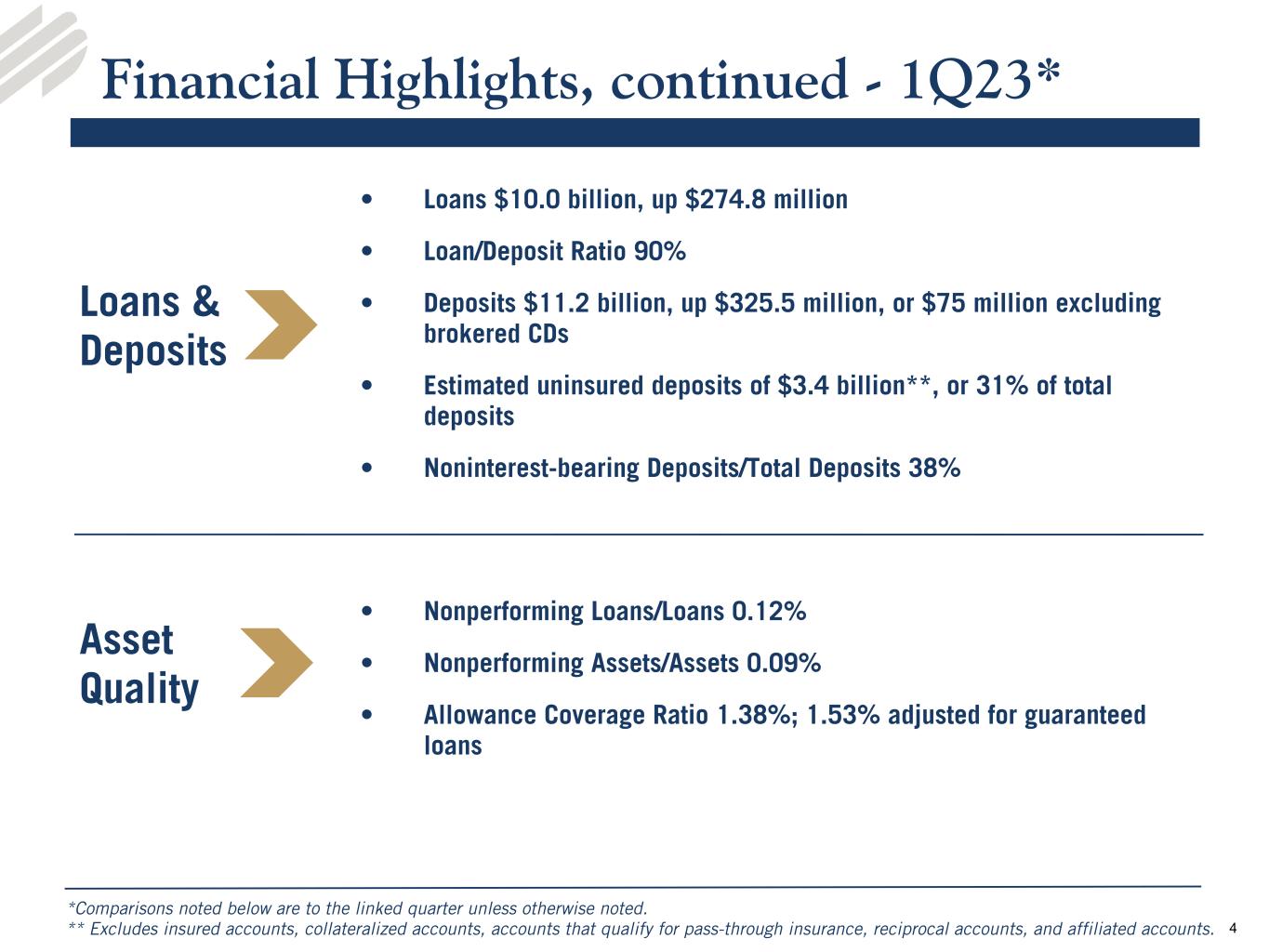•Deposits - Total deposits increased $325.5 million from the linked quarter to $11.2 billion as of March 31, 2023. Total estimated insured deposits, which includes collateralized deposits and accounts that qualify for pass through insurance, totaled $7.7 billion at March 31, 2023. Average deposits totaled $10.9 billion for the quarter ended March 31, 2023 compared to $11.0 billion and $11.5 billion for the linked and prior year quarters, respectively. At March 31, 2023, noninterest-bearing deposit accounts represented 37.6% of total deposits, and the loan to deposit ratio was 89.8%.
