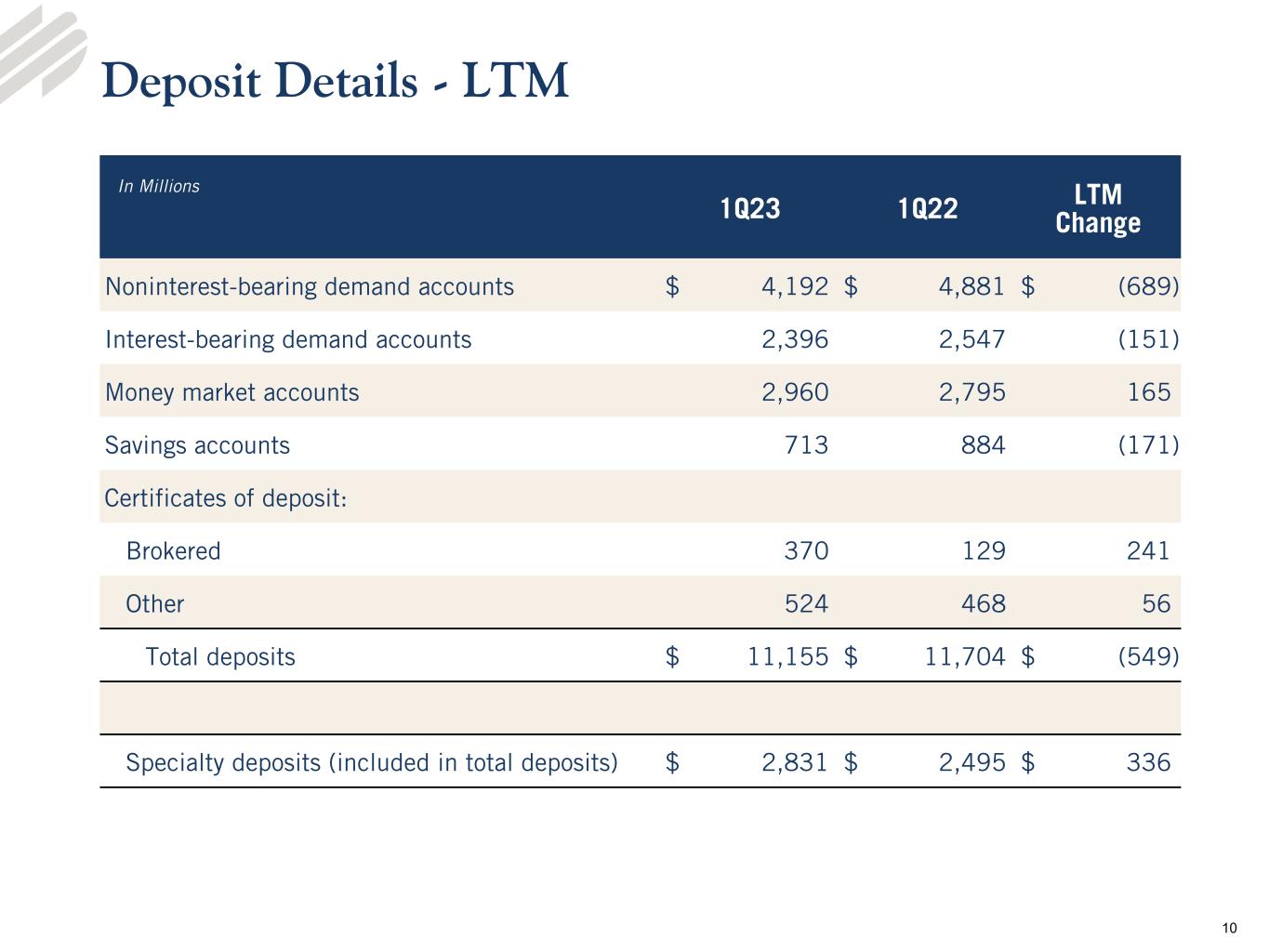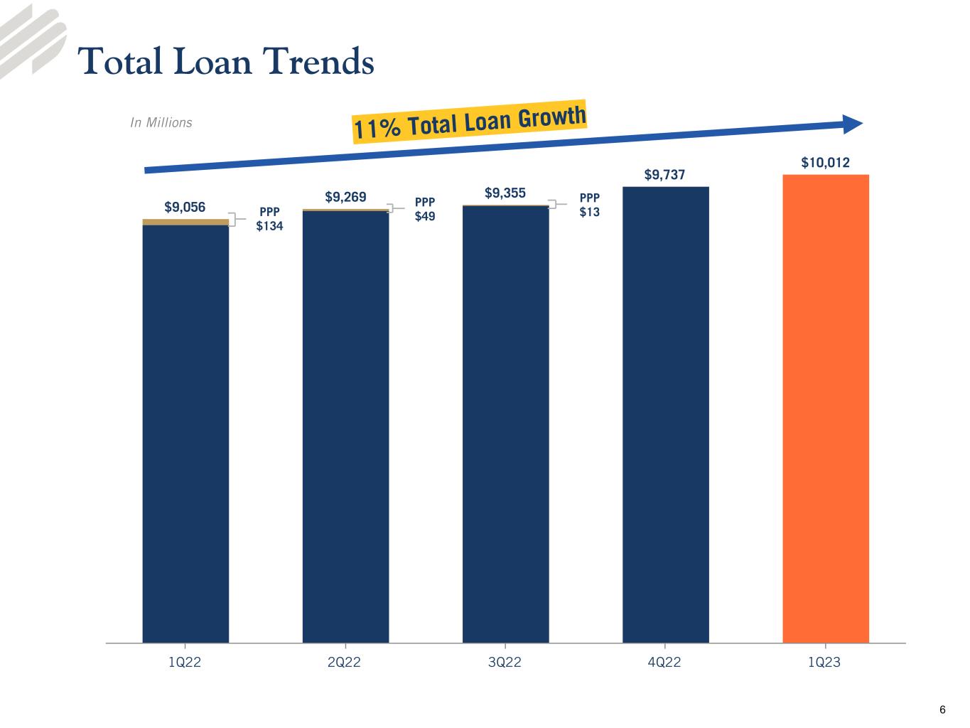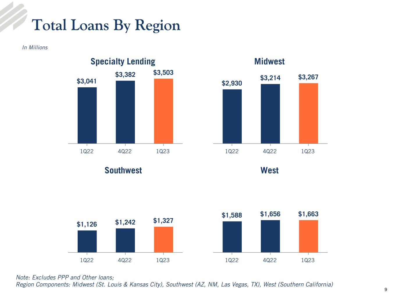 •Loans - Loans totaled $10.0 billion at March 31, 2023, an increase of $274.8 million, or 11.4% on an annualized basis, from the linked quarter and an increase of $955.8 million from the prior year period. Average loans totaled $9.8 billion for the quarter ended March 31, 2023, compared to $9.4 billion and $9.0 billion for the linked and prior year quarters, respectively.