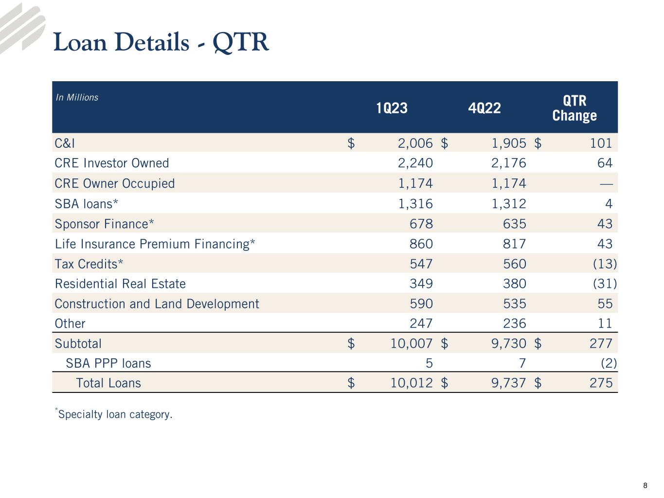 •Total loans of $10.0 billion, quarterly increase of $274.8 million